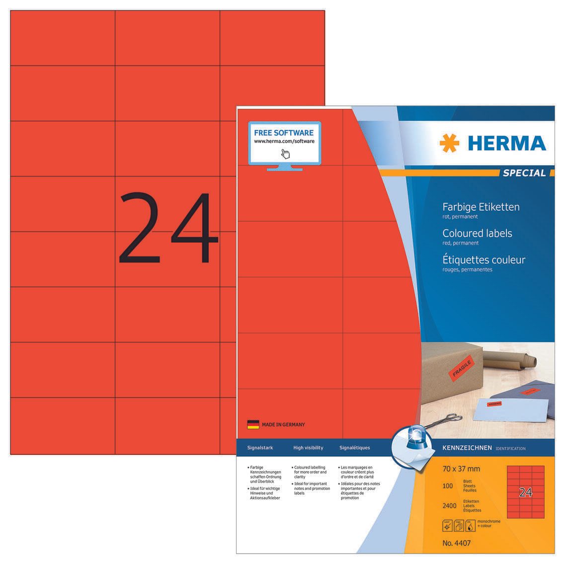 In einer Packung sind insgesamt 2400 Etiketten enthalten, verteilt auf 100 Blatt. Die Etiketten haben keine abgerundeten Ecken und sind ohne Rand gefertigt. Sie sind nicht ablösbar und besitzen keine Ablösehilfe. Die Etiketten sind blickdurchlässig, was bei der Verwendung zu beachten ist. Hersteller der Etiketten ist die HERMA GmbH mit Sitz in Filderstadt, Deutschland.