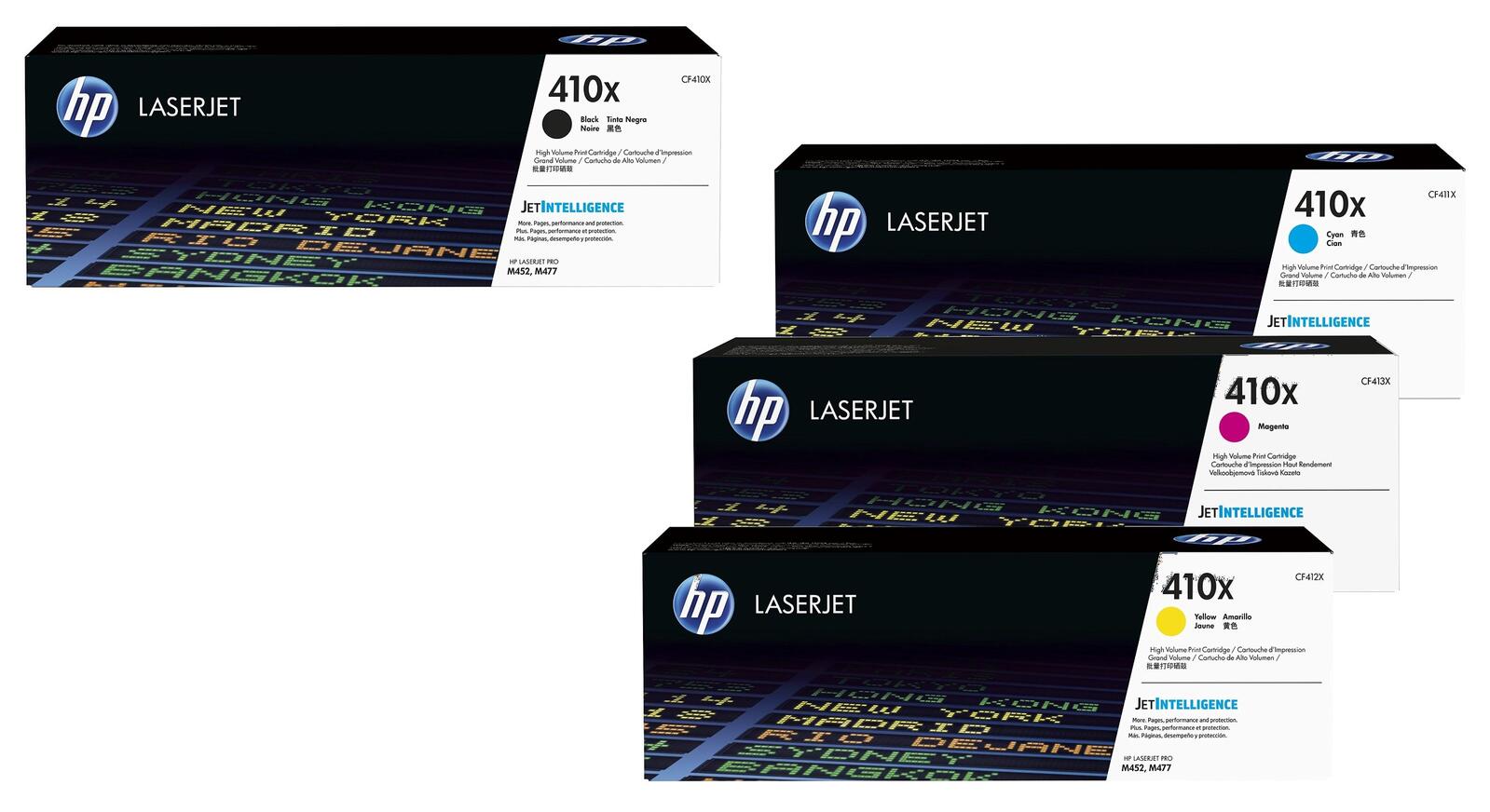 In dem 4er Set von HP erhalten Sie die Tonerkartuschen 410X in den Farben schwarz, cyan, magenta und gelb. Verlassen Sie sich auf den Original Toner von HP mit einer hohen Reichweite und JetIntelligence. Die Technologie ermöglicht ein schnelles und kostengünstiges Drucken. Die hohe Reichweite von bis zu 6.500 Seiten in schwarz und 5.000 Seiten in Farbe passt ideal zu der hohen Leistung Ihres Druckers. Die Tonerkartuschen der 410X-Serie können für folgende Drucker verwendet werden: Color LaserJet Pro M452dn, M452dw, M452nw, MFP M377dw, MFP M477fdn, MFP M477fdw, MFP M477fnw.