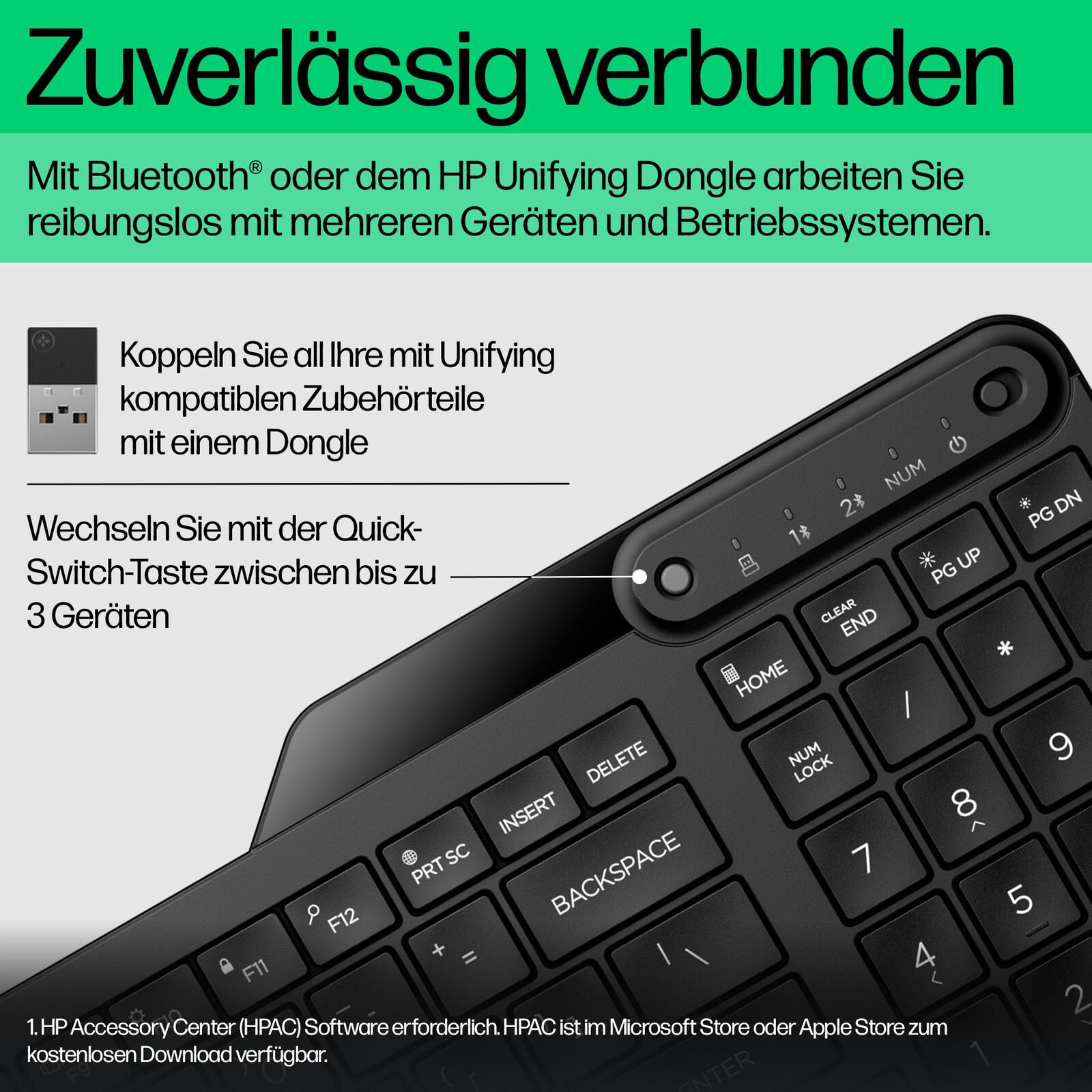 Die Auswahl macht das Leben besser. Die Dual-Mode-Funktion bietet Ihnen zwei einfache Möglichkeiten, über Ihre gesamten Geräte hinweg in Verbindung zu bleiben. Verbinden Sie auf sichere Art und Weise bis zu acht kompatible Geräte mit einem einzigen, verschlüsselten HP Unifying Dongle oder wechseln Sie auf Tastendruck zwischen bis zu drei Geräten.