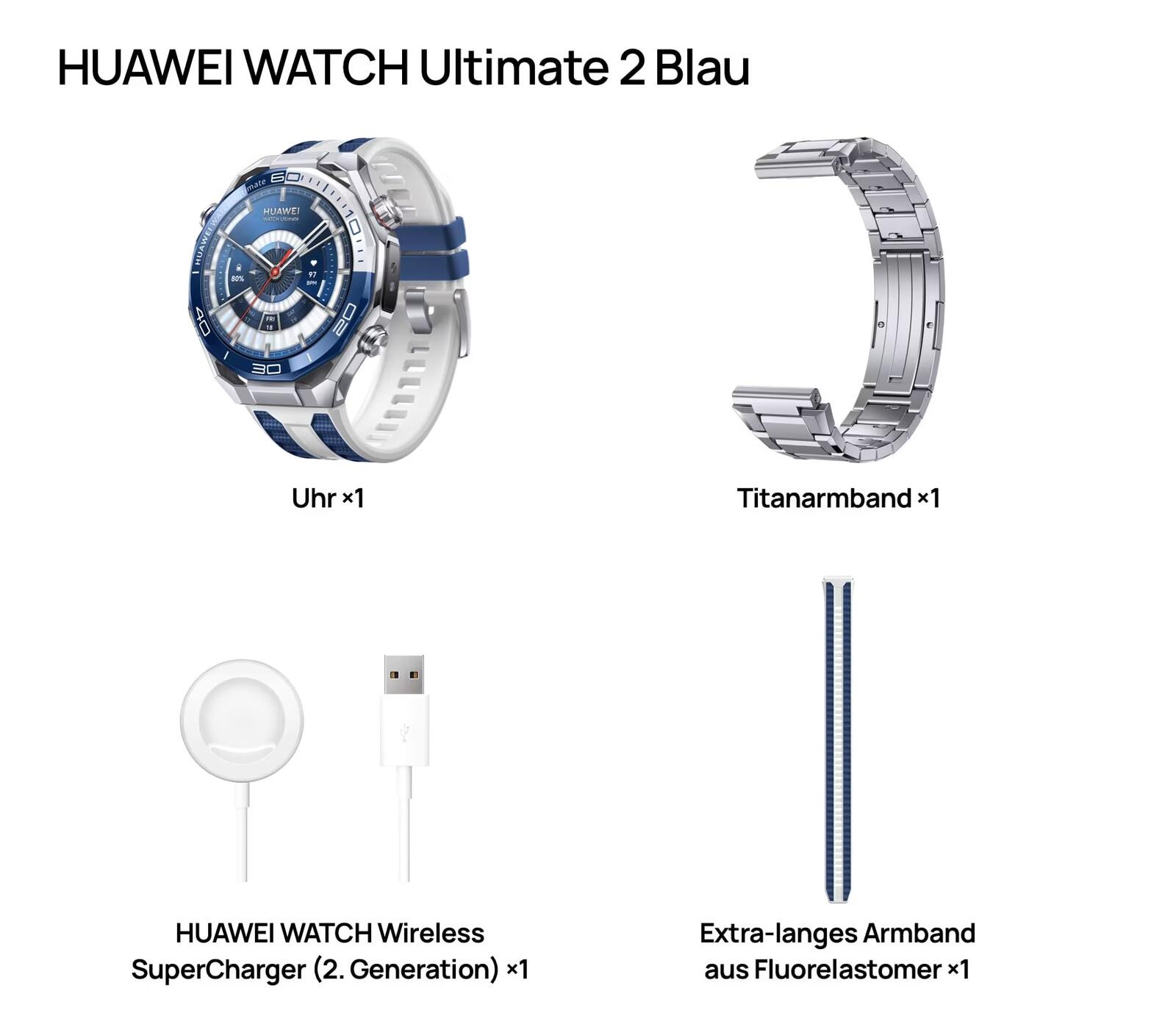 Huawei WATCH Ultimate 2 48,5mm - Stahlfarbe/Blau Blaues und weißes Fluorelastomerarmband (inkl. Titan-Armband und Verlängerungselement)