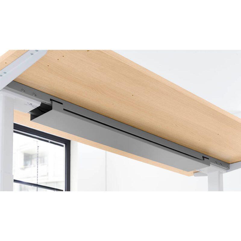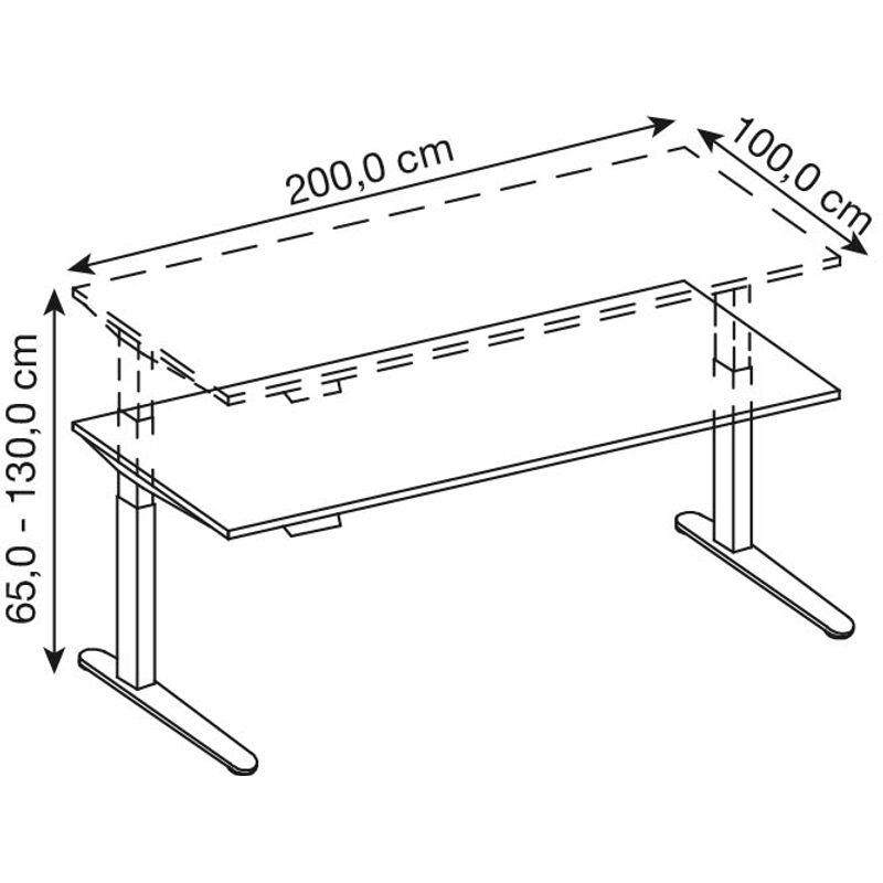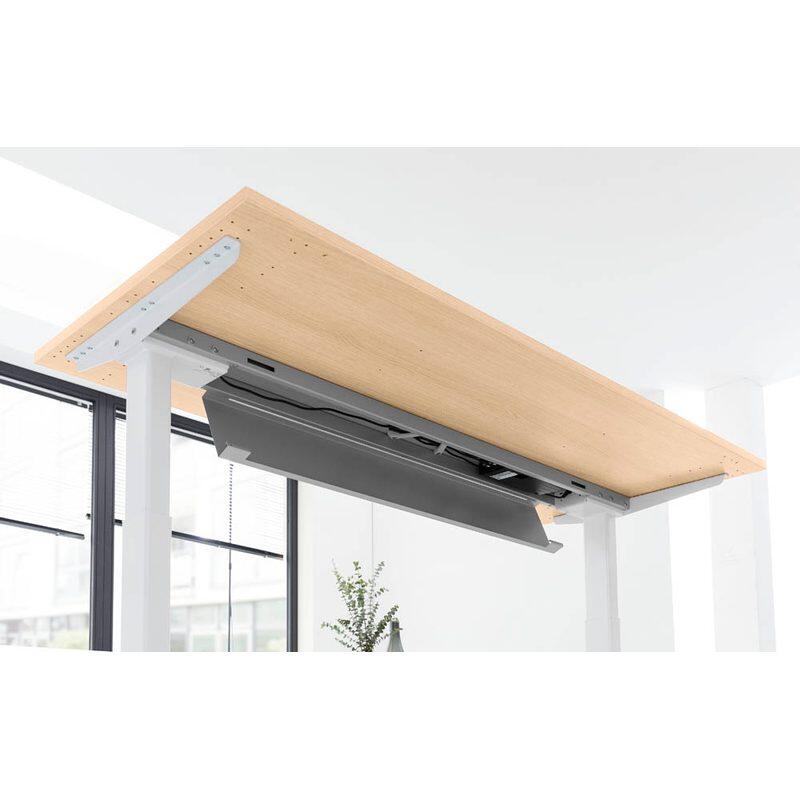 - Besonderheiten: Traversenfrei, 2-stufig, Stahlrahmen unter der Tischplatte aus 4,0 x 2,0 cm Rechteckrohr, abklappbare Kabelwanne