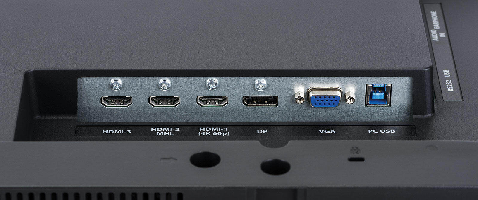 VGA-Eingang ( 15 PIN HD D-Sub (HD-15) ) ¦ 2 x HDMI-Eingang ( 19 PIN HDMI Typ A ) ¦ 1 x MHL/HDMI-Eingang ( 19 PIN HDMI Typ A ) ¦ 1 x DisplayPort-Eingang ( 20-poliger DisplayPort ) ¦ 1 x Kopfhörer ( Mini-Phone Stereo 3, 5 mm ) ¦ 1 x seriell (