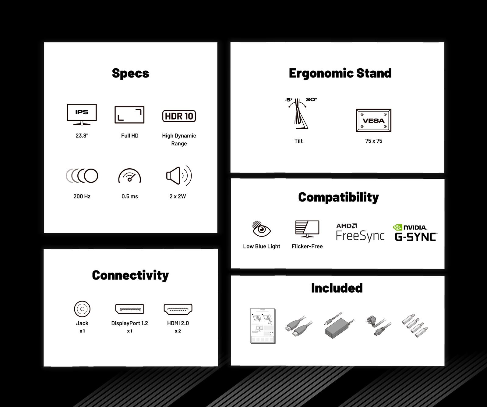 1920x1080 Pixel,IPS Panel, 0,5 ms, 200 Hz, AMD FreeSync, HDMI, DisplayPort