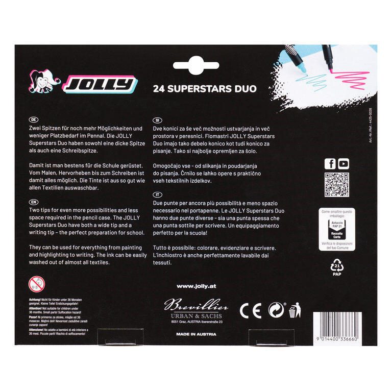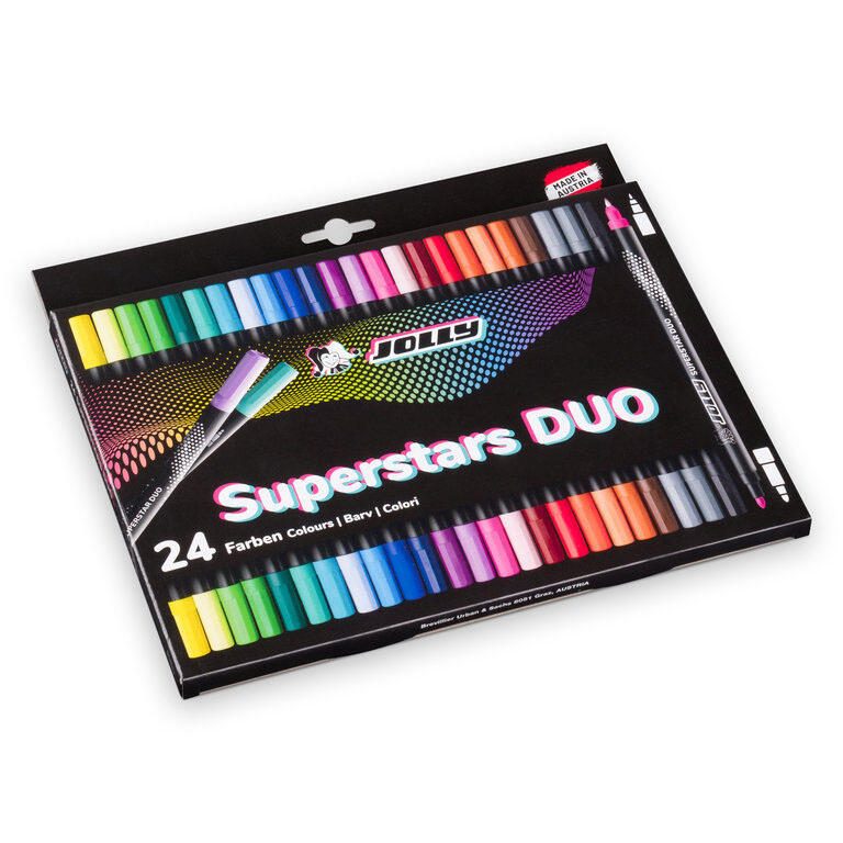 Die JOLLY Filzstifte Mehrfarbig 2.0 - 5.0 mm sind die perfekte Wahl für kreative Köpfe, die Wert auf Vielseitigkeit und Qualität legen. Mit einer Strichstärke von 2.0 bis 5.0 mm ermöglichen diese Stifte präzises Zeichnen und Malen. Die runde Spitze sorgt dafür, dass du sowohl feine Linien als auch breite Flächen mühelos gestalten kannst. Mit 24 verschiedenen Farben bietet dir das Set eine beeindruckende Palette, um deiner Kreativität freien Lauf zu lassen. Egal, ob du für die Schule, das Büro oder einfach zum Ausprobieren deiner künstlerischen Fähigkeiten zeichnest, diese Filzstifte sind immer die richtige Wahl. Die Farben sind wasserlöslich und auswaschbar, was bedeutet, dass du dir keine Sorgen um Flecken machen musst, falls mal etwas daneben geht. Die JOLLY Filzstifte sind zudem geruchsarm, sodass du sie auch in geschlossenen Räumen ohne Bedenken verwenden kannst. Die praktische Schutzklappe sorgt dafür, dass die Stifte nicht austrocknen und immer einsatzbereit sind. Die Verpackung im Karton-Etui ist nicht nur umweltfreundlich, sondern auch ideal für die Aufbewahrung und den Transport. Mit den JOLLY Filzstiften aus der Serie Next Supersta Duo erhältst du ein hochwertiges Produkt, das sowohl für Kinder als auch für Erwachsene geeignet ist. Lass deiner Fantasie freien Lauf und entdecke die Freude am kreativen Gestalten mit diesen vielseitigen Filzstiften.Technische Daten