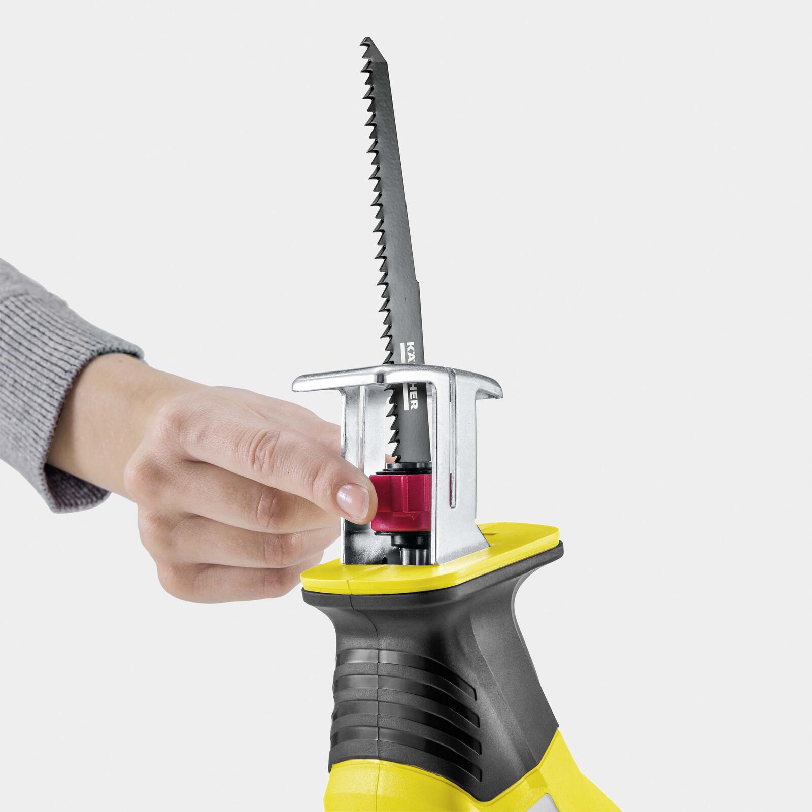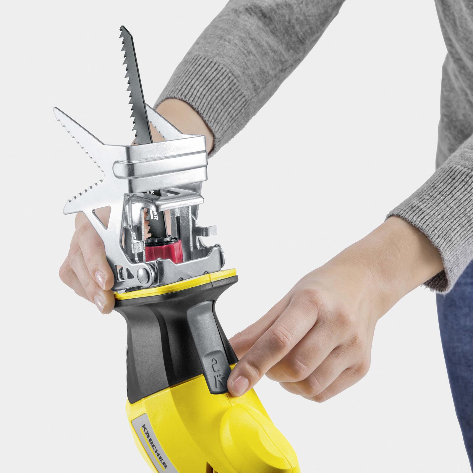 Der Griff der Astsäge besteht aus robustem Kunststoff, was für eine angenehme Handhabung und eine sichere Führung sorgt. Im Lieferumfang sind neben der Säge selbst auch ein Astbügel, ein Akkufuß sowie ein Sägeblatt enthalten. Bitte beachten Sie, dass Akku und Ladegerät separat erhältlich sind, was Ihnen die Möglichkeit gibt, das Gerät individuell mit kompatiblen Kärcher Akkus zu kombinieren.