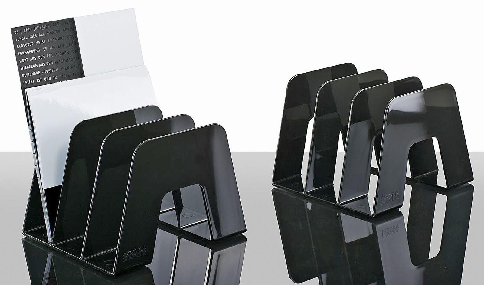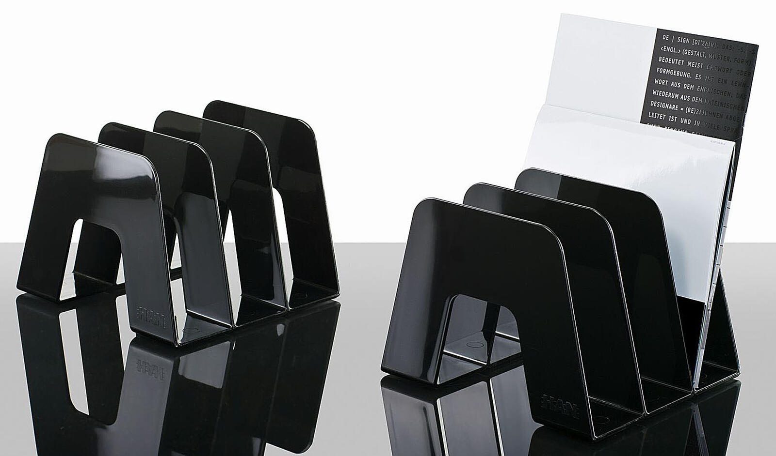 Der HAN Katalogsammler in elegantem Schwarz ist die perfekte Lösung, um deine Unterlagen ordentlich und übersichtlich zu organisieren. Mit den kompakten Maßen von 20,9 x 22,4 x 16,3 cm passt dieser Katalogsammler ideal auf jeden Schreibtisch und bietet gleichzeitig ausreichend Platz für deine Dokumente. Hergestellt aus hochwertigem Polystyrol, zeichnet sich dieser Katalogsammler nicht nur durch seine Langlebigkeit aus, sondern auch durch seine ansprechende Optik. Die schlichte schwarze Farbe fügt sich harmonisch in jede Büroumgebung ein und sorgt für einen professionellen Eindruck. Der Katalogsammler verfügt über drei Fächer, die jeweils eine Höhe von 6,1 cm bieten. So kannst du deine Kataloge, Broschüren oder andere Unterlagen nach Themen oder Projekten sortieren und schnell darauf zugreifen. Die durchdachte Struktur ermöglicht es dir, auch größere Mengen an Dokumenten effizient zu organisieren, ohne dass der Überblick verloren geht. Mit einer Packung, die zwei Stück enthält, kannst du deine Ablage noch weiter optimieren und gleichzeitig einen einheitlichen Look auf deinem Schreibtisch schaffen. Der HAN Katalogsammler ist somit nicht nur funktional, sondern auch eine stilvolle Ergänzung für dein Büro. Entscheide dich für den HAN Katalogsammler und erlebe, wie einfach und angenehm die Organisation deiner Unterlagen sein kann.Technische Daten