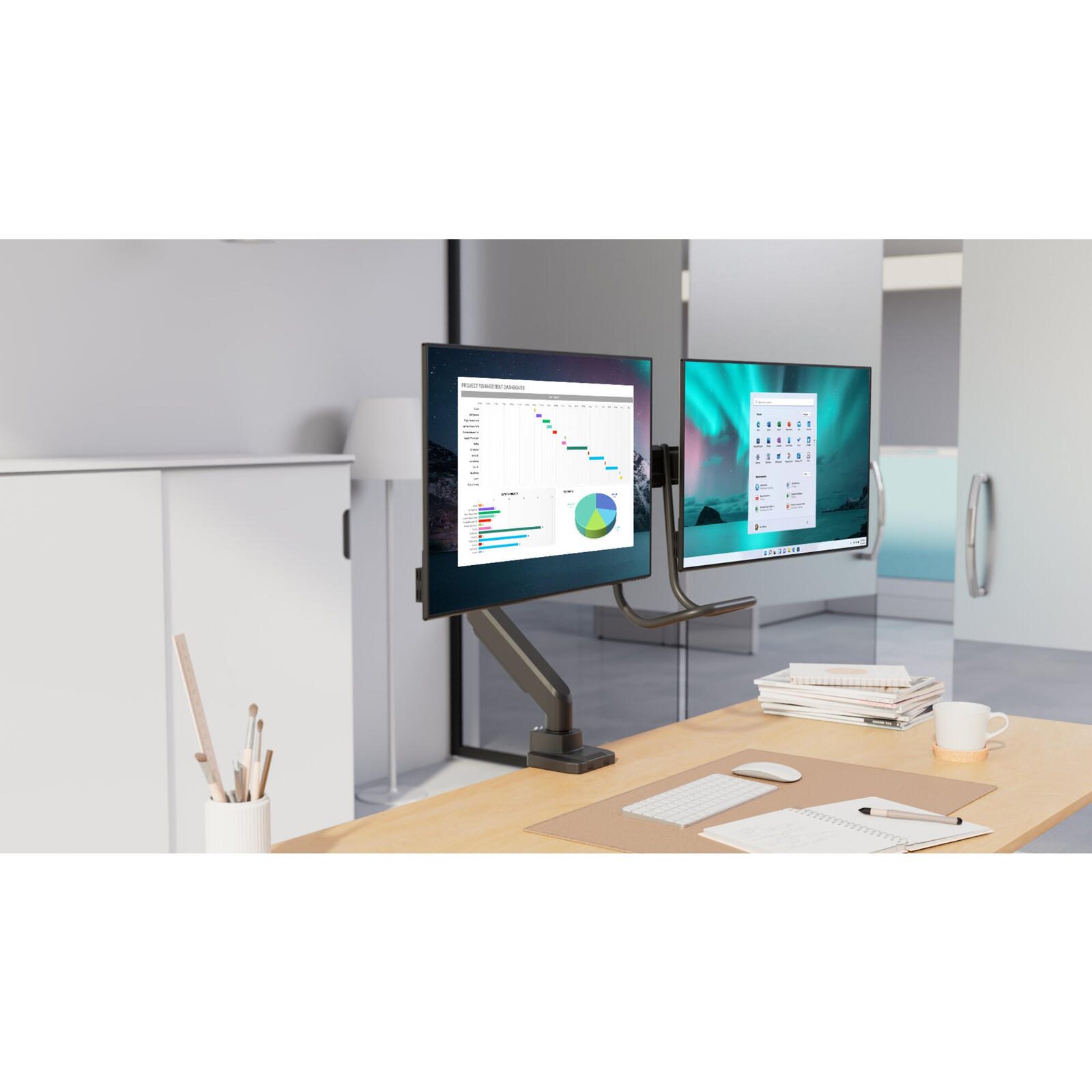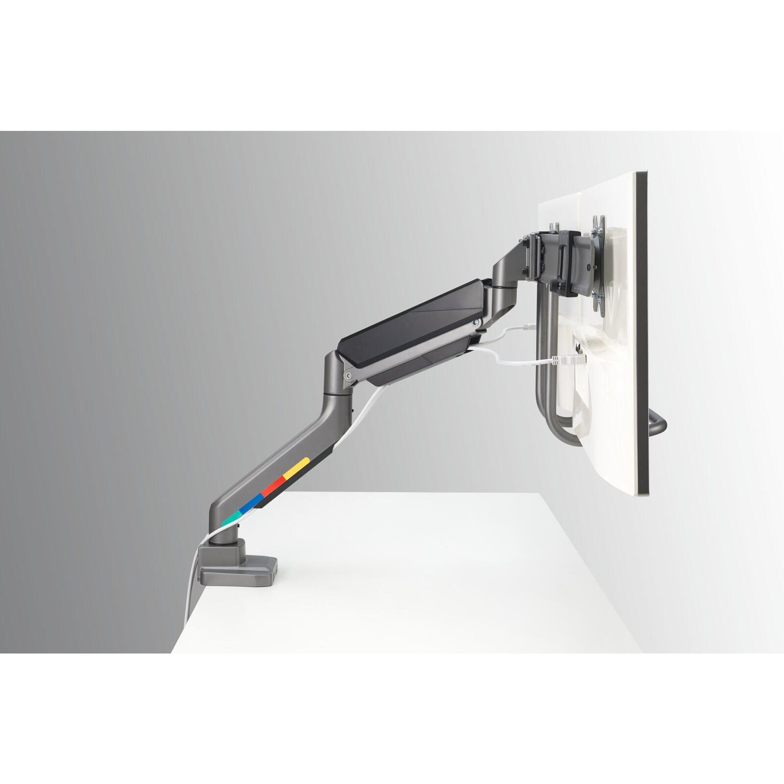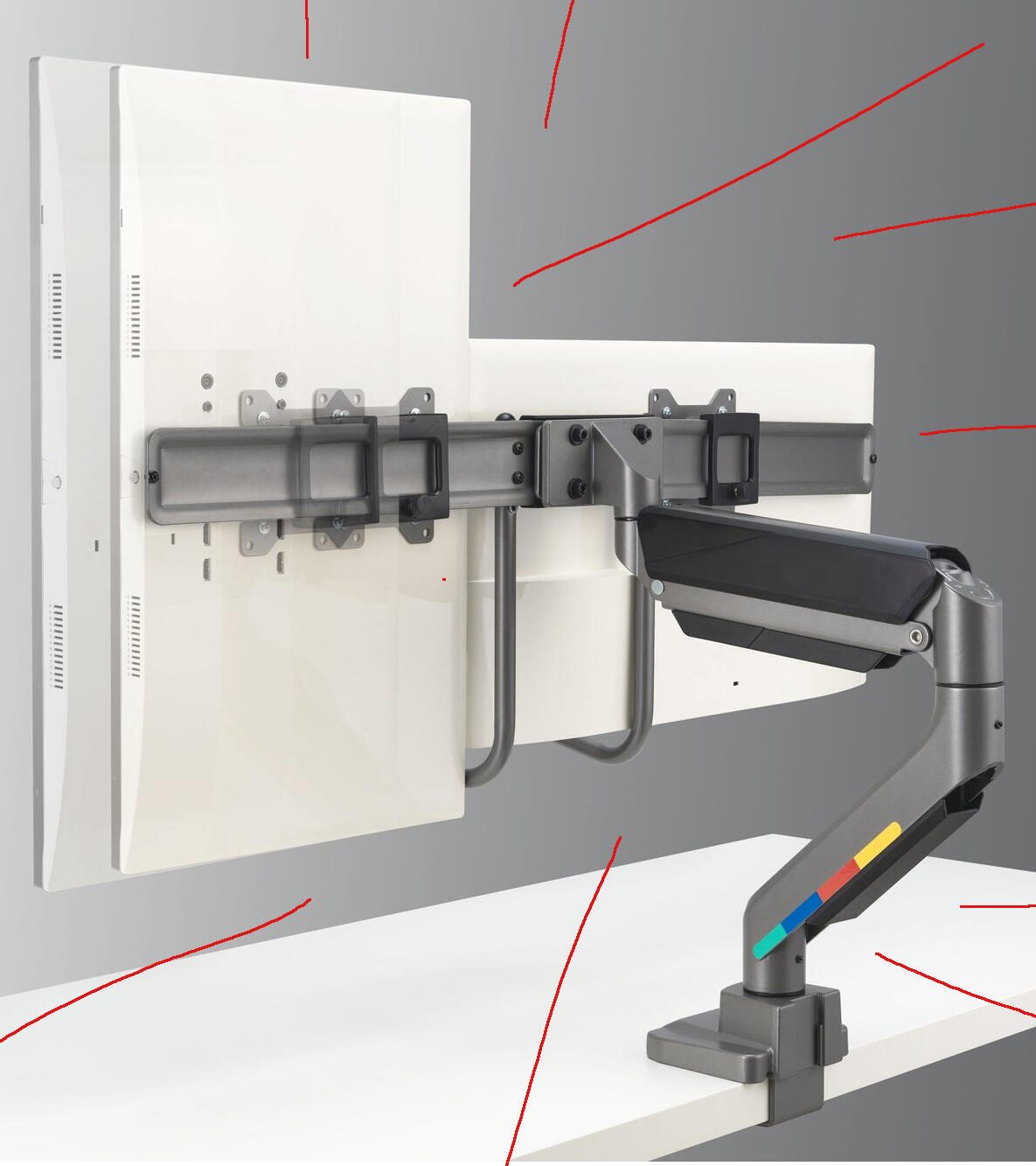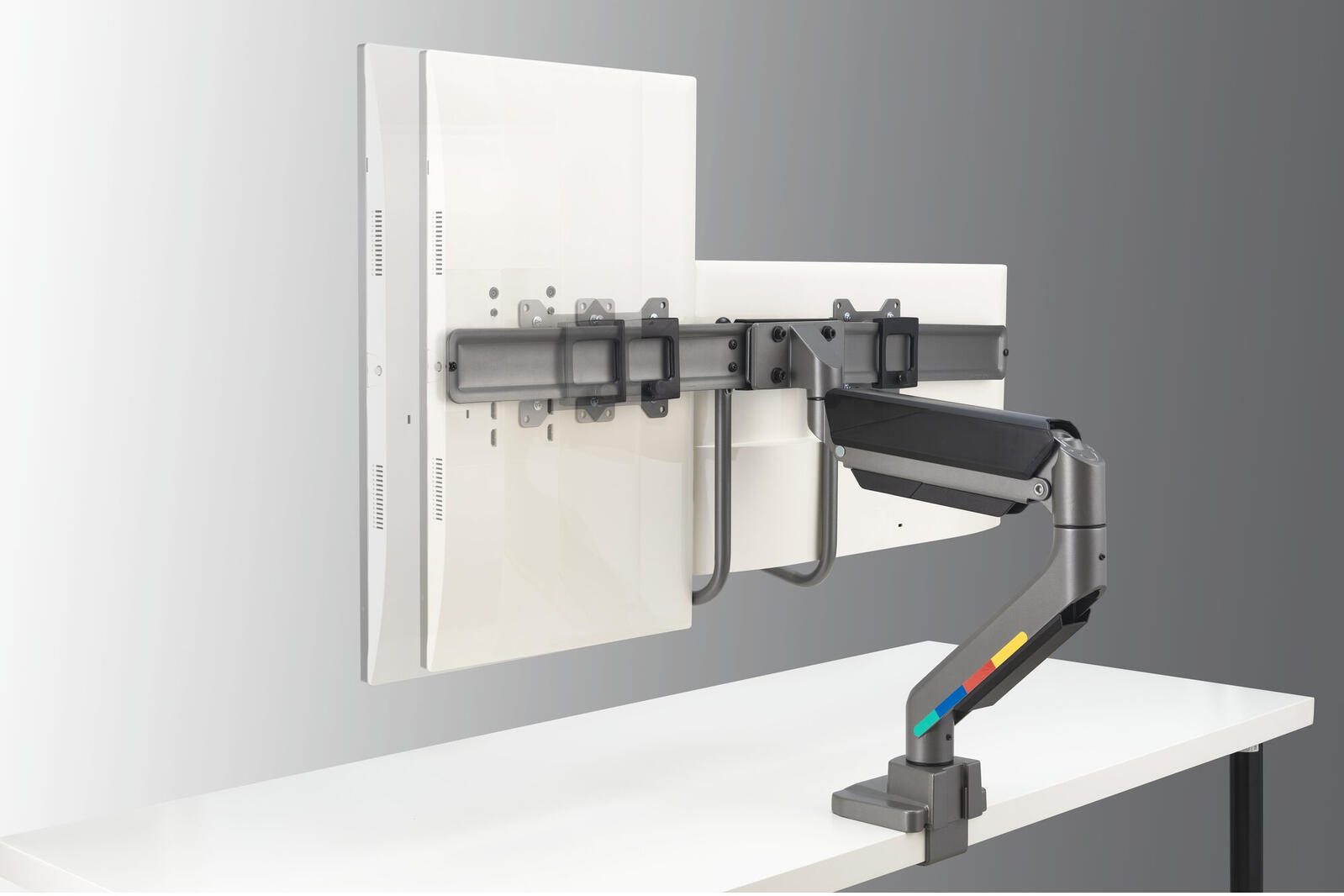 Jeder Arm der Halterung trägt eine maximale Belastung von bis zu 9,0 Kilogramm, sodass die meisten handelsüblichen Monitore sicher gehalten werden können. Die Höhenverstellung der Arme ist bis zu 56,0 Zentimeter möglich, was eine flexible Anpassung an individuelle Sehgewohnheiten und unterschiedliche Schreibtischhöhen erlaubt. Diese Flexibilität unterstützt eine ergonomische Sitzhaltung und kann zur Verringerung von Nacken- und Rückenbeschwerden beitragen.