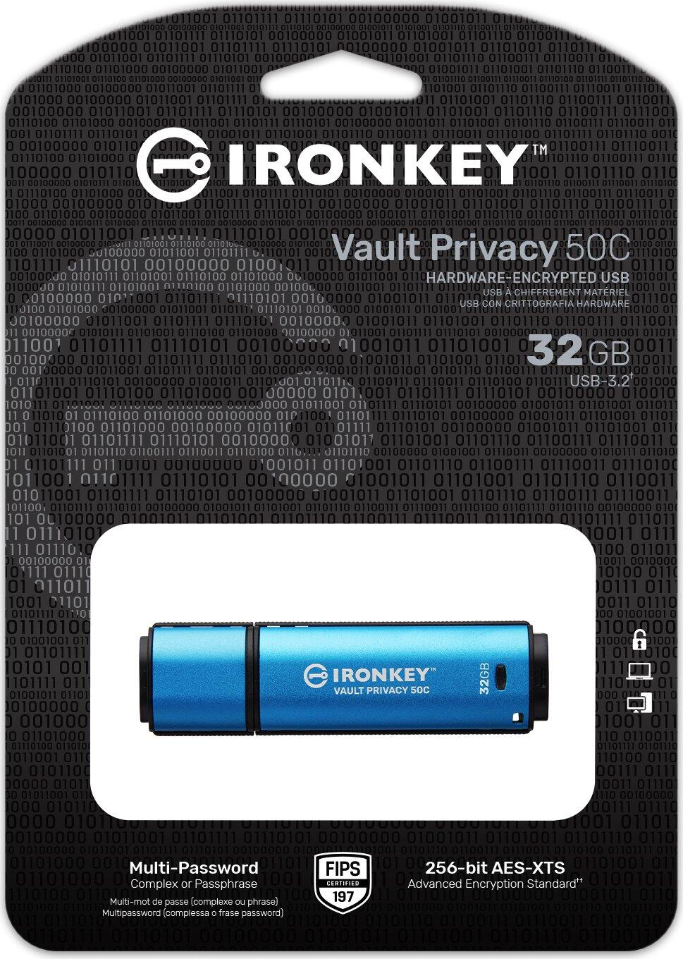 Die Kingston IronKey™ Vault Privacy 50 Serie umfasst hochwertige USB-A und USB-C®1-Sticks, die mit einer FIPS 197-zertifizierten AES-256-Bit-Hardwareverschlüsselung im XTS-Modus Sicherheit für Unternehmen bietet, einschließlich Schutzmaßnahmen gegen BadUSB mit digital signierter Firmware und gegen Brute-Force-Passwortangriffe. Da es sich um verschlüsselte Speicher unter physischer Kontrolle des Benutzers handelt, bietet die VP50-Serie einen wesentlich besseren Datenschutz als das Internet oder Cloud-Dienste.