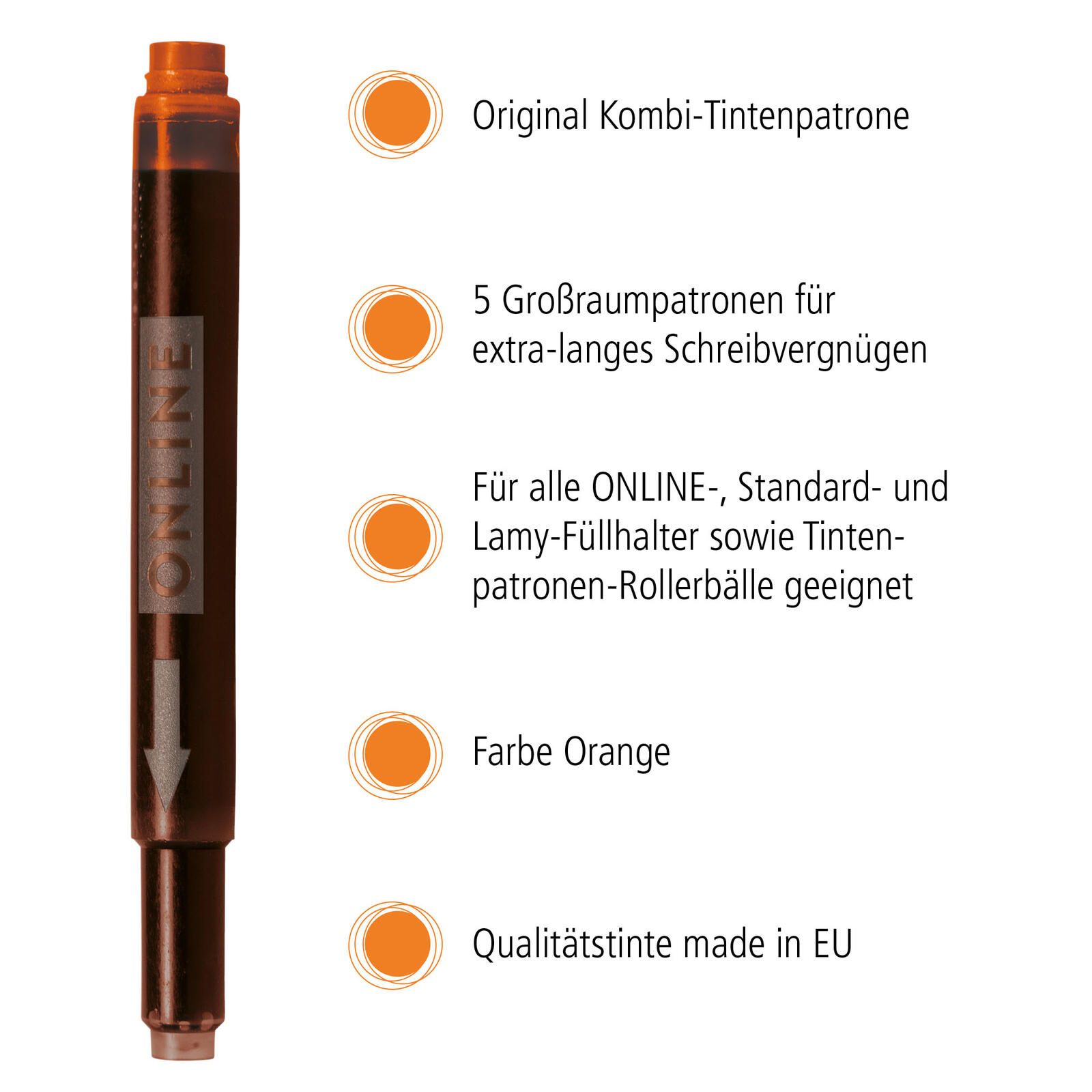 Die ONLINE® Tintenpatronen für Füller in der auffälligen Farbe orange sind die perfekte Wahl für alle, die Wert auf Qualität und Vielseitigkeit legen. Diese hochwertigen Füllerpatronen sind speziell entwickelt, um sowohl mit ONLINE- als auch mit Standard-Füllern verwendet zu werden. Sie verfügen über eine dünne Seite, die sich ideal für präzises Schreiben eignet, während die dicke Seite speziell für Lamy-Füller konzipiert ist. Damit bieten sie dir die Flexibilität, die du für unterschiedliche Schreibstile benötigst. Die leuchtende orange Farbe sorgt nicht nur für ein ansprechendes Schriftbild, sondern hebt auch wichtige Notizen hervor und verleiht deinen Texten eine besondere Note. Mit einem Pack von fünf Patronen bist du bestens ausgestattet, um deine kreativen Ideen und Gedanken festzuhalten, sei es in der Schule, im Büro oder beim kreativen Schreiben. Die ONLINE® Tintenpatronen zeichnen sich durch ihre einfache Handhabung und die hohe Farbintensität aus. Du kannst dich darauf verlassen, dass jeder Strich gleichmäßig und flüssig verläuft, ohne dass es zu Aussetzern oder Verschmierungen kommt. Die Kombination aus Qualität und Benutzerfreundlichkeit macht diese Patronen zu einer idealen Wahl für Schüler, Studenten und Berufstätige gleichermaßen. Mit den ONLINE® Tintenpatronen in orange bringst du nicht nur Farbe in deinen Alltag, sondern profitierst auch von der bewährten Qualität des Herstellers. Vertraue auf die Kombination aus Funktionalität und ansprechendem Design, die dir das Schreiben erleichtert und Freude bereitet.Technische Daten