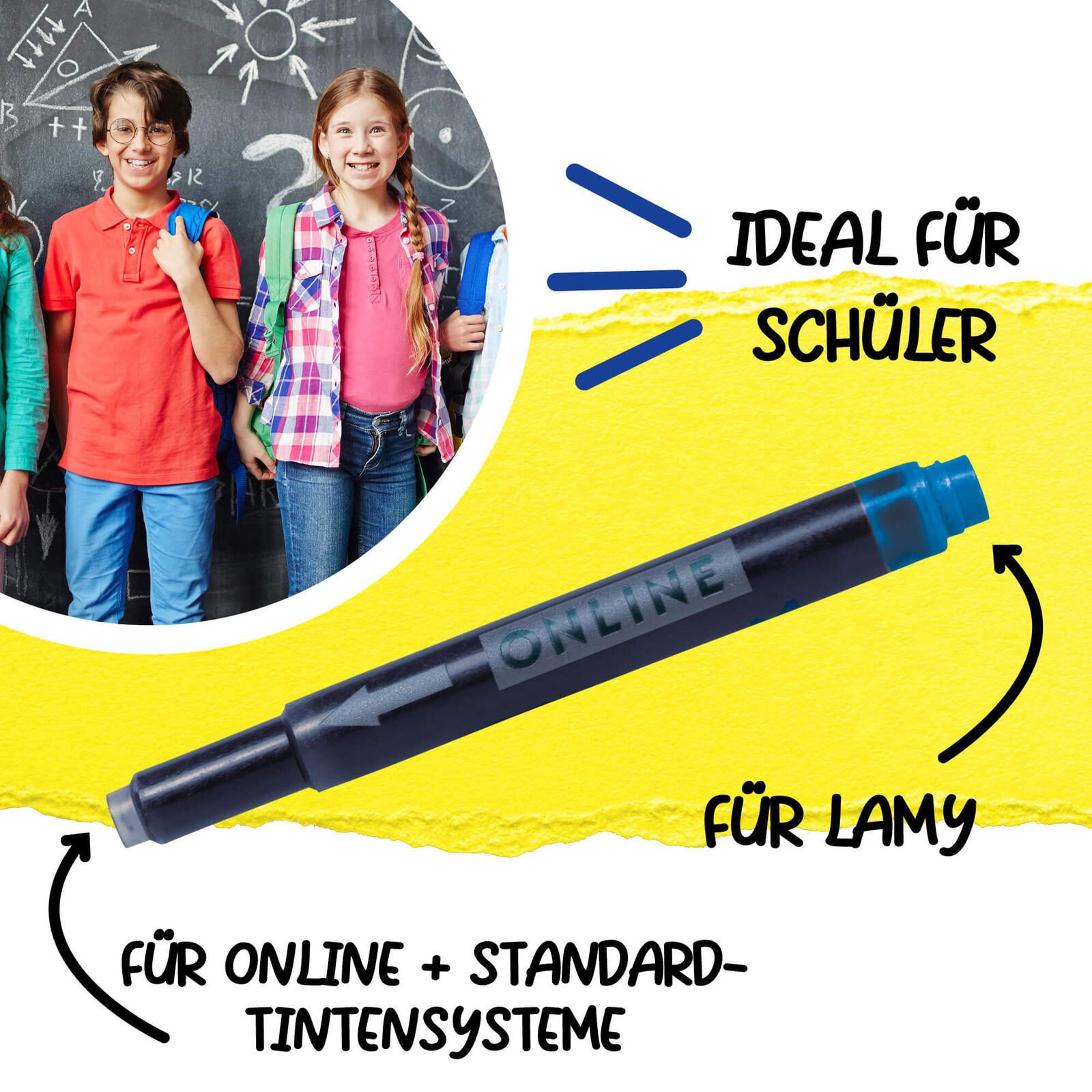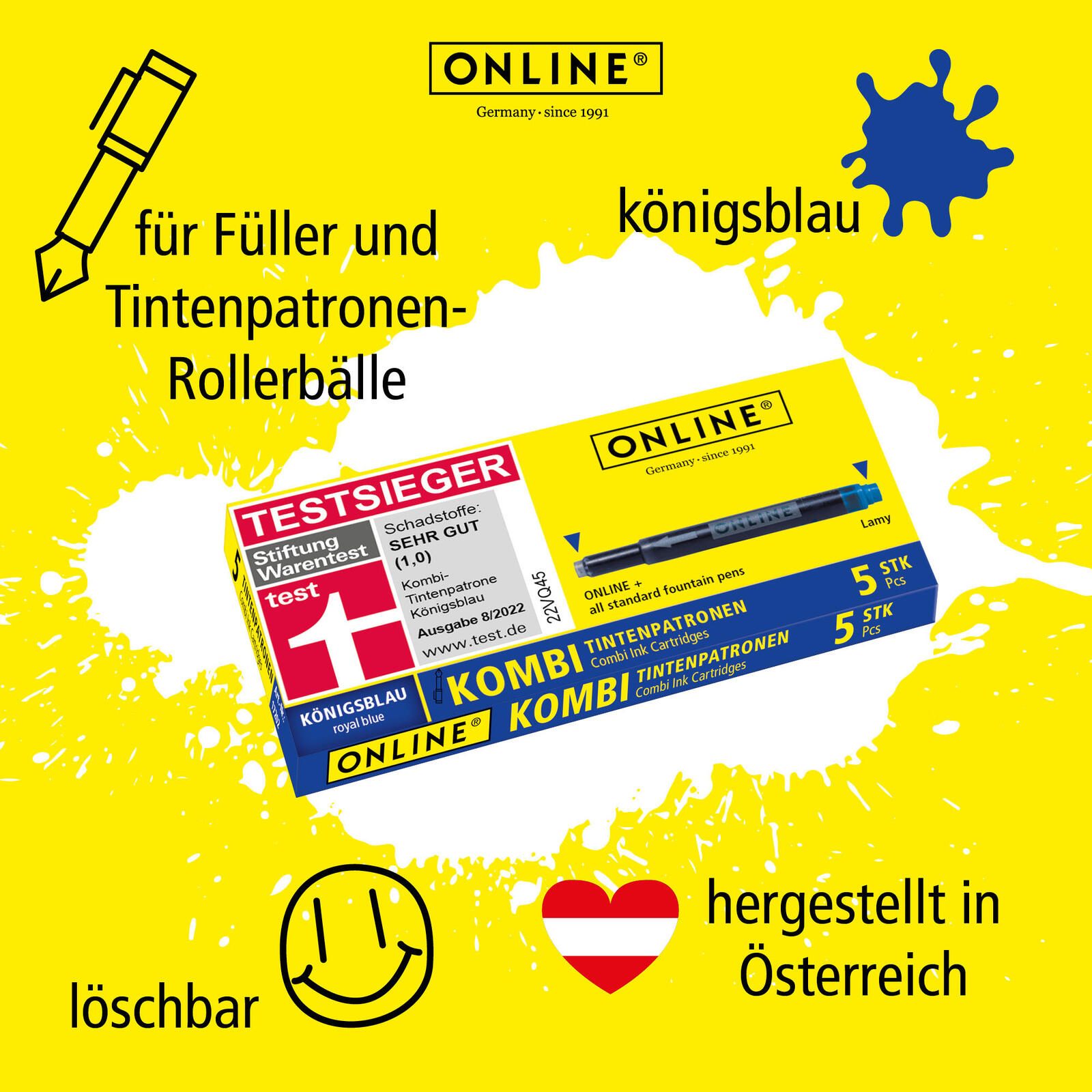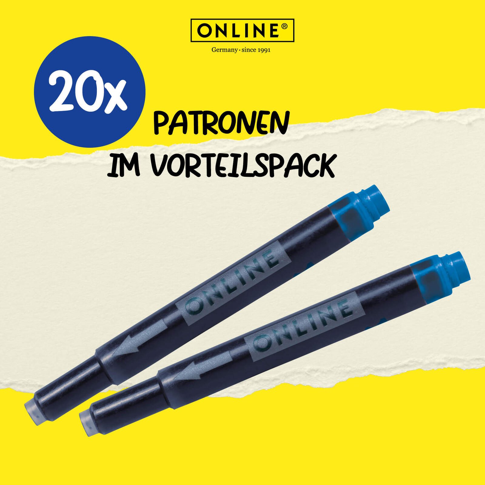 Die ONLINE® Tintenpatronen für Füller in der eleganten Farbe königsblau sind die perfekte Wahl für alle, die Wert auf Qualität und Vielseitigkeit legen. Diese Patronen sind speziell entwickelt, um sowohl auf der dünnen als auch auf der dicken Seite zu funktionieren. Sie sind ideal für alle ONLINE und Standard-Füller sowie für Lamy Füller, was sie zu einer flexiblen Lösung für unterschiedliche Schreibbedürfnisse macht. Mit einem Pack von 20 Stück bist du bestens ausgestattet, um deine Schreibprojekte zu realisieren, sei es für die Schule, das Büro oder kreative Notizen. Die königsblaue Tinte sorgt für einen klaren und präzisen Schriftzug, der sowohl auf Papier als auch in Notizbüchern hervorragend zur Geltung kommt. Die hohe Farbintensität sorgt dafür, dass deine Texte lebendig und ansprechend wirken, während die schnelle Trocknungszeit ein Verschmieren der Tinte verhindert. Die ONLINE® Tintenpatronen zeichnen sich durch ihre einfache Handhabung aus. Der Wechsel der Patronen gelingt im Handumdrehen, sodass du schnell wieder mit dem Schreiben beginnen kannst. Die Qualität der Tinte sorgt zudem dafür, dass deine Dokumente langlebig und lichtbeständig bleiben. Egal, ob du ein Schüler, Student oder Berufstätiger bist, die ONLINE® Tintenpatronen in königsblau bieten dir die Zuverlässigkeit und Flexibilität, die du für deine täglichen Schreibarbeiten benötigst. Vertraue auf die Erfahrung und das Engagement von ONLINE®, um deine Schreibwerkzeuge optimal zu ergänzen.Technische Daten