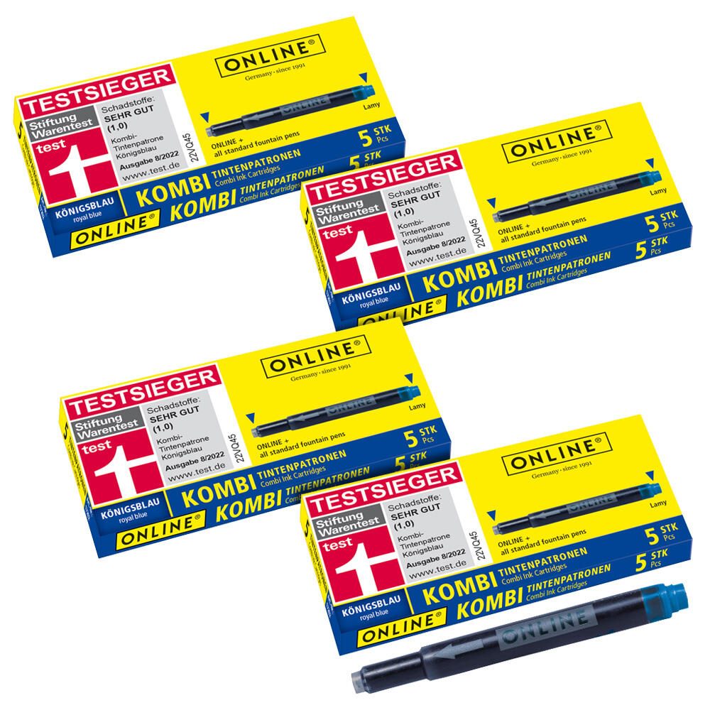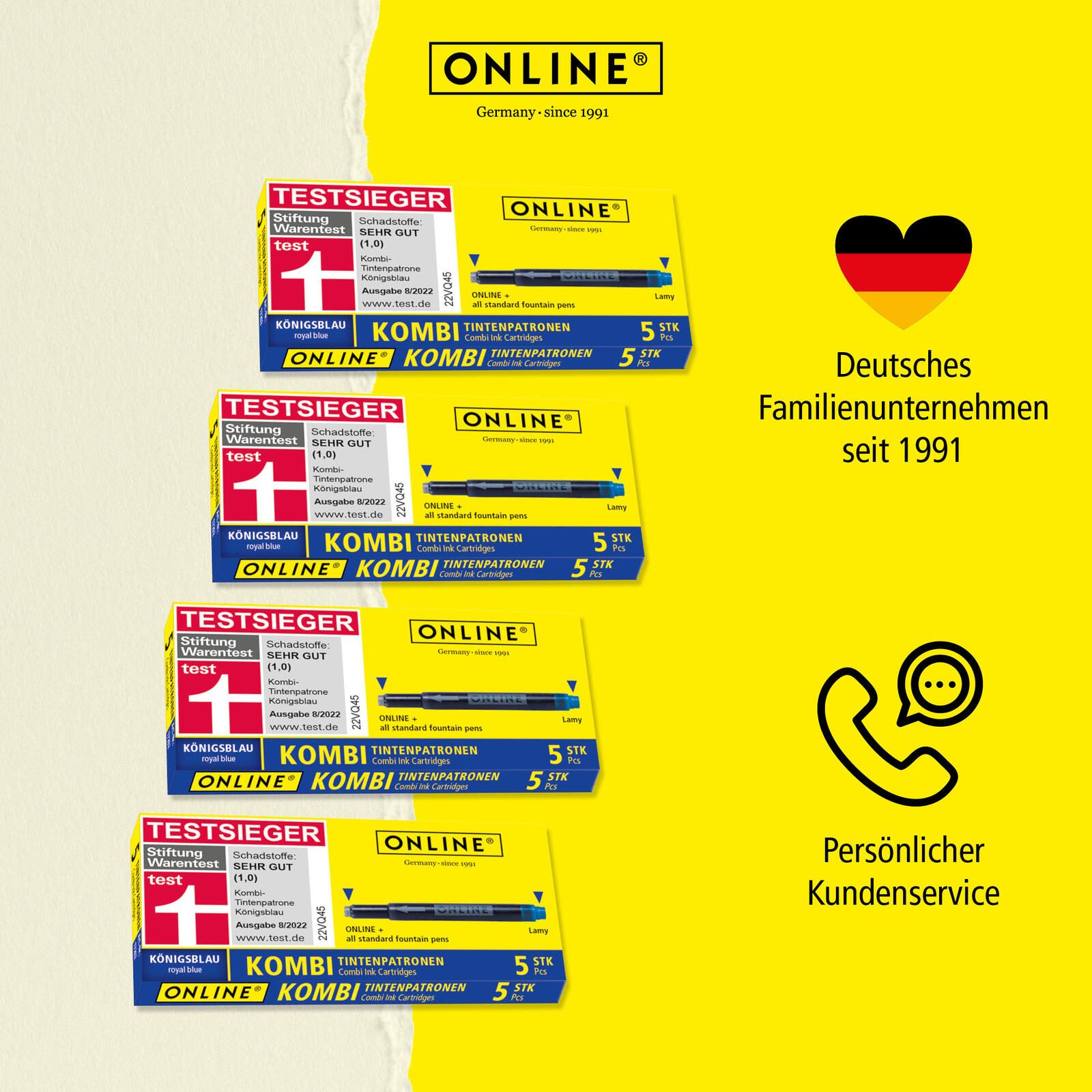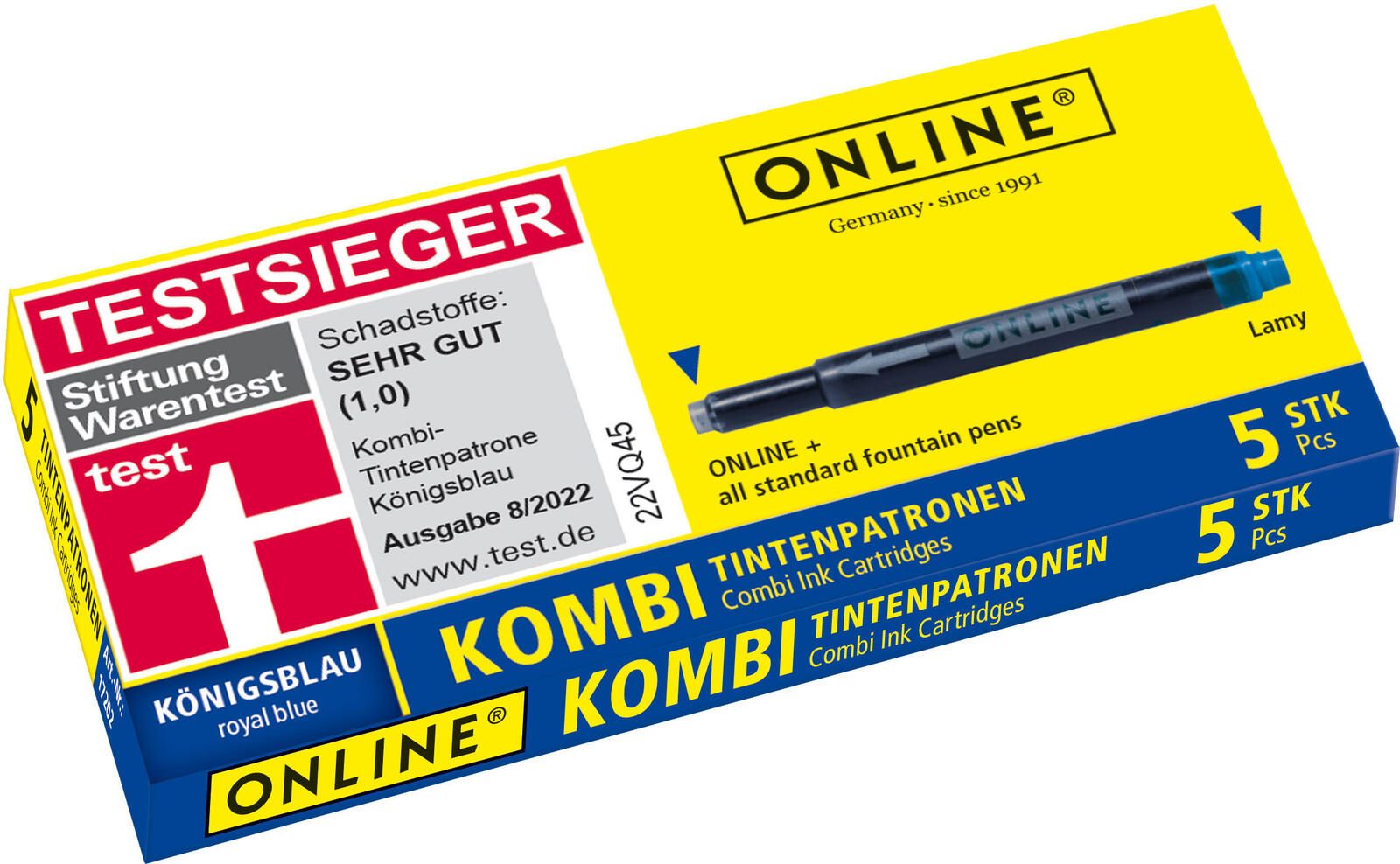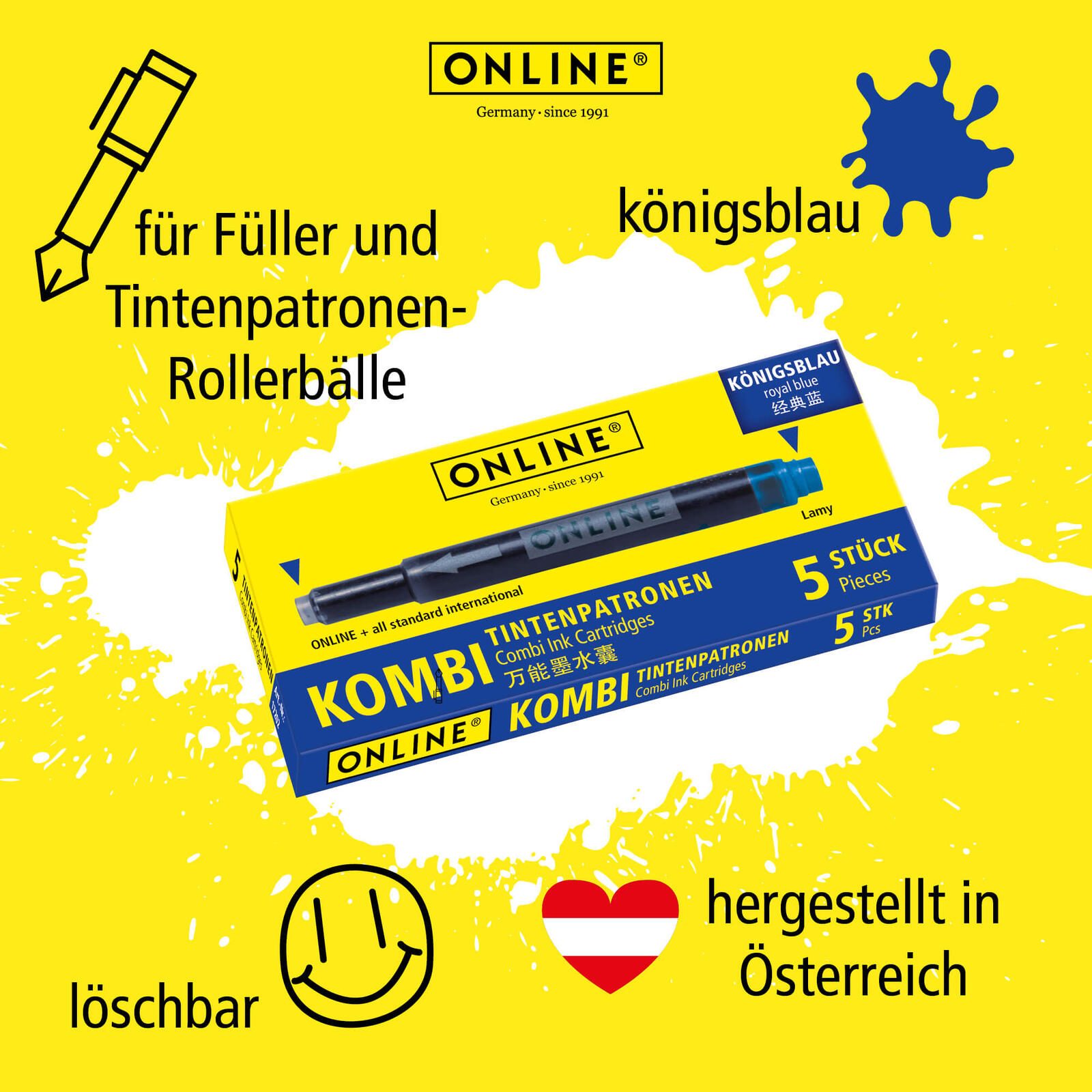 Die ONLINE® Tintenpatronen für Füller in der eleganten Farbe königsblau sind die perfekte Wahl für alle, die Wert auf Qualität und Vielseitigkeit legen. Diese Patronen sind speziell entwickelt, um sowohl auf der dünnen als auch auf der dicken Seite zu funktionieren. Sie sind ideal für alle ONLINE und Standard-Füller sowie für Lamy Füller, was sie zu einer flexiblen Lösung für unterschiedliche Schreibbedürfnisse macht. Mit einem Pack von 20 Stück bist du bestens ausgestattet, um deine Schreibprojekte zu realisieren, sei es für die Schule, das Büro oder kreative Notizen. Die königsblaue Tinte sorgt für einen klaren und präzisen Schriftzug, der sowohl auf Papier als auch in Notizbüchern hervorragend zur Geltung kommt. Die hohe Farbintensität sorgt dafür, dass deine Texte lebendig und ansprechend wirken, während die schnelle Trocknungszeit ein Verschmieren der Tinte verhindert. Die ONLINE® Tintenpatronen zeichnen sich durch ihre einfache Handhabung aus. Der Wechsel der Patronen gelingt im Handumdrehen, sodass du schnell wieder mit dem Schreiben beginnen kannst. Die Qualität der Tinte sorgt zudem dafür, dass deine Dokumente langlebig und lichtbeständig bleiben. Egal, ob du ein Schüler, Student oder Berufstätiger bist, die ONLINE® Tintenpatronen in königsblau bieten dir die Zuverlässigkeit und Flexibilität, die du für deine täglichen Schreibarbeiten benötigst. Vertraue auf die Erfahrung und das Engagement von ONLINE®, um deine Schreibwerkzeuge optimal zu ergänzen.Technische Daten