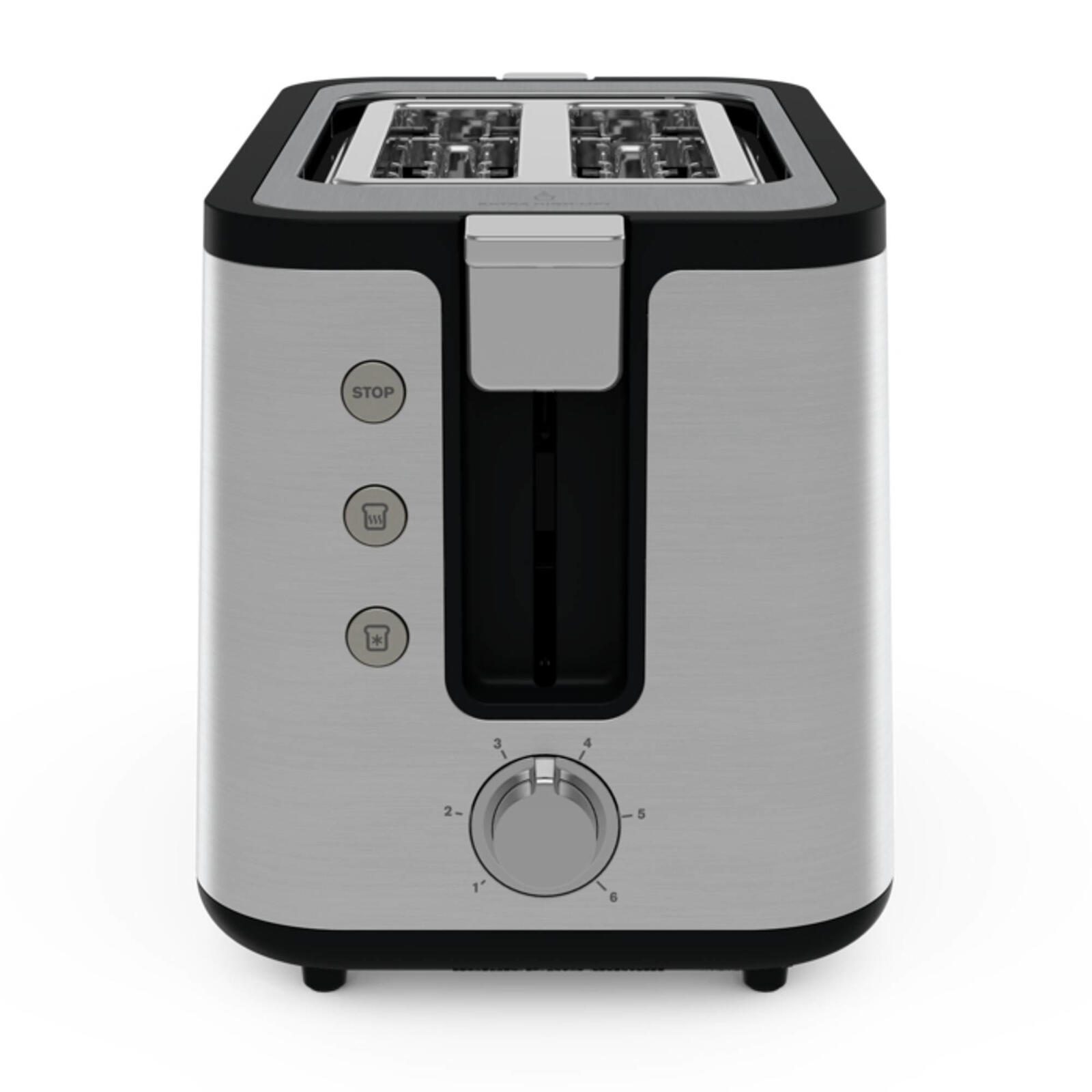 Dieser benutzerfreundliche Zwei-Scheiben-Toaster aus Edelstahl bietet das komplette Leistungspaket: 6 Toast-Einstellungen für jeden Geschmack, eine Abbruch-, Aufwärm- und Auftaufunktion, einen integrierten Gebäck-/Brötchenwärmer, einen praktischen Hebel zum Anheben und Herausnehmen selbst kleiner Brotscheiben und ein mobiles Krümelfach für eine einfache Reinigung.