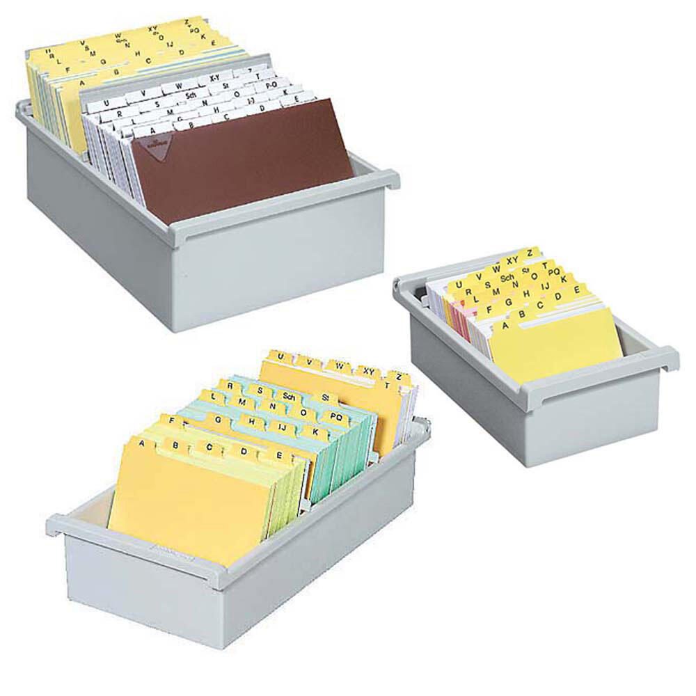 Mit seinem ansprechenden Grauton fügt sich der Karteikasten harmonisch in jedes Umfeld ein. Dank der praktischen Griffmulden kannst du den Kasten mühelos transportieren und flexibel einsetzen.
