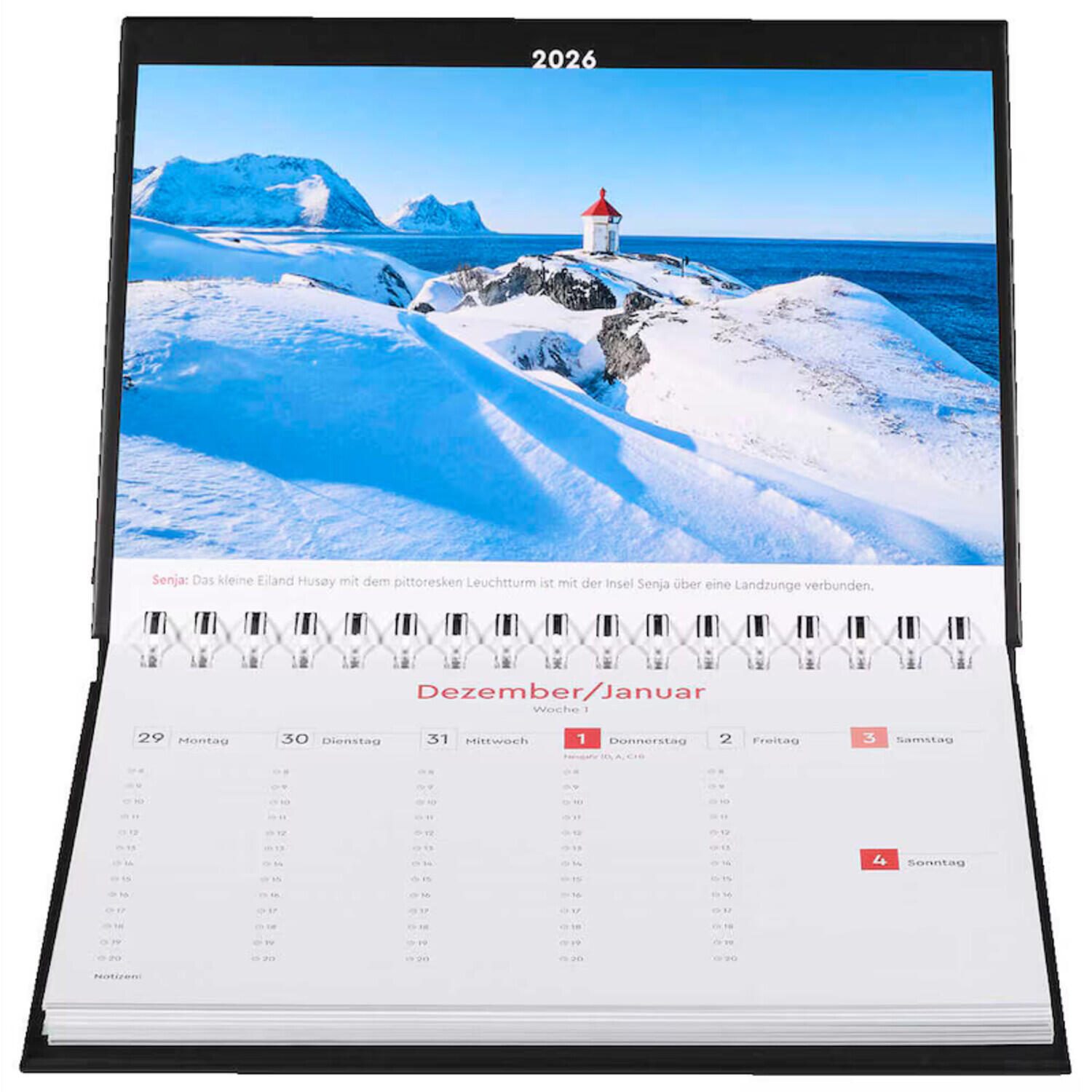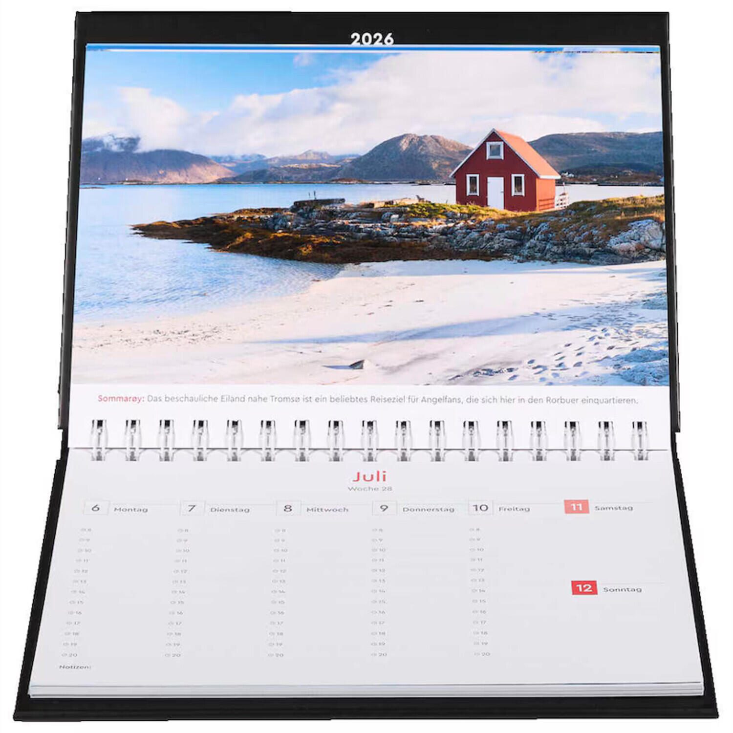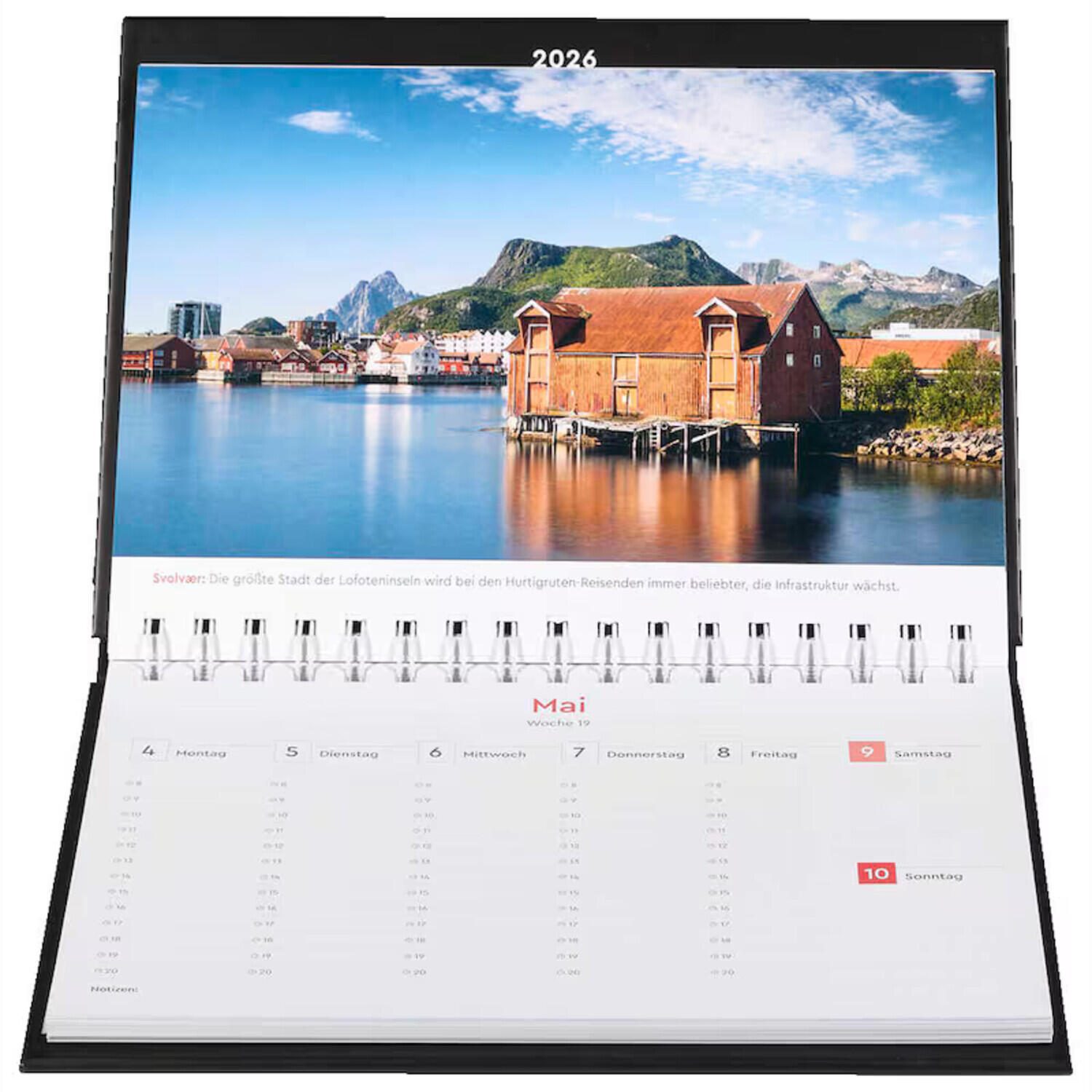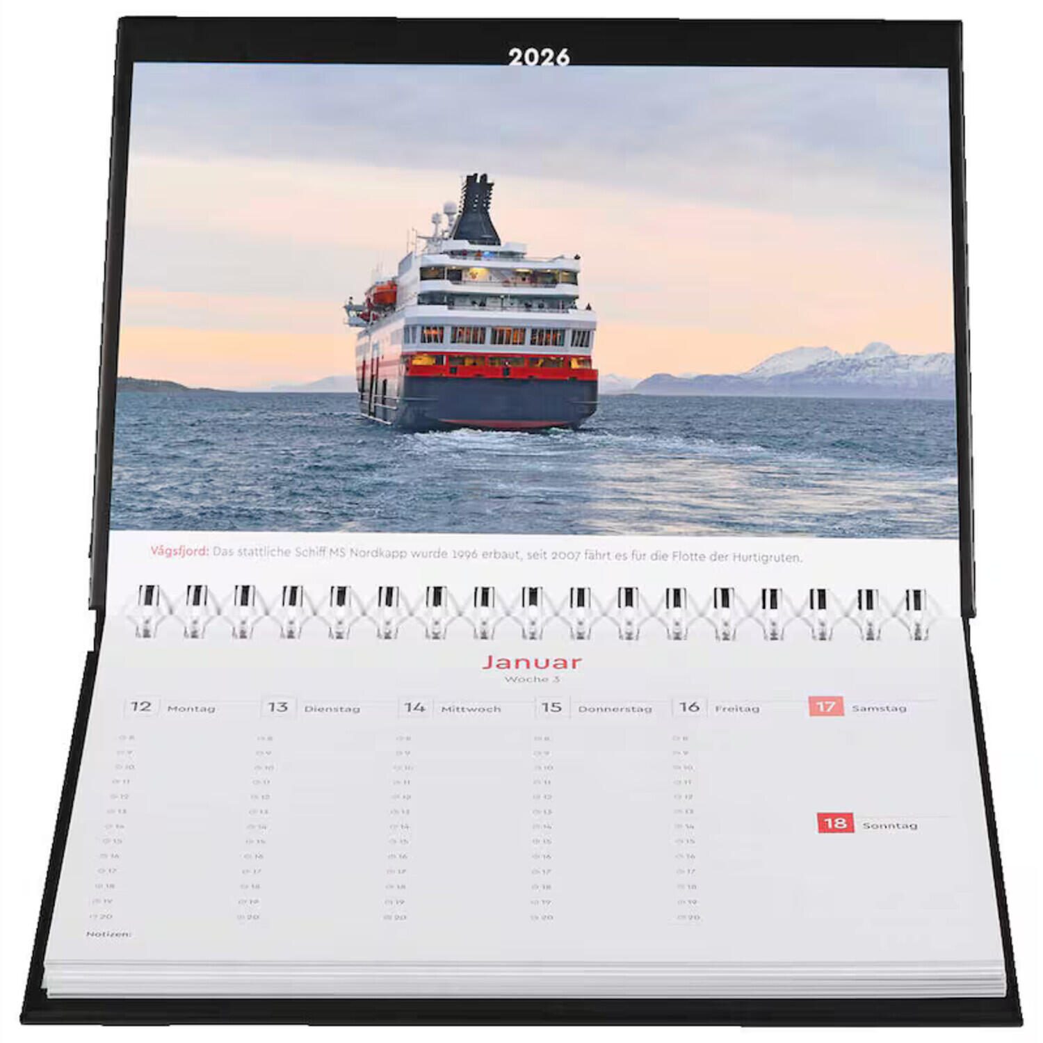 Der KUNTH Tischquerkalender Hurtigruten 2026 ist ein praktischer Bildtischkalender, der sich durch seine handliche Größe von 22,0 x 17,5 cm auszeichnet. Er ist speziell als Querkalender gestaltet und bietet eine übersichtliche Darstellung der Kalenderwochen und Monate im Querformat. Die doppelte Spiralbindung oben sorgt für eine einfache Handhabung und das problemlose Umblättern der einzelnen Kalenderblätter.
