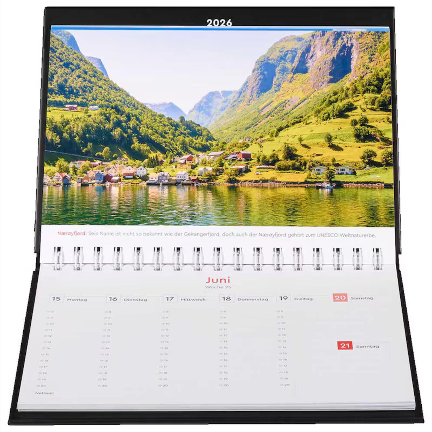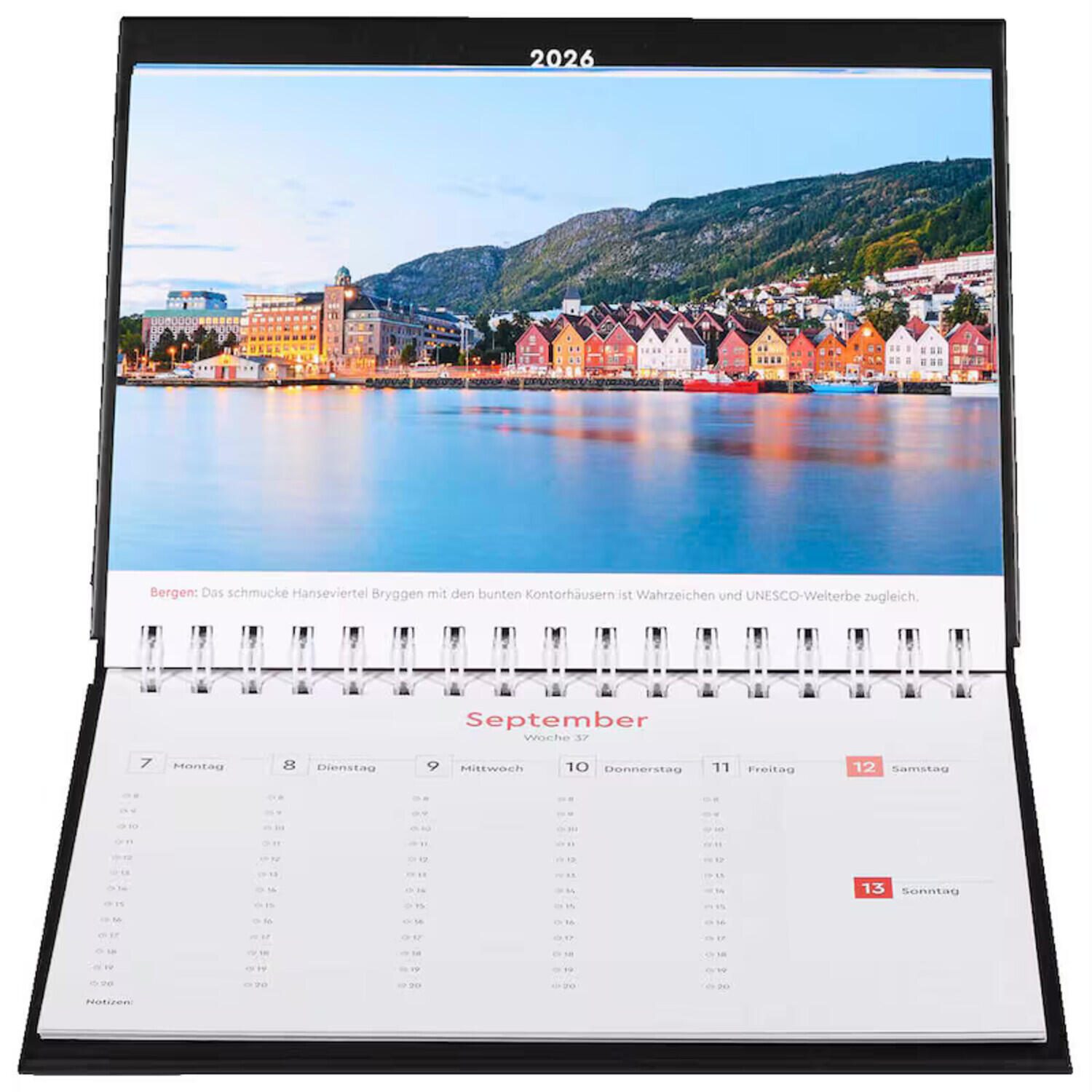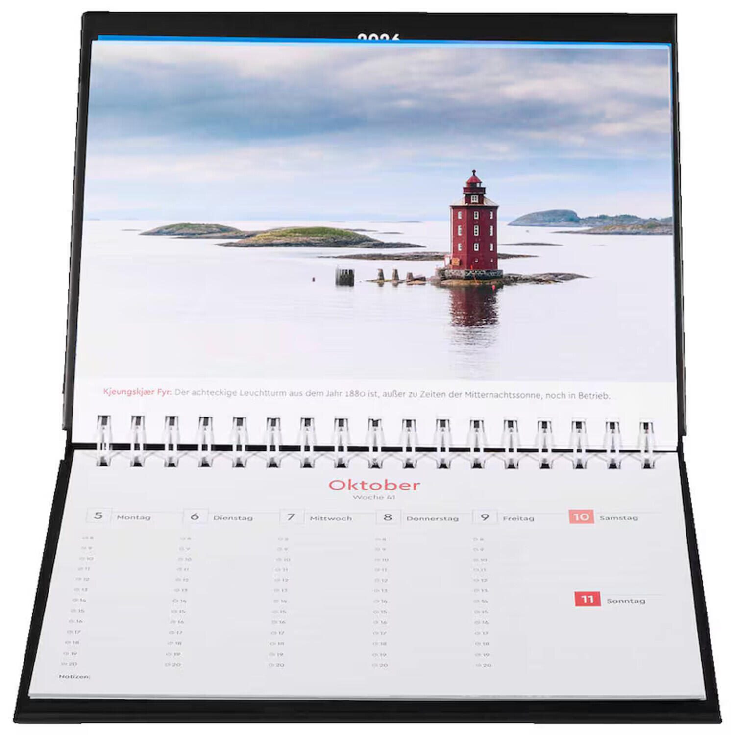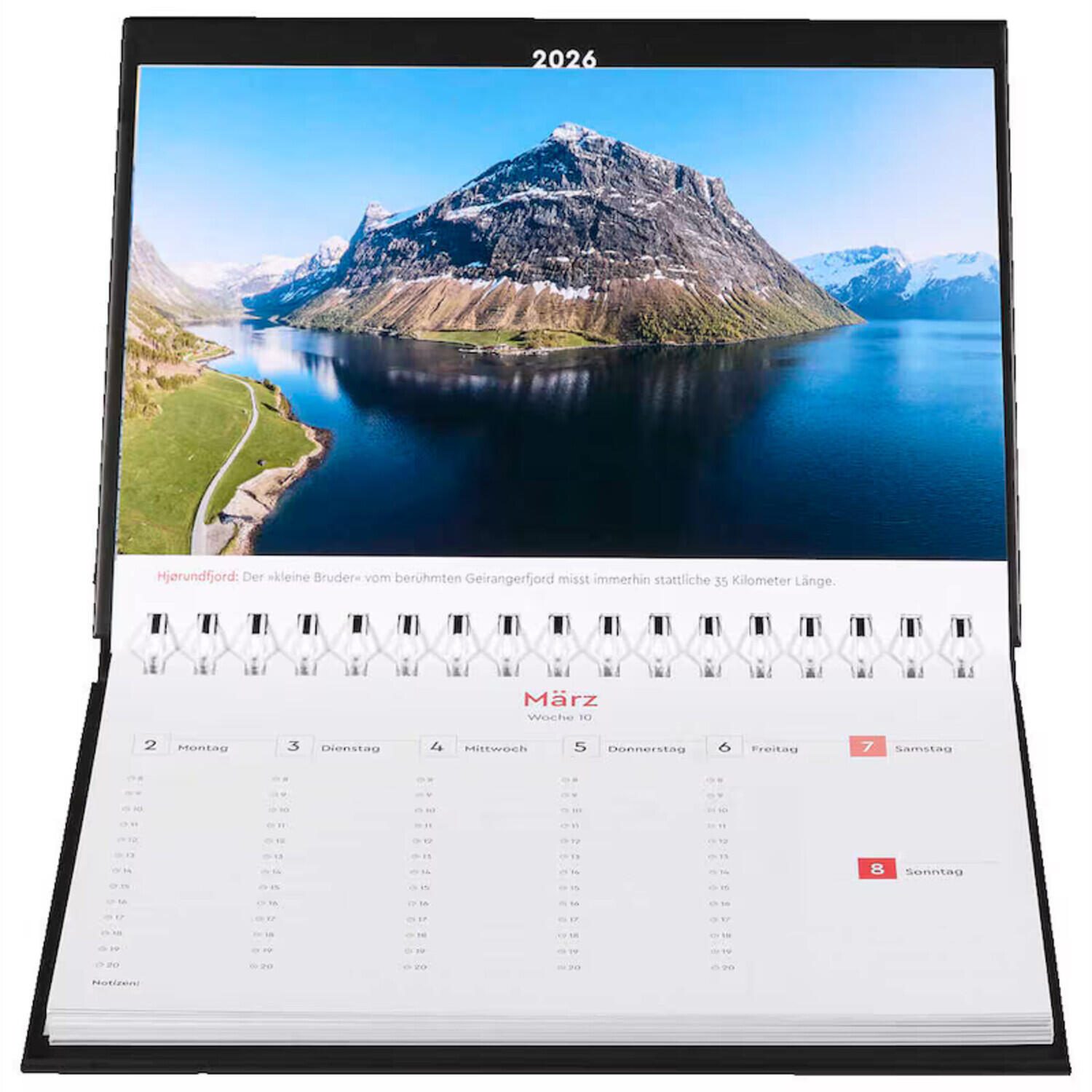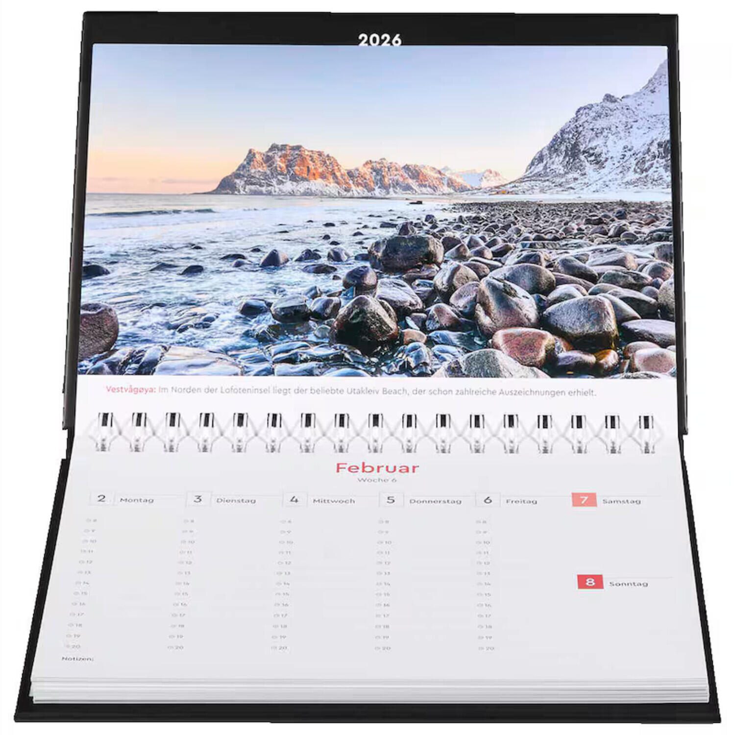 Der KUNTH Tischquerkalender Hurtigruten 2026 ist ein praktischer Bildtischkalender, der sich durch seine handliche Größe von 22,0 x 17,5 cm auszeichnet. Er ist speziell als Querkalender gestaltet und bietet eine übersichtliche Darstellung der Kalenderwochen und Monate im Querformat. Die doppelte Spiralbindung oben sorgt für eine einfache Handhabung und das problemlose Umblättern der einzelnen Kalenderblätter.