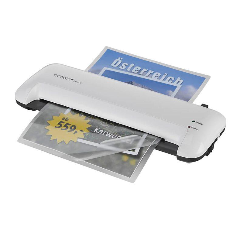 Das GENIE Laminiergerät LA 300 bis DIN A4 ist die ideale Lösung für alle, die ihre Dokumente und Fotos professionell schützen und aufwerten möchten. Mit einem eleganten Design in weiß fügt sich dieses Laminiergerät harmonisch in jedes Büro oder Arbeitsumfeld ein. Die einfache Handhabung und die kompakten Abmessungen machen es zu einem unverzichtbaren Begleiter für Zuhause und im Büro.