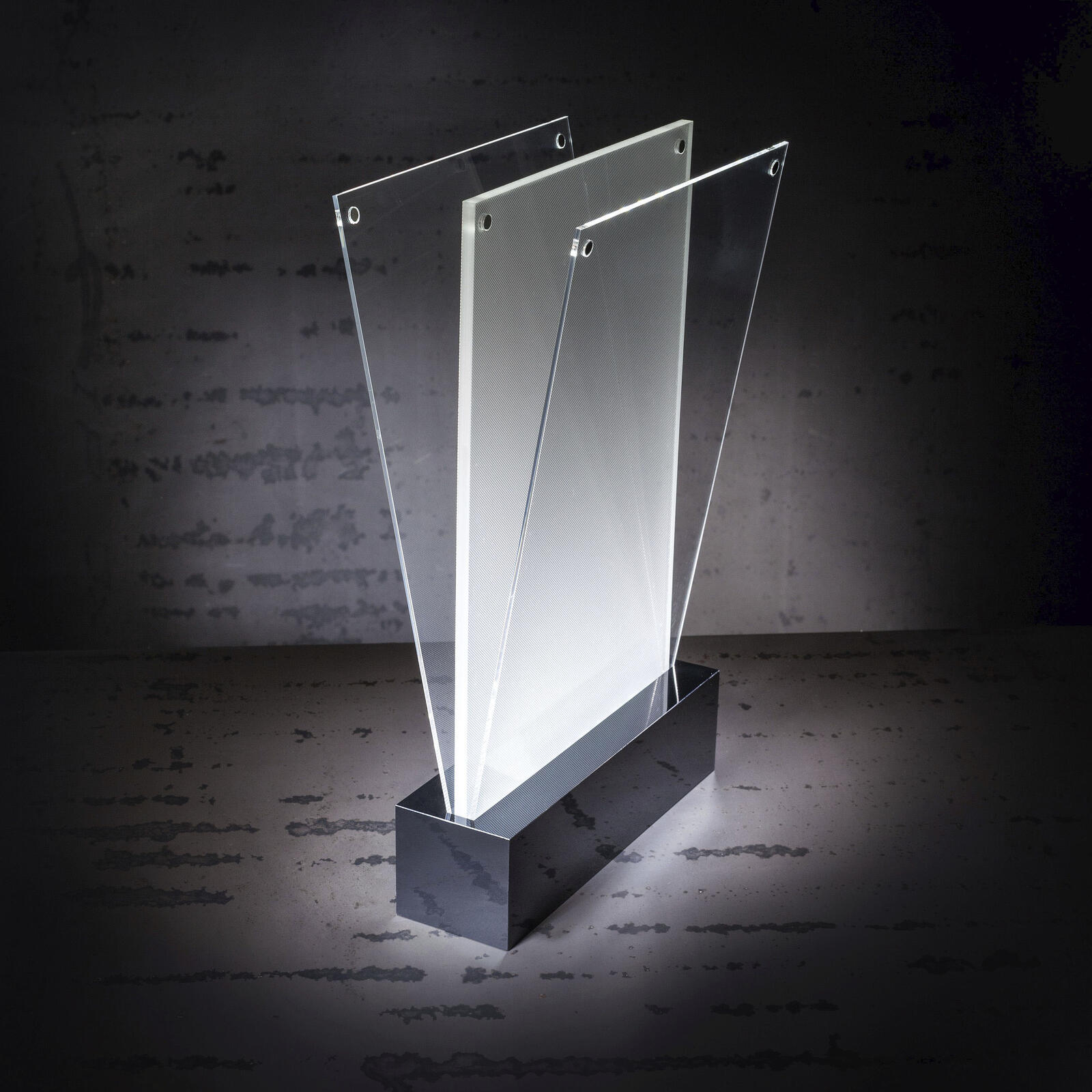 Das Besondere an diesem Aufsteller ist die integrierte LED-Beleuchtung, die deine Inhalte ins rechte Licht rückt und für eine noch bessere Sichtbarkeit sorgt. Egal ob im Restaurant, im Geschäft oder auf Messen, mit diesem Tischaufsteller ziehst du sicher alle Blicke auf dich.