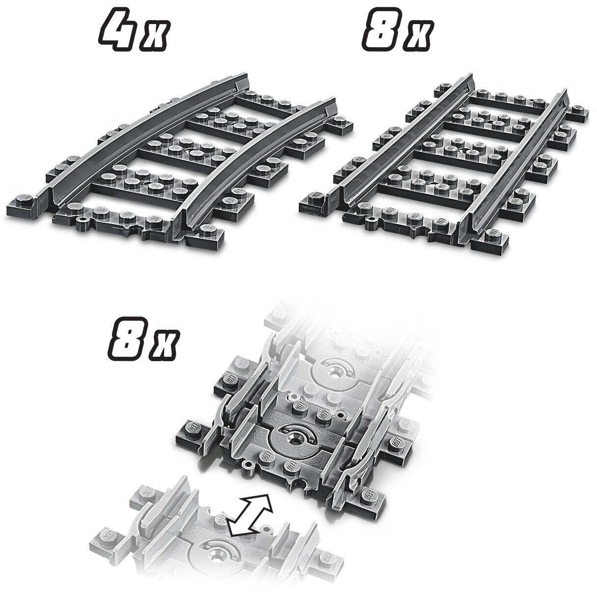 Verbinde die Schienen mit den Schienensträngen aus deinen vorhandenen Sets wie dem LEGO® Personenzug (60197), um noch mehr Bau- und Spielspaß zu erleben.