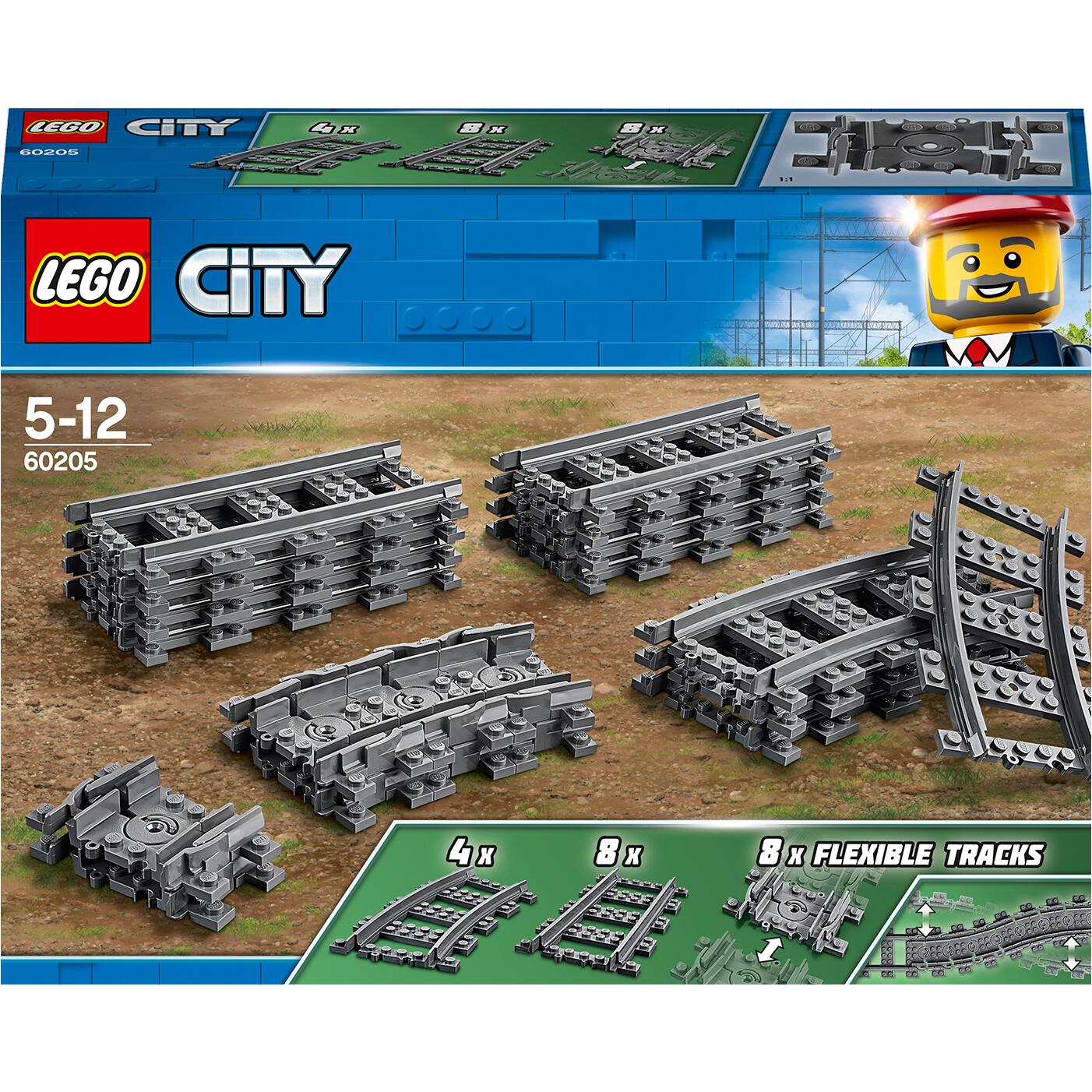 Mit dem LEGO® City Set „Schienen“ (60205) baust du das Schienennetz deines Personenzugs aus. Dieses Set aus 8 geraden, 4 gekrümmten und 8 biegsamen Schienensegmenten bereichert jedes LEGO City Eisenbahnset.