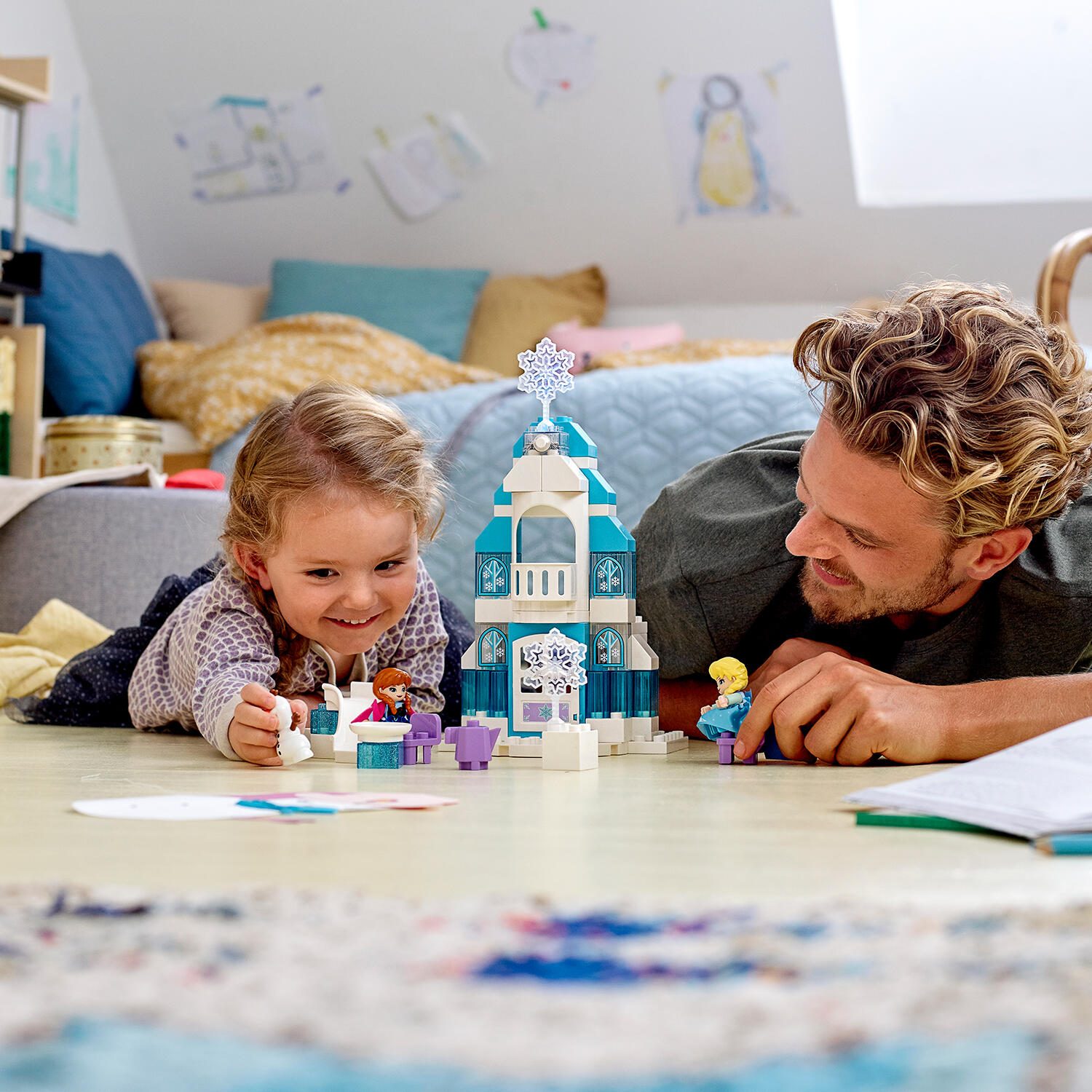 Begib dich gemeinsam mit Anna, Elsa und Olaf zu „Elsas Eispalast“ (10899) aus der LEGO® DUPLO® l Disney Reihe, erlebe gemeinsam mit deinem Kindergartenkind fantasievolle Abenteuer und feiert zusammen kostbare Meilensteine in der Entwicklung. Während dein Kleinkind mit seinen Lieblingsfiguren aus Disneys „Die Eiskönigin“ spielt, fördert es seine Sprachfähigkeiten und die Feinmotorik und entwickelt gleichzeitig ein soziales und emotionales Bewusstsein. Sprecht über Elsas Beziehung zu ihrer Schwester Anna. Erlebt jede Menge kreativen Spaß mit dem Schneemann Olaf. Mit dem mehrfarbigen Leuchtstein, der das Schloss auf Knopfdruck beleuchtet, bieten sich dir und deinem Kleinkind endlose Möglichkeiten: Spielt Szenen aus dem Film „Die Eiskönigin“ nach oder denkt euch eigene Geschichten aus – mit dem glitzernden Spielzeug-Eispalast zum Zusammenbauen.