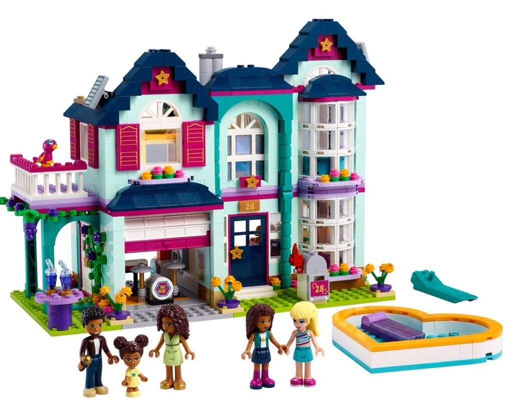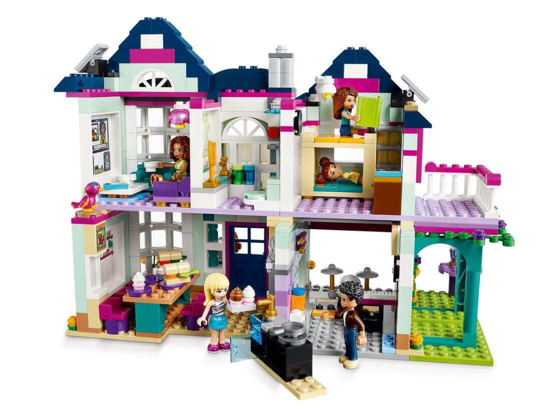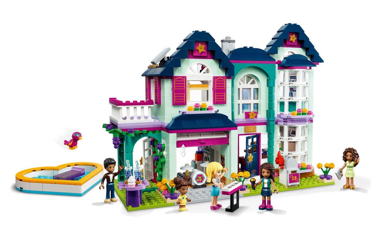 Kinder können sich in Andreas Zimmer treffen oder in der Küche mit den bezaubernden Kochutensilien Cupcakes backen. Es gibt auch einen herzförmigen Pool und ein cooles Garagenstudio mit Musikinstrumenten, wo Andrea undihre Freunde eine Show für die Nachbarn aufführen können! Auf dem Dach befinden sich Solarmodule für einen zeitgemäßen Lebensstil. Das Obergeschoss lässt sich abnehmen, damit kleine Finger alles erkunden können. 5 LEGO® Friends Spielfiguren – darunter auch Andreas kleine Schwester Liz als Mikro-Figur (neu ab Januar 2021) – bieten Kindern unzählige Spielmöglichkeiten, um den LEGO® Familienalltag nachzustellen. In Heartlake City finden Kinder Freunde, mit denen sie die gleichen Interessen teilen!