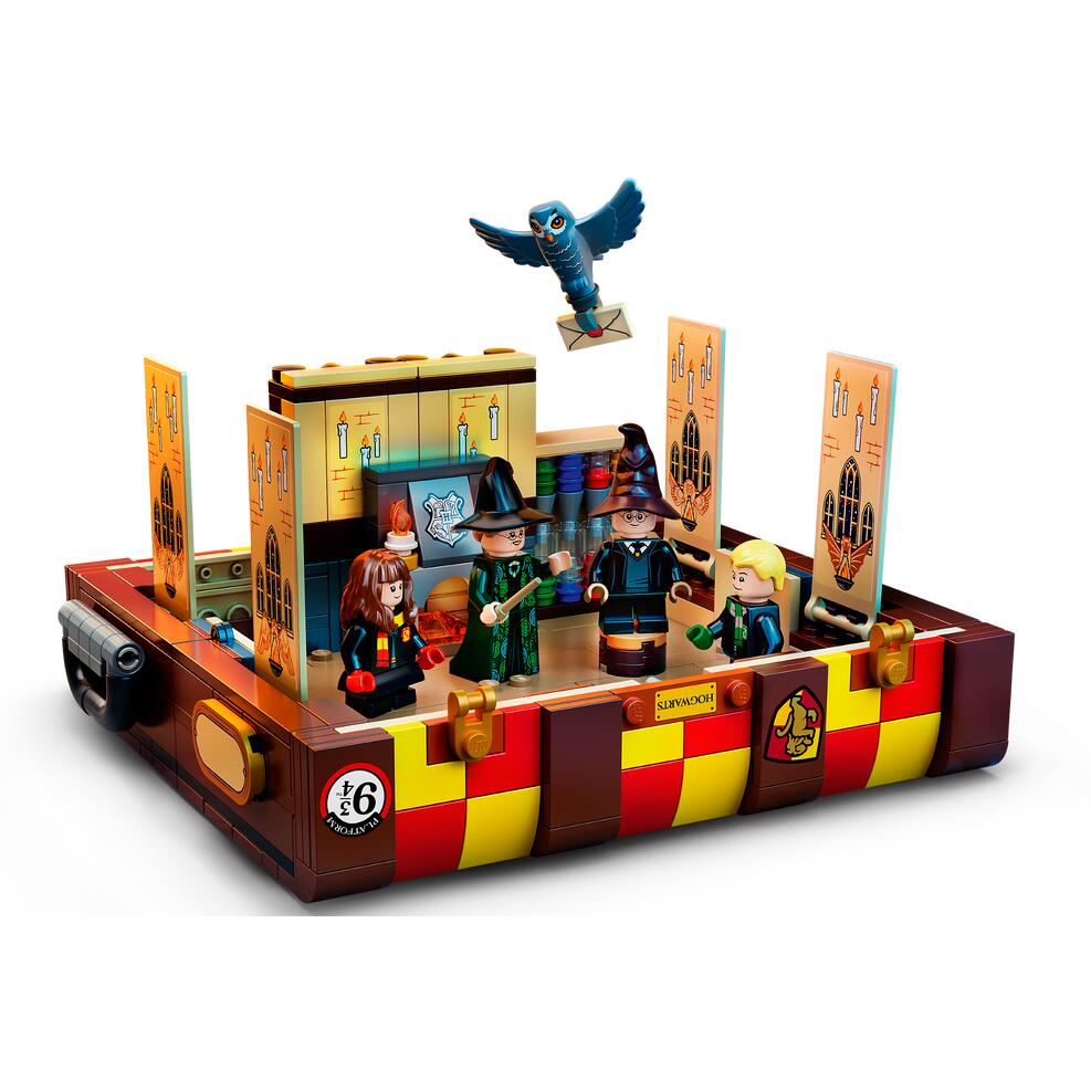 Dein Kind kann diesen Koffer aus LEGO Steinen mit den Farben seines Lieblingshauses auf Hogwarts und mit verschiedenen Aufklebern schmücken, genau wie es die Hogwarts-Schüler im Film gemacht haben. Das Set beinhaltet unter anderem viele Minifigur-Teile – darunter auch verschiedene Haarteile und unterschiedliche Hauttöne – damit dein Kind bis zu 5 Charaktere aus den Harry Potter Filmen bauen oder neue eigene Hogwarts-Schüler erschaffen kann. Eine große Auswahl an anpassbaren Möbeln und Zubehörelementen lässt dein Kind fantasievolle Abenteuer auf Hogwarts darstellen. Auch drei klassische Filmszenen können nachgestellt werden: die Zuordnungszeremonie, das Fest in der Großen Halle und der Gemeinschaftsraum. Wenn das Spektakel dann erst einmal vorbei ist, lässt sich alles ordentlich im Koffer verstauen. Dann kann dein Kind die Hogwarts-Magie überallhin mitnehmen.