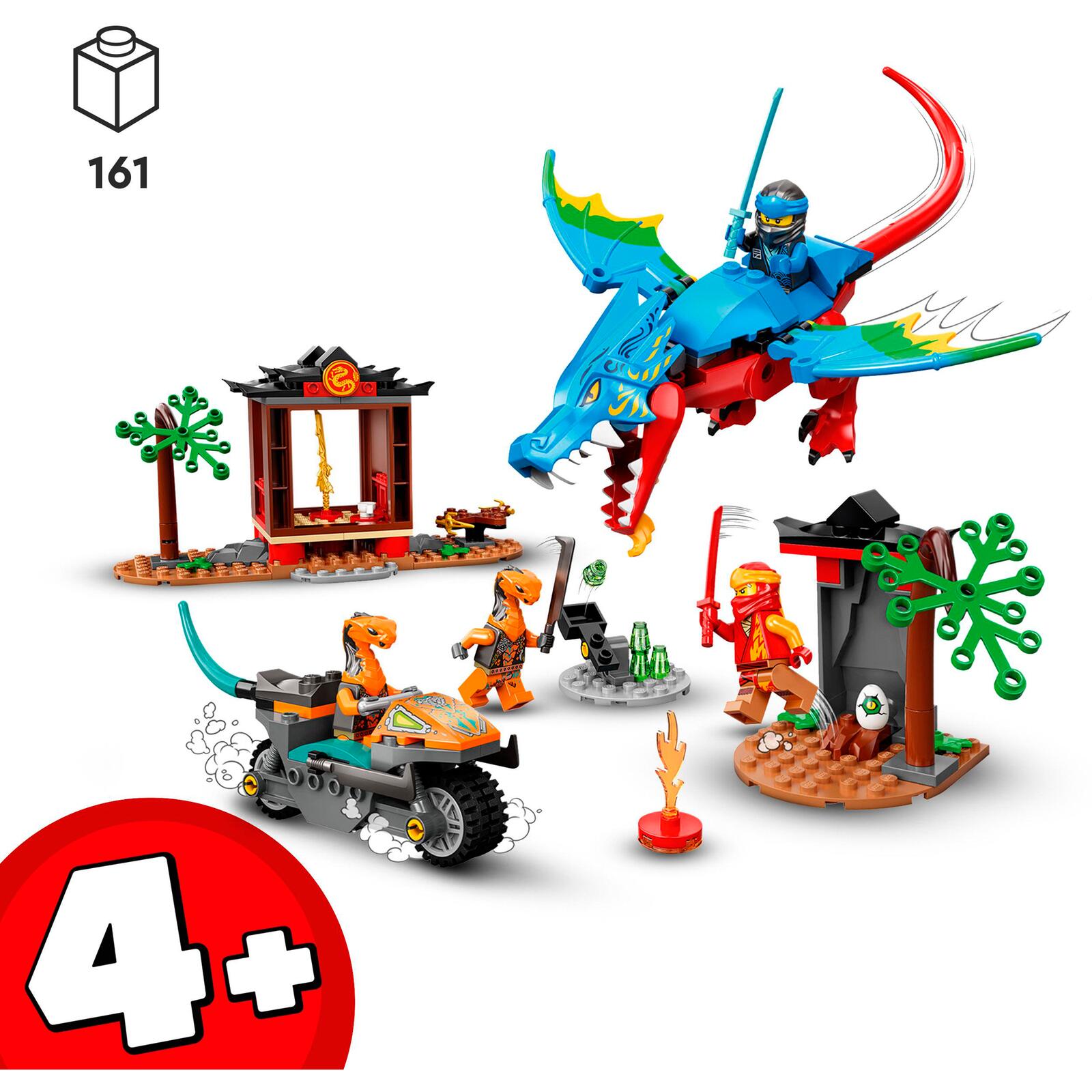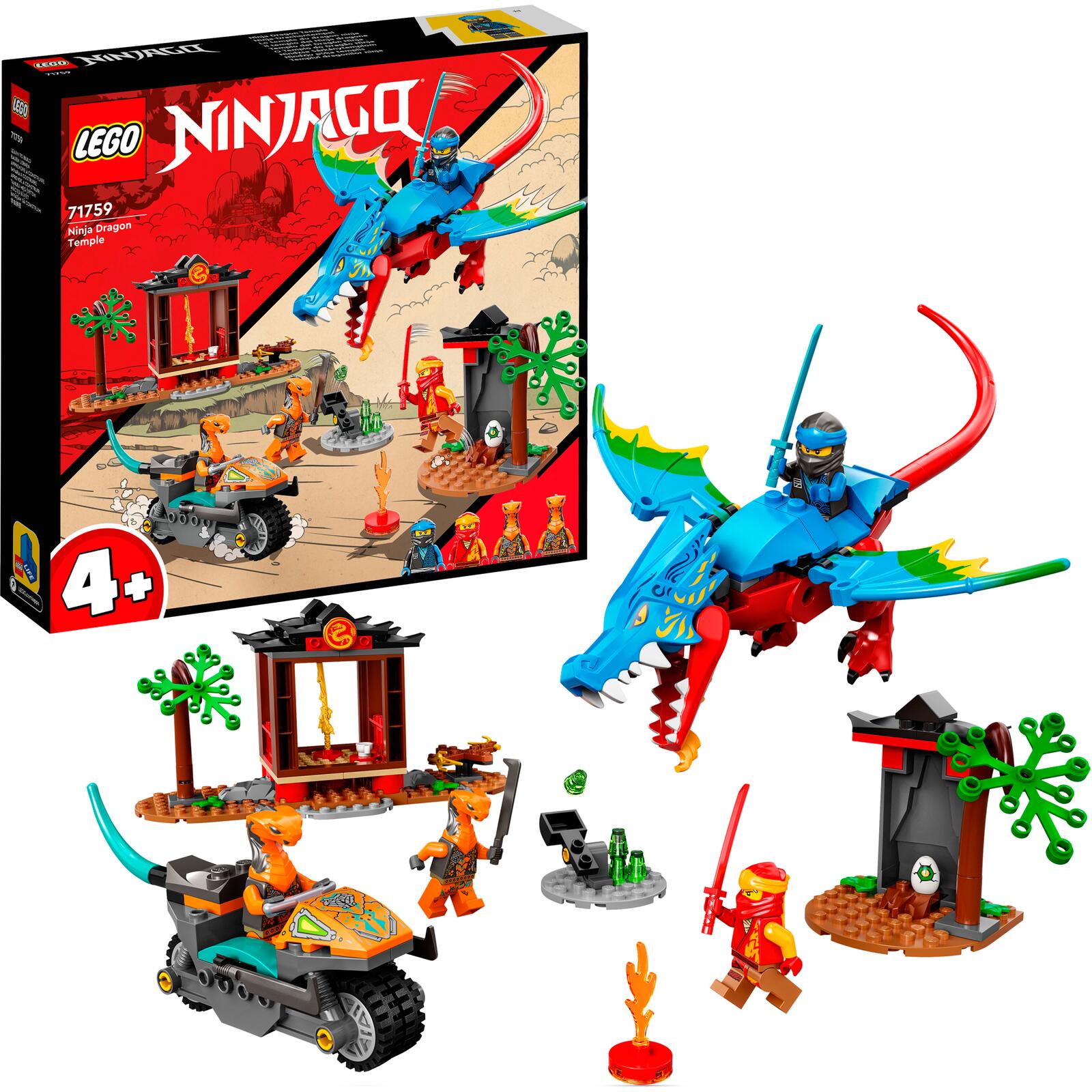 Der Drachentempel (71759) ist ein Spielset, das Kindern ab 4 Jahren das Bauen beibringt. Das Set beinhaltet einen beweglichen Drachen, 2 Ninja-Tempel, 2 bewegliche Bäume, ein Drachen-Ei und 4 Minifiguren: die Ninja Kai und Nya sowie die beiden Bösewichte Kobra-Mech und Listige Schlange.