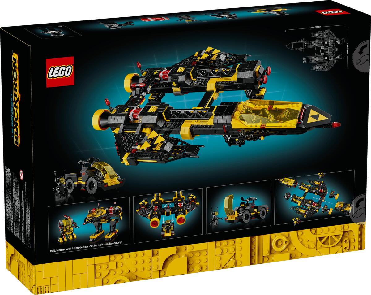 Die asymmetrische Blacktron Renegade besteht aus verschiedenen Modulen und bietet zahlreiche neue Funktionen, darunter eine Absetzkapsel für den Planeten-Rover, ein Fahrwerk, zwei Weltraum-Speeder an den Flügeln sowie zwei Treibstoffkanister für die Triebwerke. Zum Set gehören außerdem drei Blacktron-Minifiguren und ein Droide. Mit der online verfügbaren Bauanleitung in der LEGO Builder App kannst du das Modell sogar in eine optimierte Version der LEGO Alienator aus den 1980er-Jahren umbauen. Hier kannst du auch 3D-Modellansichten vergrößern und drehen, deine liebsten LEGO Sets abspeichern und deinen Baufortschritt verfolgen.