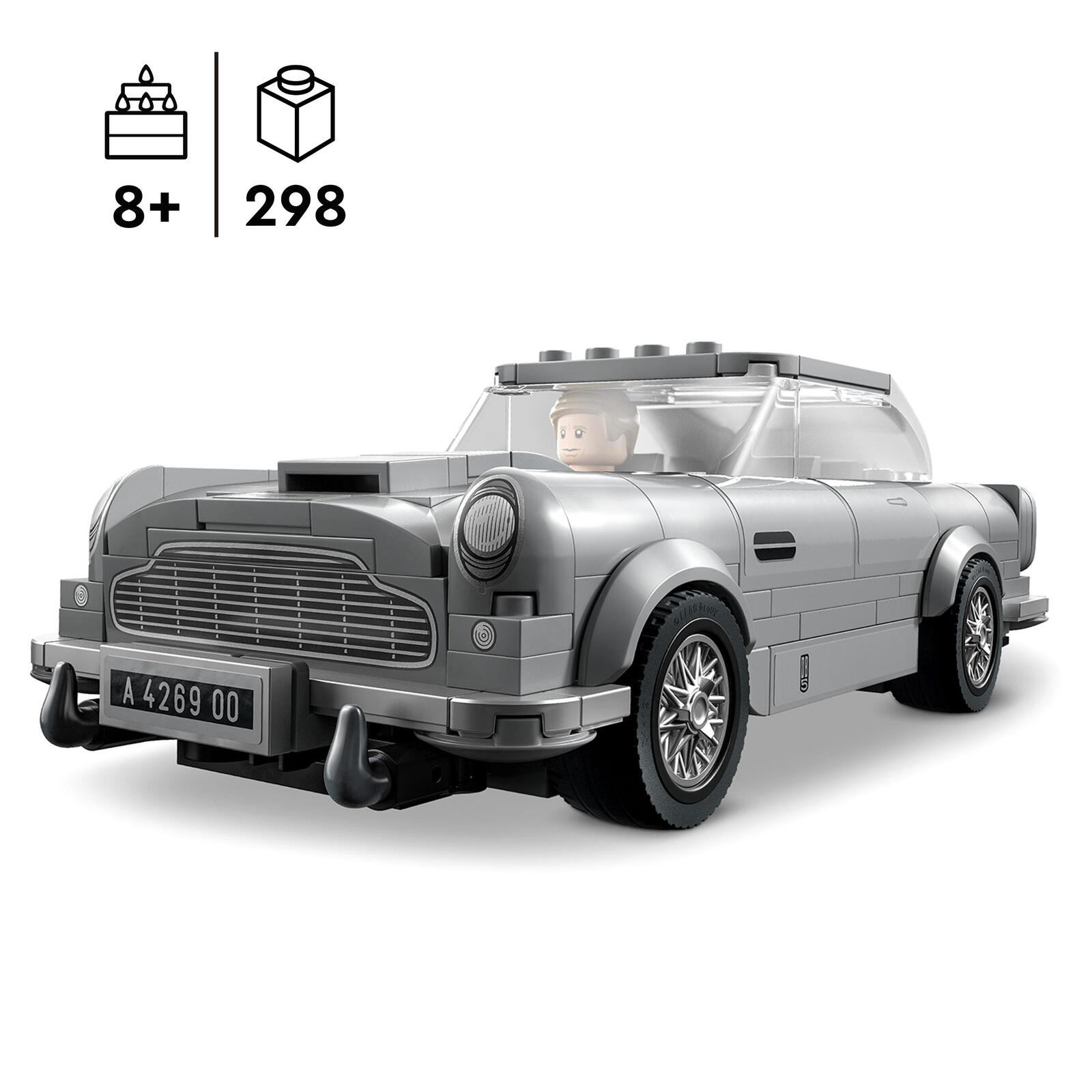 Der Aston Martin DB5 Sportwagen verfügt über silberfarbene Speichenfelgen und 4 zusätzliche Nummernschildsätze aus unterschiedlichen James-Bond-Filmen. Vervollständigt wird das Sammlerstück durch die Minifigur, die James Bond aus Keine Zeit zu sterben darstellt.