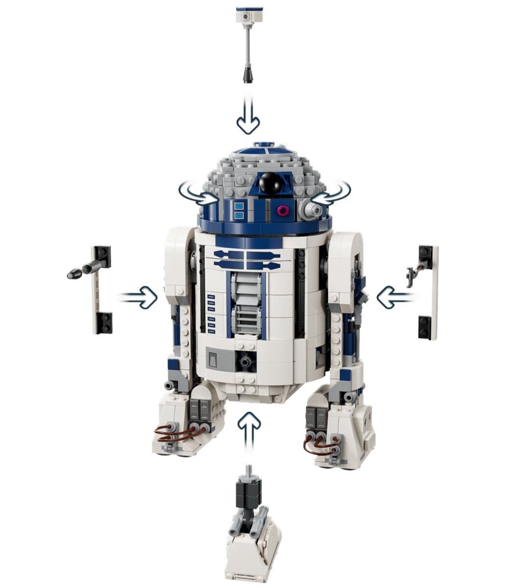 Detailgetreues Modell zum Bauen und Ausstellen mit verspielten Details: Man kann den Kopf von R2-D2 um 360 Grad drehen, ein drittes Bein anbringen, damit er sich bewegen kann, und ein Sehrohr und Werkzeug an ihm befestigen