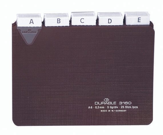 Das DURABLE Karteikartenregister ist die ideale Lösung, um deine Unterlagen übersichtlich zu organisieren. Mit einem eleganten, braunen Design fügt es sich harmonisch in jedes Büro oder Home-Office ein. Dieses Register ist mit 25 Taben ausgestattet, die von A-Z sowie für die Monate Januar bis Dezember und die Tage 0-31 unterteilt sind. So hast du jederzeit schnellen Zugriff auf die benötigten Informationen. Das Karteikartenregister ist speziell für DIN A6 quer konzipiert, wodurch es perfekt in gängige Karteikästen passt. Hergestellt aus robustem Kunststoff, bietet es nicht nur eine ansprechende Optik, sondern auch eine hohe Langlebigkeit. Die blanko Taben ermöglichen es dir, individuelle Beschriftungen vorzunehmen, sodass du deine Karten nach deinen eigenen Bedürfnissen anordnen kannst. Dank der variablen Teilung kannst du das Register flexibel anpassen und an deine spezifischen Anforderungen anpassen. Ob für die persönliche Organisation, im Studium oder im Berufsleben – dieses Karteikartenregister unterstützt dich dabei, den Überblick zu behalten und deine Dokumente strukturiert zu verwalten. Die praktische Handhabung und die durchdachte Gestaltung machen das DURABLE Karteikartenregister zu einem unverzichtbaren Hilfsmittel für jeden, der Wert auf Ordnung und Effizienz legt. Vertraue auf die Qualität von DURABLE und genieße die Vorteile eines gut organisierten Arbeitsplatzes.Technische Daten