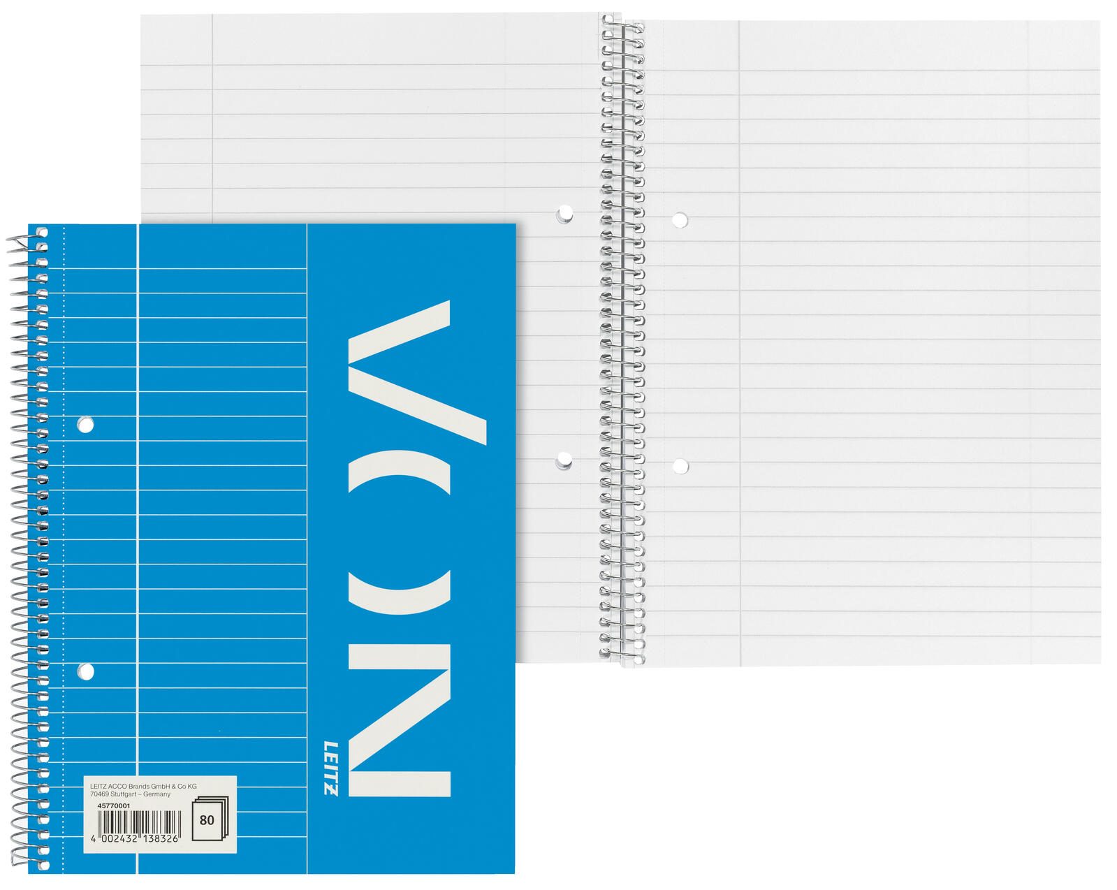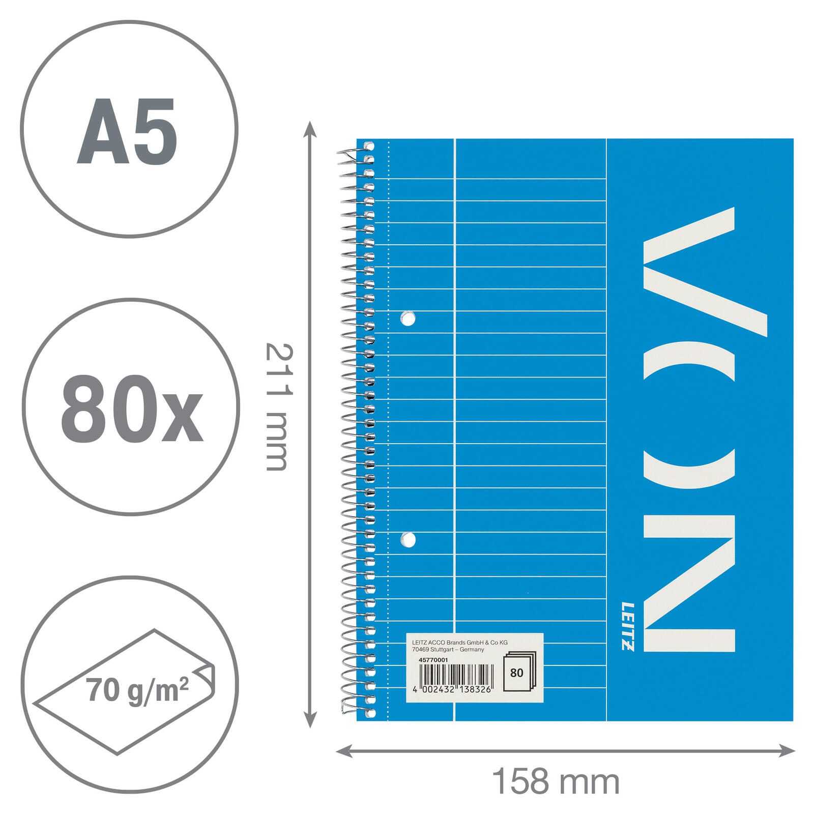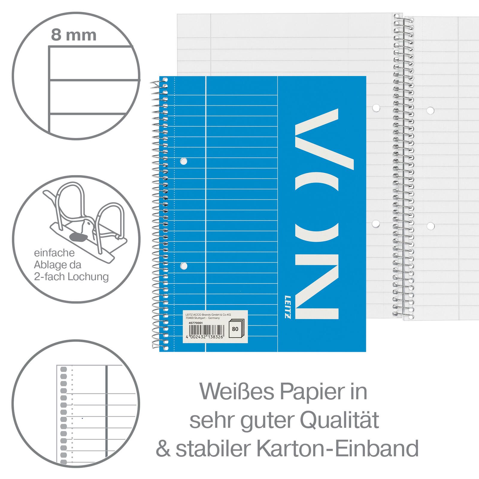 Der LEITZ Collegeblock im Format DIN A5 bietet mit 80 Blättern ausreichend Platz für Notizen, Mitschriften und Skizzen. Das Papier hat ein Gewicht von 70 g/m² und ist in einem klaren Weiß gehalten, was ein angenehmes Schriftbild ermöglicht. Die Blätter sind liniert und verfügen über eine Randlinie auf der Innenseite, die das ordentliche Schreiben erleichtert und für eine strukturierte Gestaltung sorgt.