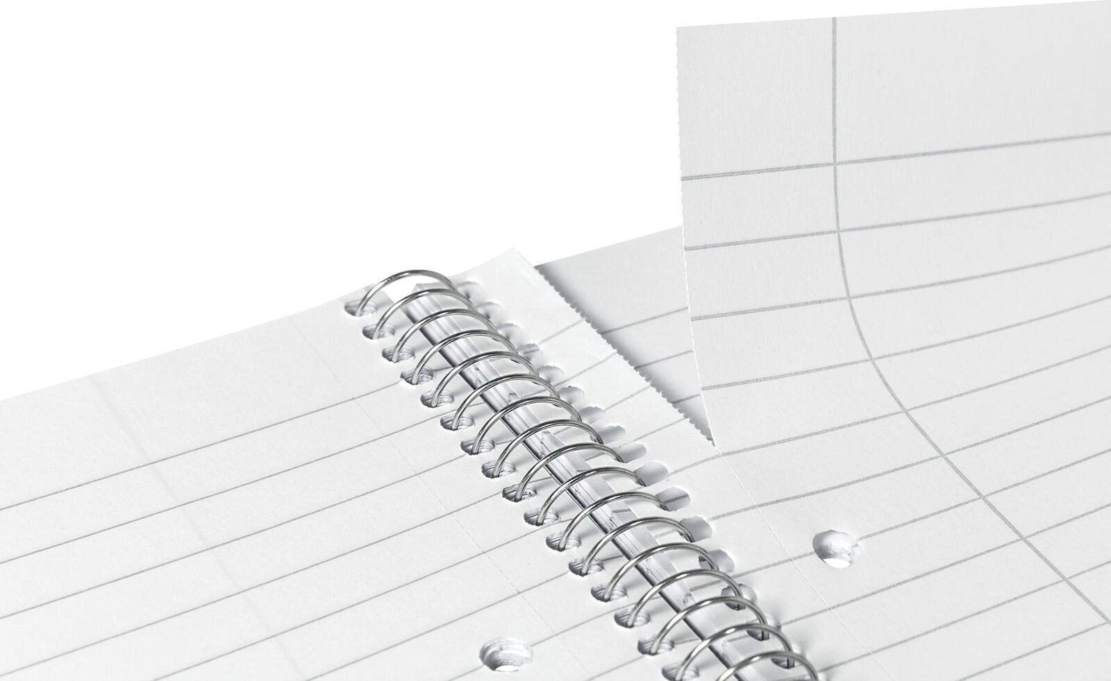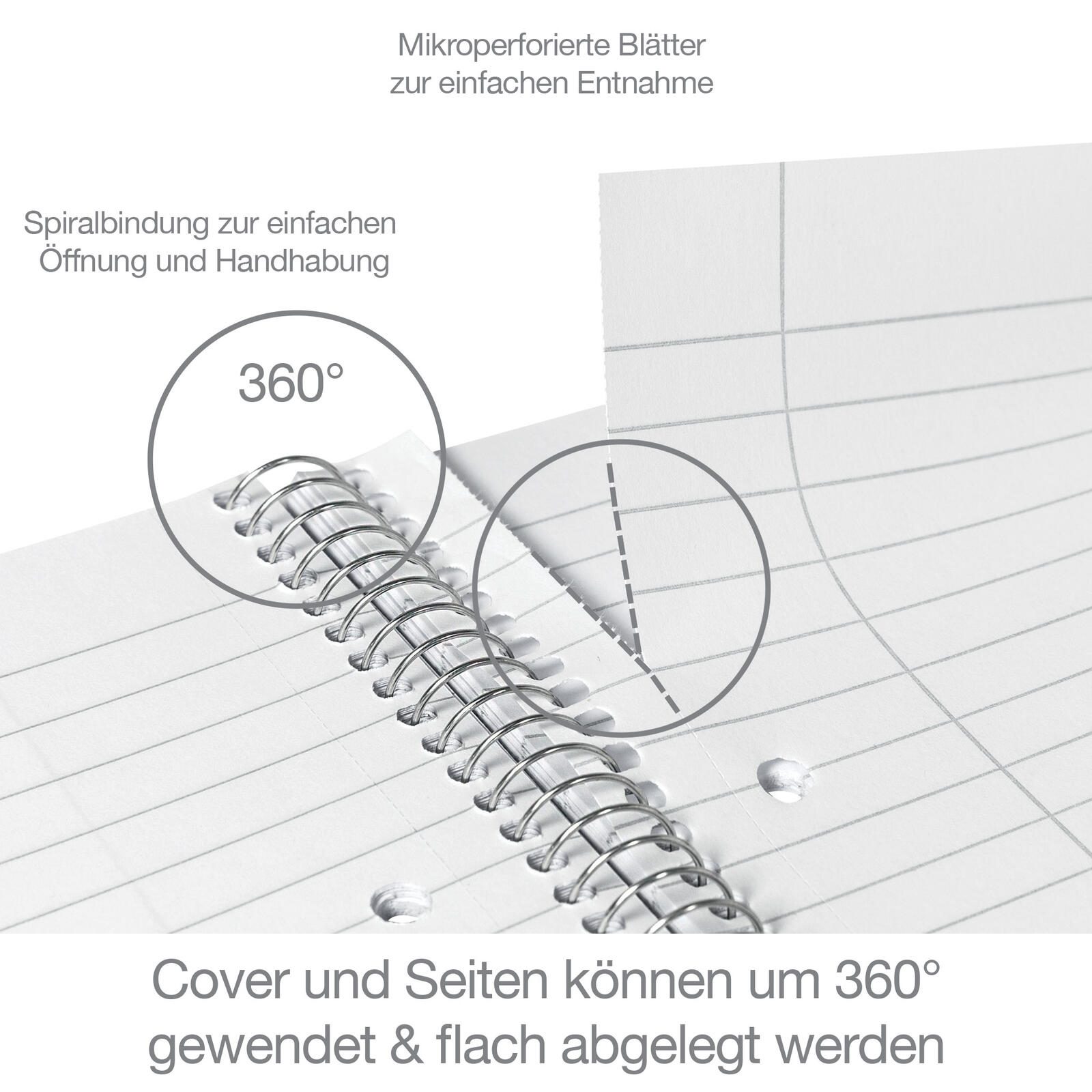 Die Spiralbindung sorgt für eine einfache Handhabung und ermöglicht das vollständige Umklappen des Blocks, sodass Du bequem auf jeder Seite schreiben kannst. Zusätzlich sind die Blätter mikroperforiert, was ein sauberes Herausnehmen einzelner Seiten erleichtert. Die Lochung ist so gestaltet, dass die Blätter problemlos in Ordner eingeheftet werden können, was die Organisation und Aufbewahrung Deiner Notizen unterstützt.