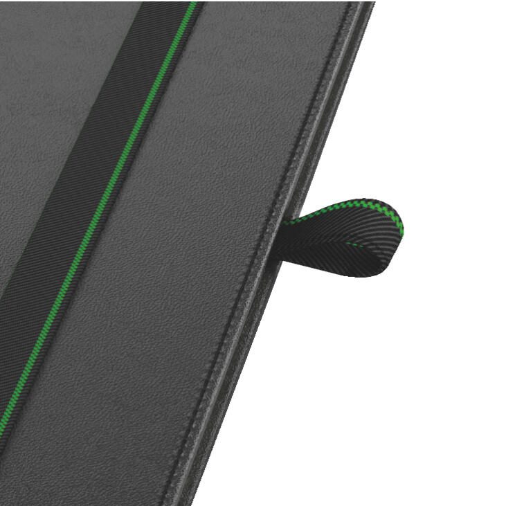 Das Notizbuch ist mit einer Fadensiegelung gebunden, die für eine stabile und langlebige Verbindung der Seiten sorgt. Der Einband besteht aus Karton mit einem Kunstlederbezug, der dem Produkt eine hochwertige Optik und Haptik verleiht. Die Farbe des Einbands ist schwarz, was dem Notizbuch ein professionelles und zeitloses Erscheinungsbild verleiht.