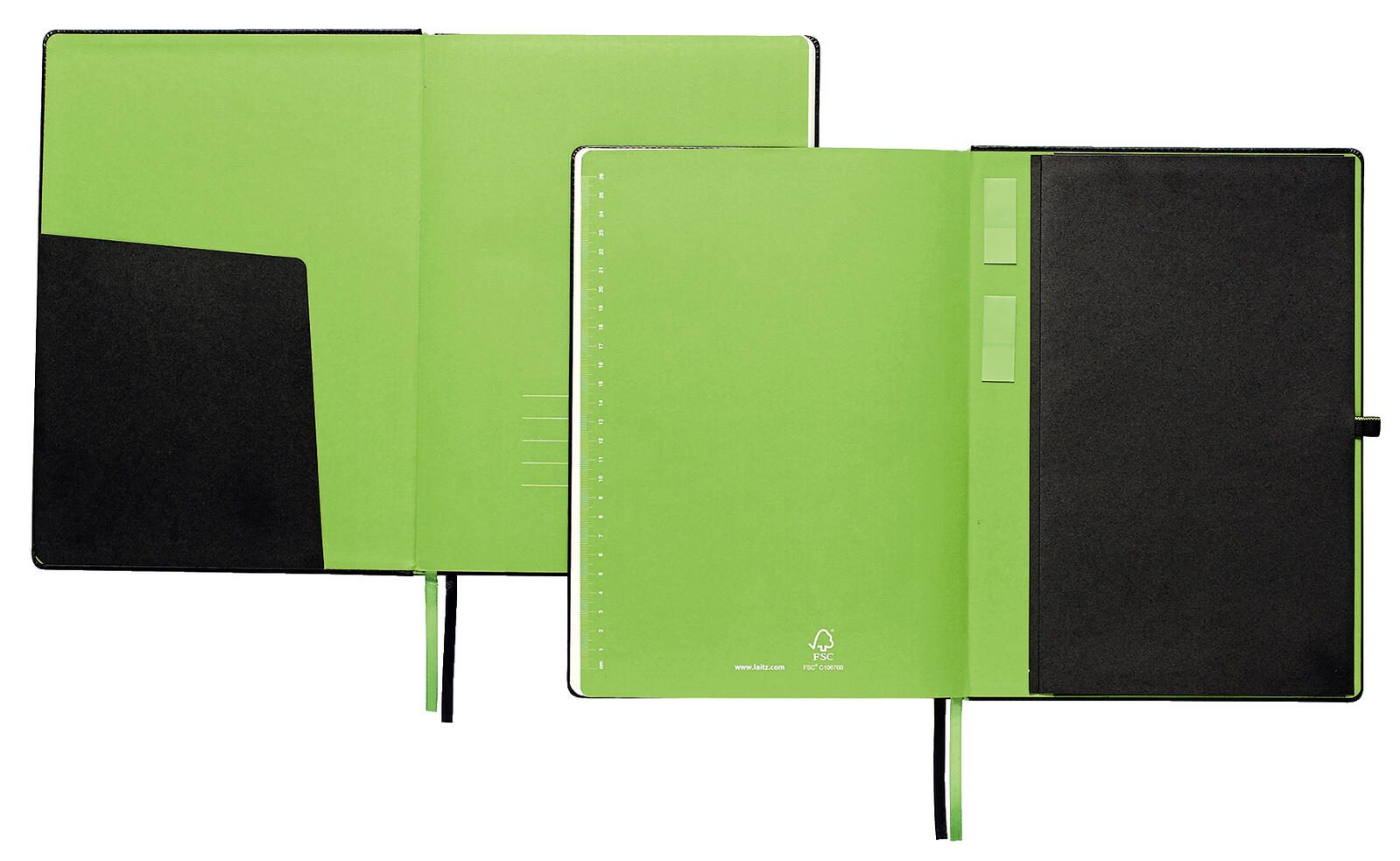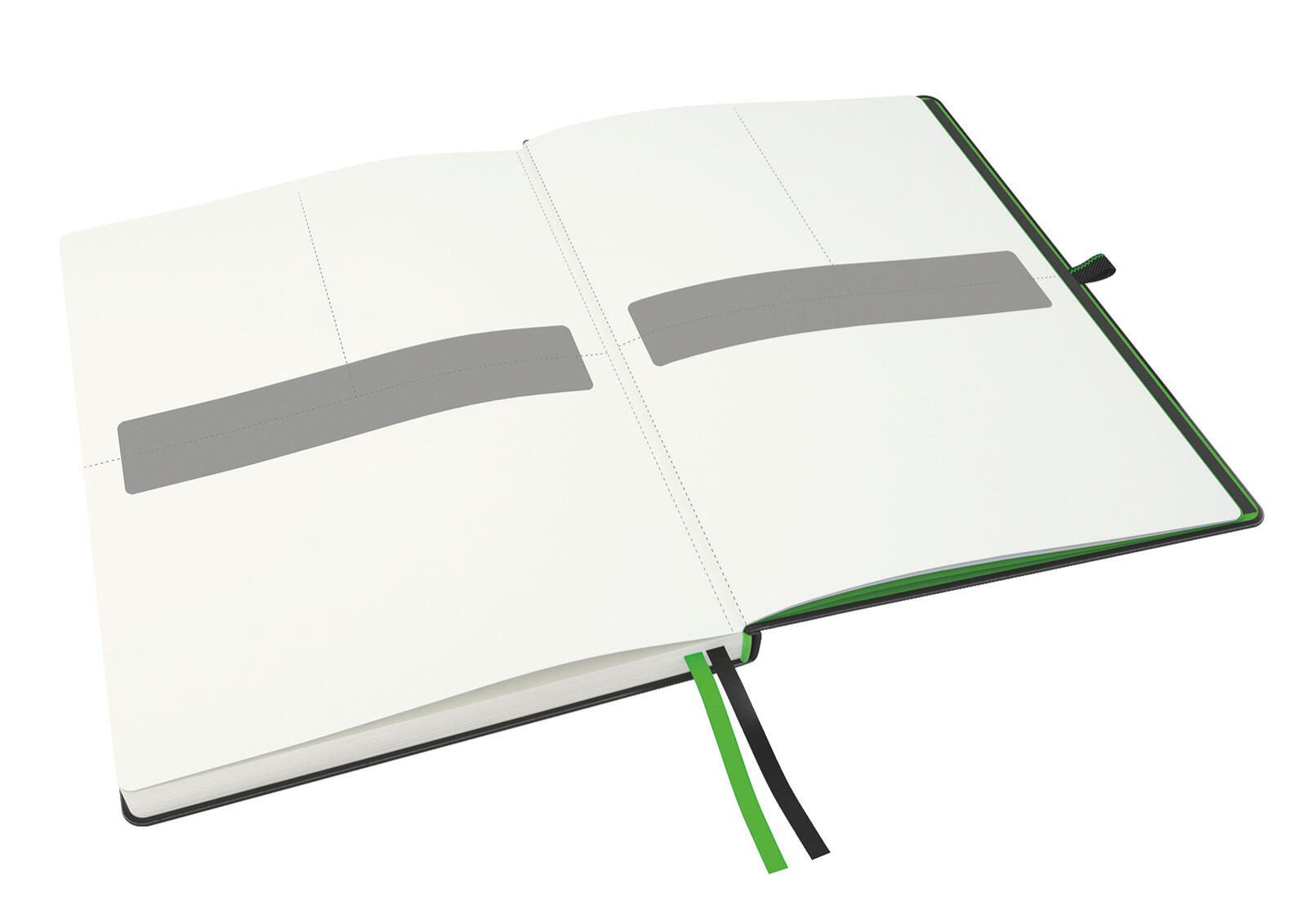 Die Seiten verfügen über einen Rand rundum mit Kopfzeile, der das ordentliche und strukturierte Schreiben unterstützt. Das Papier ist holzfrei und abwischbar, was eine saubere Nutzung ermöglicht. Das Notizbuch gehört zur Serie „Complete“ von LEITZ und ist speziell für den Einsatz als Geschäftsbuch konzipiert.