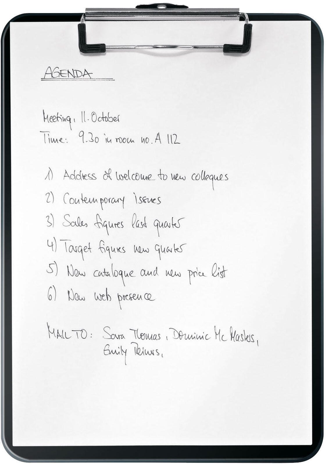 Das LEITZ Klemmbrett DIN A4 in elegantem Schwarz ist der ideale Begleiter für alle, die Wert auf Funktionalität und Stil legen. Mit den kompakten Maßen von 22,8 x 32,0 cm passt es perfekt in jede Aktentasche oder jeden Rucksack und ist somit immer griffbereit, egal ob im Büro, in der Schule oder bei Präsentationen. Hergestellt aus hochwertigem Polystyrol, bietet dieses Klemmbrett nicht nur eine ansprechende Optik, sondern auch eine außergewöhnliche Stabilität. Die robuste Bauweise gewährleistet, dass deine Unterlagen sicher gehalten werden, während der Metallclip an der kurzen Seite dafür sorgt, dass bis zu 80 Blätter festgehalten werden können. So hast du immer einen ordentlichen und professionellen Auftritt, ganz gleich, ob du Notizen machst oder Dokumente präsentierst. Die schlichte schwarze Farbe verleiht dem Klemmbrett eine zeitlose Eleganz, die sich mühelos in jede Umgebung einfügt. Der Clip in Nickel sorgt für einen modernen Akzent und rundet das Gesamtbild harmonisch ab. Mit diesem Klemmbrett bringst du nicht nur Ordnung in deine Unterlagen, sondern setzt auch ein stilvolles Statement. Das LEITZ Klemmbrett ist speziell für das Format DIN A4 konzipiert, was es zu einem unverzichtbaren Utensil für jeden macht, der regelmäßig mit diesem Papierformat arbeitet. Egal, ob du es für wichtige Meetings, kreative Brainstorming-Sessions oder einfach für den täglichen Gebrauch benötigst, dieses Klemmbrett wird dir stets treue Dienste leisten und dabei helfen, deine Ideen und Notizen übersichtlich zu halten.Technische Daten