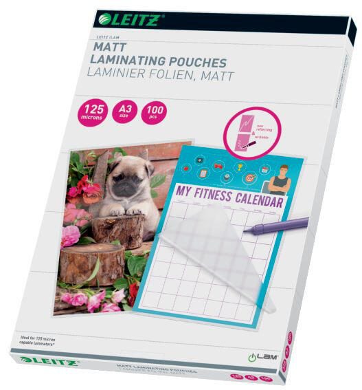 Die LEITZ Laminierfolien matt mit einer Stärke von 125 Mikron in der Größe A3 bieten eine hervorragende Möglichkeit, Dokumente und wichtige Unterlagen professionell zu schützen und aufzuwerten. Diese hochwertigen Laminierfolien sind ideal für alle, die ihre Materialien vor Abnutzung, Feuchtigkeit und Schmutz bewahren möchten. Mit einer Packung, die 100 Stück umfasst, bist du bestens ausgestattet für eine Vielzahl von Laminierprojekten. Die matte Oberfläche dieser Folien sorgt nicht nur für einen eleganten Look, sondern minimiert auch störende Reflexionen, was besonders bei Präsentationen von Vorteil ist. Die Folien sind aus robustem Polyester (PET) gefertigt und verfügen über eine Klebeschicht aus Ethyl-Vinyl-Acetat (EVA), die eine dauerhafte und zuverlässige Versiegelung gewährleistet. Du kannst dich darauf verlassen, dass deine Dokumente in einem optimalen Zustand bleiben, ohne dass sich die Folien im Laufe der Zeit abnutzen oder ablösen. Mit den abgerundeten Ecken bieten die Laminierfolien nicht nur eine ansprechende Optik, sondern verhindern auch ein ungewolltes Abplatzen der Ecken, was die Haltbarkeit weiter erhöht. Diese Folien sind speziell für das Format A3 konzipiert und eignen sich somit ideal für größere Dokumente, Plakate oder Präsentationen. Die Verwendung ist denkbar einfach: einfach das Dokument zwischen die Folien legen und laminieren – so schaffst du im Handumdrehen professionelle Ergebnisse. Die LEITZ Laminierfolien matt sind die perfekte Wahl für Schulen, Büros oder für den privaten Gebrauch. Sie bieten nicht nur Schutz, sondern verleihen deinen Dokumenten auch eine ansprechende und langlebige Oberfläche. Ob für wichtige Präsentationen, kreative Bastelprojekte oder das Archivieren von Dokumenten – mit diesen Laminierfolien machst du alles richtig.Technische Daten