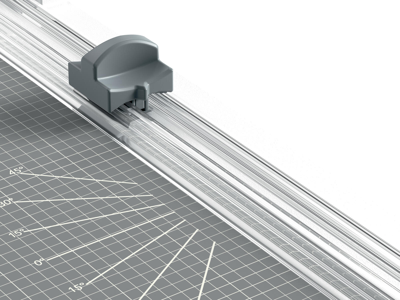 Eine herausragende Besonderheit des LEITZ Rollenschneiders ist die durchsichtige Papierklemme, die sich flexibel nach oben und unten klappen lässt. Dies erleichtert das Einlegen des Papiers erheblich und gewährleistet, dass Ihr Material stets sicher fixiert ist. Zudem bietet das einfache metrische Ableselineal eine mühelose Papierausrichtung, sodass Sie sich auf präzise Schnitte konzentrieren können, ohne sich um die Ausrichtung sorgen zu müssen.