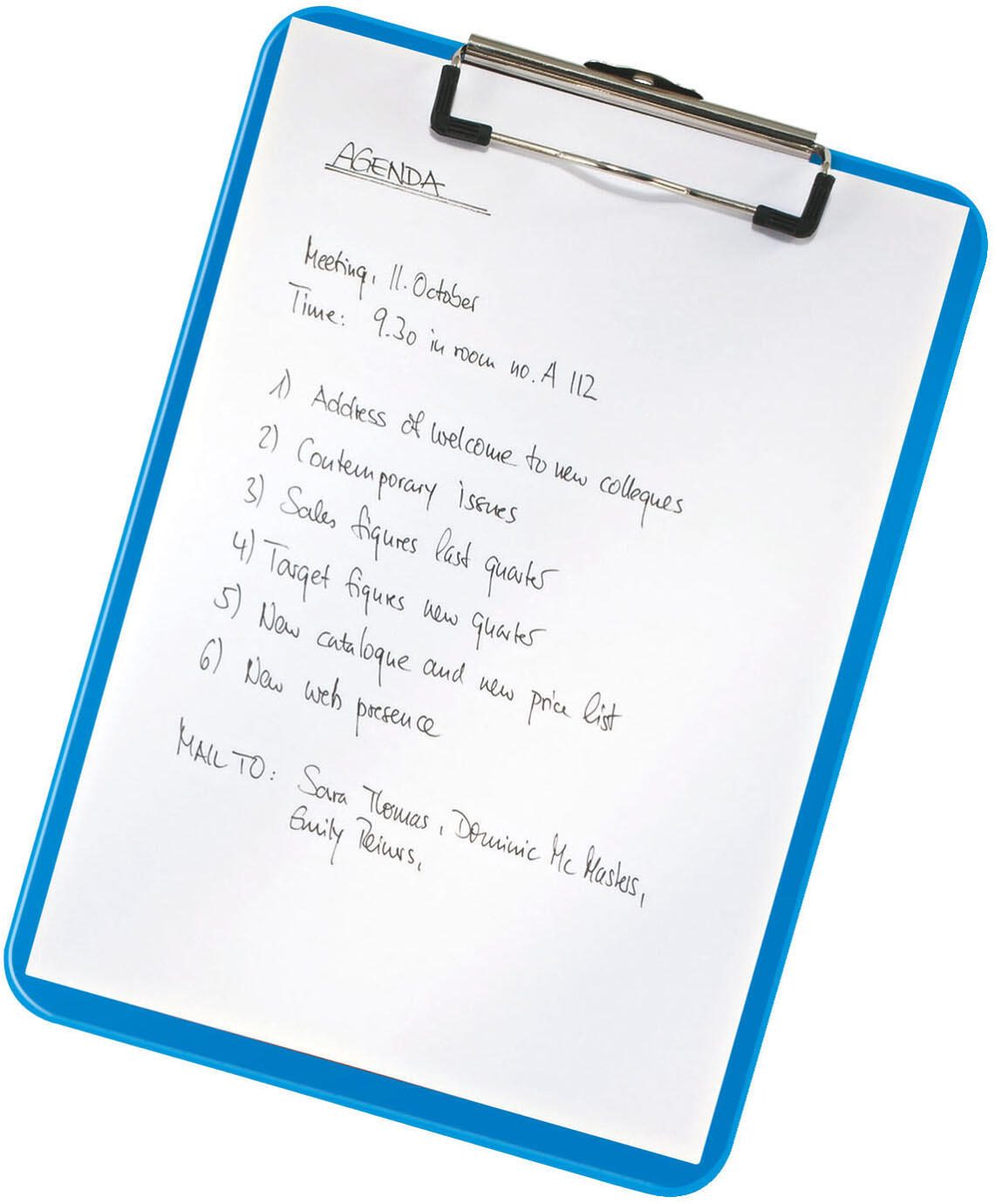 Das LEITZ Klemmbrett DIN A4 in einem ansprechenden Blau ist der ideale Begleiter für alle, die Ordnung und Stil schätzen. Mit seinen kompakten Maßen von 22,8 x 32,0 cm bietet es ausreichend Platz für deine Dokumente im Format DIN A4 und fasst bis zu 80 Blatt. Dieses Klemmbrett ist nicht nur funktional, sondern auch ein echter Hingucker, der in jedem Büro oder bei Präsentationen für einen professionellen Eindruck sorgt. Hergestellt aus hochwertigem Polystyrol, zeichnet sich das Klemmbrett durch seine Langlebigkeit und Stabilität aus. Die Klemme aus Metall in Nickel sorgt dafür, dass deine Unterlagen sicher fixiert sind, während die Anordnung der Klemme an der kurzen Seite eine einfache Handhabung ermöglicht. Ob bei Meetings, im Studium oder beim kreativen Arbeiten – mit dem LEITZ Klemmbrett hast du deine Unterlagen stets griffbereit und ordentlich verstaut. Die leuchtende blaue Farbe verleiht dem Klemmbrett eine frische Note und hebt sich angenehm von anderen Büromaterialien ab. Es ist nicht nur praktisch, sondern auch ein stilvolles Accessoire, das deinen Arbeitsplatz aufwertet. Das LEITZ Klemmbrett ist die perfekte Wahl für alle, die Wert auf Qualität und Design legen und gleichzeitig ihre Dokumente sicher und organisiert aufbewahren möchten.Technische Daten