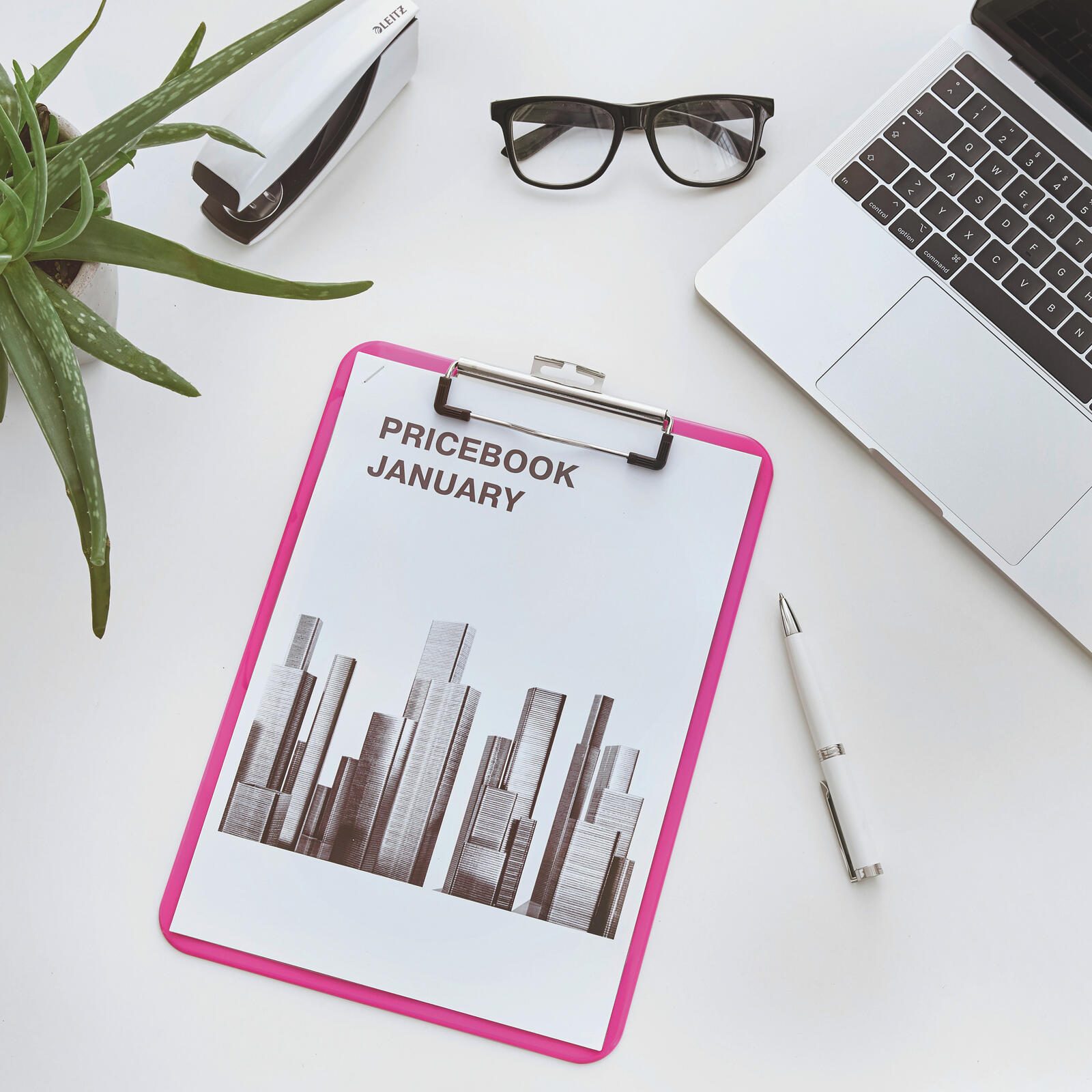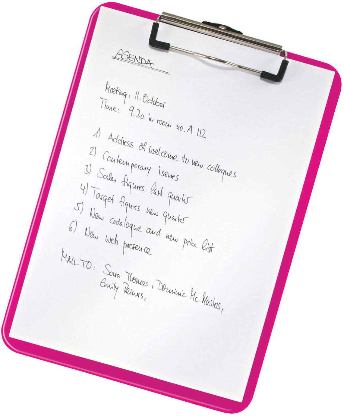 Das LEITZ Klemmbrett DIN A4 in einem ansprechenden pinken Farbton ist nicht nur ein praktisches, sondern auch ein stilvolles Accessoire für Schule, Büro oder kreative Projekte. Mit seinen Maßen von 22,8 x 32,0 cm bietet es ausreichend Platz für bis zu 80 Blatt, sodass du deine Unterlagen stets ordentlich und übersichtlich präsentieren kannst. Hergestellt aus hochwertigem Polystyrol, überzeugt das Klemmbrett durch seine Langlebigkeit und Stabilität. Die Klemme aus nickelbeschichtetem Metall sorgt dafür, dass deine Dokumente sicher gehalten werden, während die Anordnung an der kurzen Seite eine einfache Handhabung ermöglicht. Ob für Präsentationen, Notizen oder Zeichnungen, das LEITZ Klemmbrett ist der ideale Begleiter, um deine Ideen festzuhalten und zu organisieren. Die auffällige pinke Farbe verleiht deinem Arbeitsplatz einen frischen und modernen Look und macht das Klemmbrett zu einem echten Hingucker. Es eignet sich hervorragend für alle, die Funktionalität und Design miteinander verbinden möchten. Mit diesem Klemmbrett bringst du nicht nur Ordnung in deine Unterlagen, sondern setzt auch ein modisches Statement. Entscheide dich für das LEITZ WOW Klemmbrett pink und genieße die Kombination aus praktischer Anwendung und stilvollem Design. Egal, ob du es für berufliche Zwecke oder für kreative Freizeitaktivitäten nutzt, dieses Klemmbrett wird schnell zu einem unverzichtbaren Werkzeug in deinem Alltag.Technische Daten