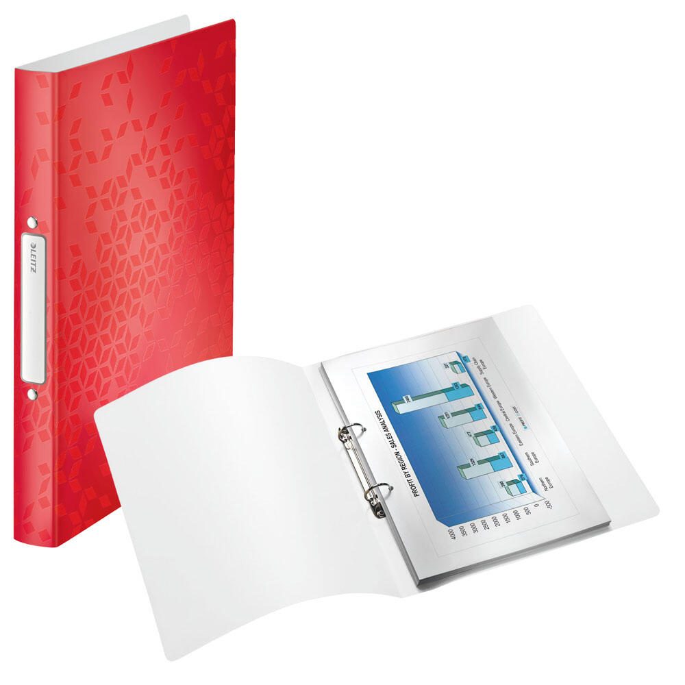 Das LEITZ Ringbuch 2-Ringe DIN A4 in einem auffälligen Rot ist die ideale Lösung für die ordentliche Aufbewahrung deiner Dokumente und Unterlagen. Mit einer Rückenbreite von 3.2 cm bietet es ausreichend Platz für bis zu 190 Blatt Papier im Format DIN A4 (80 g/m²). Dieses praktische Ringbuch ist aus hochwertigem Kunststoff gefertigt, was ihm nicht nur eine ansprechende Optik verleiht, sondern auch für Langlebigkeit sorgt. Die 2-Ring-Mechanik ermöglicht ein einfaches Einheften und Herausnehmen von Blättern, sodass du deine Unterlagen jederzeit flexibel anpassen kannst. Das Design der Serie WOW von LEITZ verbindet Funktionalität mit einem modernen Look, der in jedem Büro oder Zuhause einen stilvollen Akzent setzt. Die Oberfläche des Ringbuchs besteht aus einer Kombination von Papier und Polypropylen (PP), was für eine angenehme Haptik sorgt und gleichzeitig die Strapazierfähigkeit erhöht. Obwohl das Ringbuch keine Innentasche oder spezielle Einlegeformate bietet, überzeugt es durch seine schlichte Eleganz und Benutzerfreundlichkeit. Mit dem LEITZ Ringbuch 2-Ringe in Rot hast du nicht nur ein praktisches Hilfsmittel zur Hand, sondern auch ein stilvolles Accessoire, das Ordnung und Struktur in deinen Arbeitsalltag bringt. Ob für die Schule, das Studium oder das Büro – dieses Ringbuch ist ein unverzichtbarer Begleiter, der dir hilft, deine Dokumente sicher und übersichtlich zu verwalten.Technische Daten