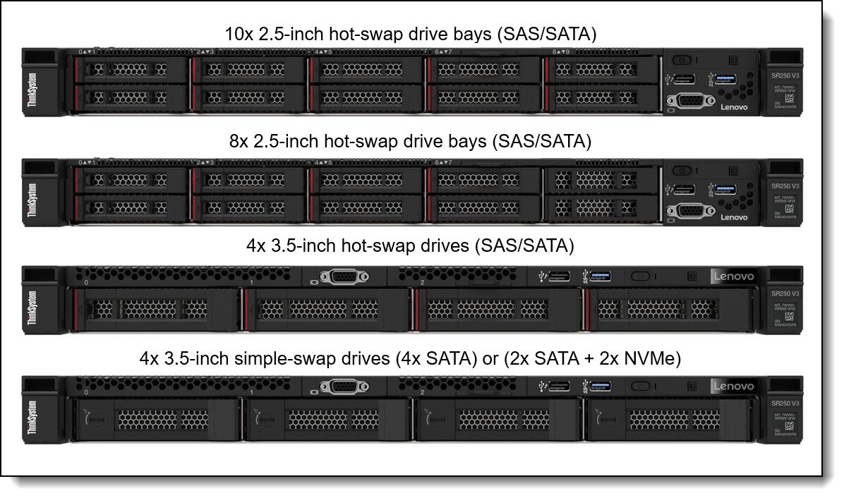 - Flexible und skalierbare interne Speicheroptionen im 1U Rack-Format mit bis zu 10x 2,5-Zoll Festplatten für performance-optimierte Konfigurationen oder bis zu 4x 3,5-Zoll Festplatten für kapazitätsoptimierte Konfigurationen