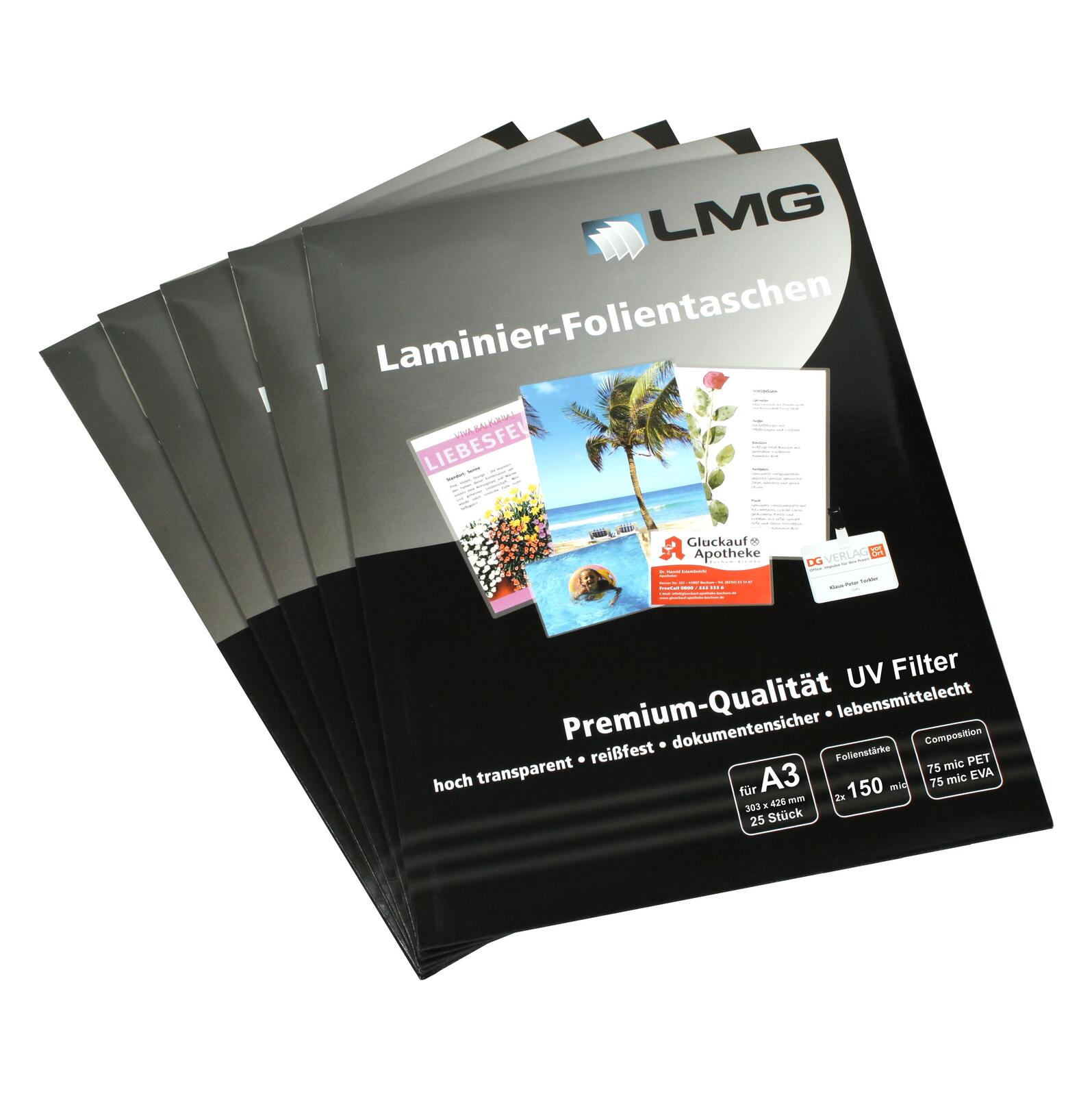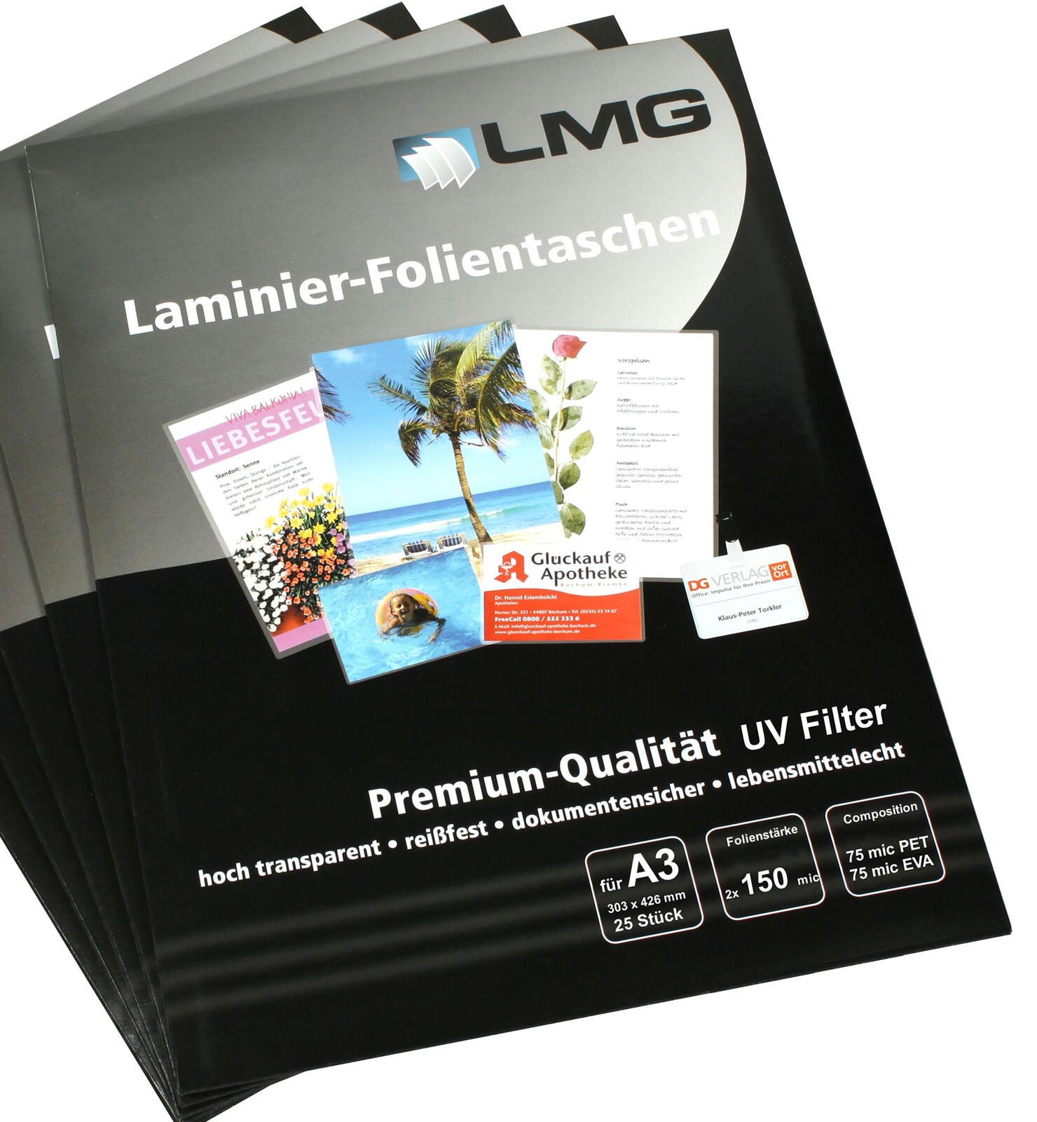 Die LMG Laminierfolien glänzend mit einer Stärke von 150 Mikron sind die ideale Wahl für alle, die ihre Dokumente, Fotos und Präsentationen professionell schützen und aufwerten möchten. Mit einem Format von A3 bieten diese Folien ausreichend Platz für deine wertvollen Unterlagen und sorgen dafür, dass sie in einem perfekten Zustand bleiben. Jede Packung enthält 25 Laminierfolien, sodass du genügend Vorrat hast, um all deine Projekte zu realisieren. Die glänzende Oberfläche der Folien verleiht deinen Laminierungen einen ansprechenden Glanz, der die Farben lebendig zur Geltung bringt und für eine professionelle Optik sorgt. Ob für den Einsatz im Büro, in der Schule oder für kreative Bastelprojekte zu Hause – die LMG Laminierfolien sind vielseitig einsetzbar und bieten optimalen Schutz vor Feuchtigkeit, Schmutz und Abnutzung. Hergestellt aus hochwertigem Polyester und Polyethylen (PET mind. 60%), überzeugen die Laminierfolien nicht nur durch ihre Stabilität, sondern auch durch ihre Umweltfreundlichkeit. Die abgerundeten Ecken der Folien verhindern ein Abblättern und sorgen für eine sichere Handhabung. Zudem sind sie einfach zu verwenden und bieten eine klare Sicht auf deine Dokumente, ohne dass die Lesbarkeit beeinträchtigt wird. Die LMG Laminierfolien glänzend sind die perfekte Lösung, um deine wichtigen Unterlagen zu schützen und ihnen gleichzeitig einen professionellen Look zu verleihen. Egal, ob du Präsentationen, Zertifikate oder persönliche Erinnerungen laminieren möchtest, diese Folien bieten dir die Qualität und den Schutz, den du benötigst. Mit den LMG Laminierfolien kannst du sicher sein, dass deine Dokumente immer in bestem Zustand bleiben.Technische Daten