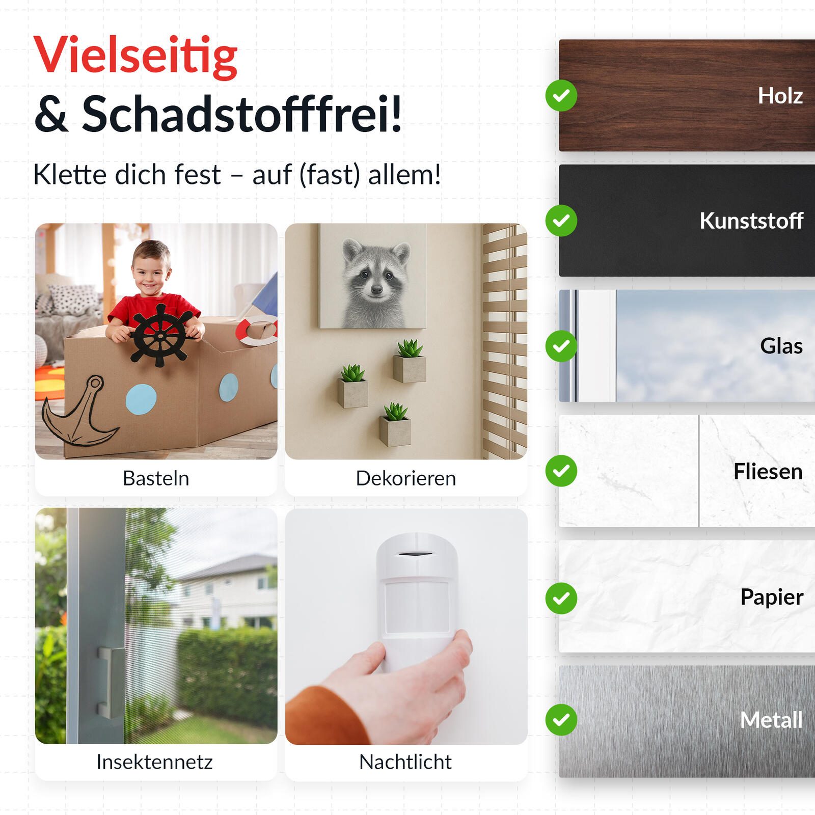- Oberflächen-schonend: Entfernbar ohne Rückstände oder Beschädigungen zu hinterlassen
