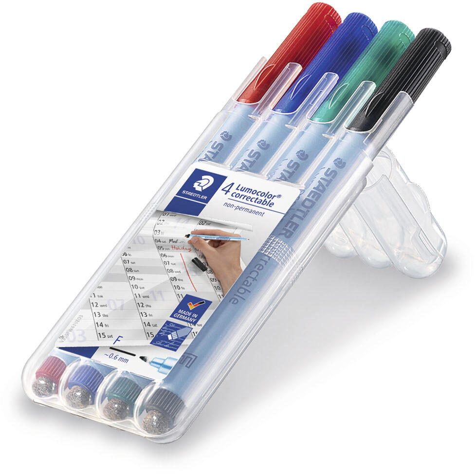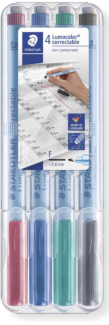 Die STAEDTLER Lumocolor F Folienstifte 0.6 sind die perfekte Wahl für kreative Köpfe, die auf der Suche nach hochwertigen Stiften für glatte Folienoberflächen sind. Mit ihrer feinen Rundspitze von 0.6 mm ermöglichen sie präzise und klare Striche, die sowohl im Alltag als auch im professionellen Umfeld überzeugen. Diese Folienstifte sind in vier lebendigen Farben erhältlich: rot, blau, grün und braun, was dir eine breite Palette an Möglichkeiten für deine Projekte bietet. Ein herausragendes Merkmal der Lumocolor F Serie ist ihre geruchsarme Formel, die ein angenehmes Schreibgefühl gewährleistet. Die Stifte sind nicht nur nachfüllbar, sondern auch mit einer praktischen Schutzkappe ausgestattet, die die Spitze vor dem Austrocknen schützt. Zudem sind sie lichtbeständig, sodass deine Arbeiten auch bei direkter Sonneneinstrahlung nicht verblassen. Der integrierte Wischer am Stiftende ermöglicht es dir, Korrekturen einfach und schnell vorzunehmen, ohne die Oberfläche zu beschädigen. Diese Folienstifte sind speziell für Schreibfolien und andere glatte Folienoberflächen wie Sichthüllen und Laminat geeignet, was sie zu einem unverzichtbaren Werkzeug für Präsentationen und kreative Arbeiten macht. Dank ihrer Airplane-safe Eigenschaften kannst du sie bedenkenlos auf Reisen mitnehmen, ohne dir Sorgen um Sicherheitskontrollen machen zu müssen. Der runde Griff sorgt für eine angenehme Handhabung, während der Kunststoff-Clip dafür sorgt, dass du die Stifte bequem an Notizblöcken oder Taschen befestigen kannst. In einer Packung sind vier Stifte enthalten, die dir eine umfassende Farbauswahl bieten, um deine Ideen zum Leben zu erwecken. Die STAEDTLER Lumocolor F Folienstifte sind die ideale Wahl für alle, die Wert auf Qualität und Vielseitigkeit legen.Technische Daten