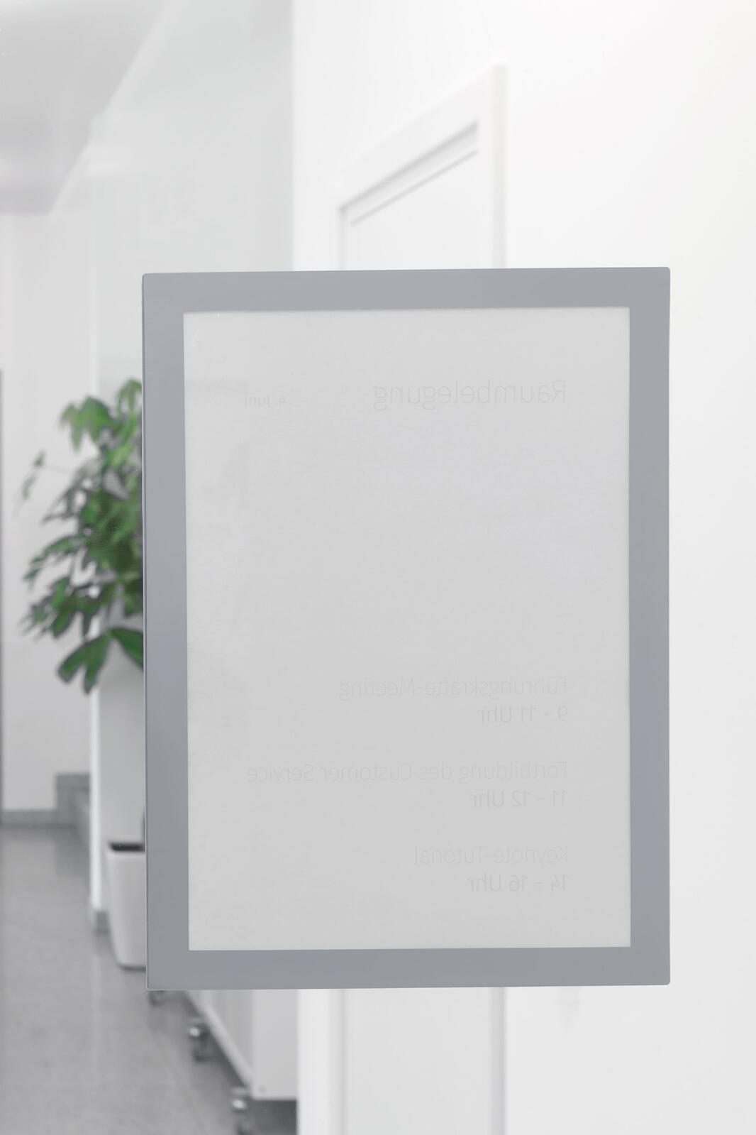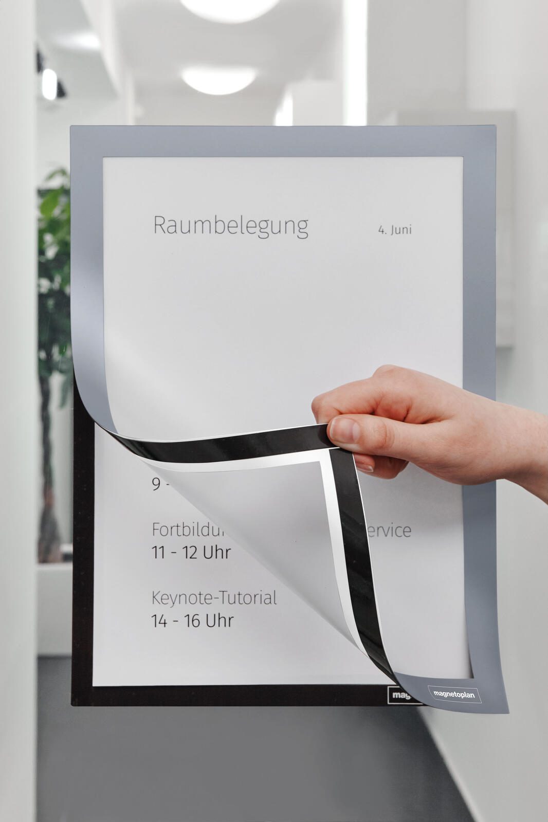 Der magnetoplan Magnetrahmen selbstklebend in A4 grau ist die perfekte Lösung, um deine Dokumente, Bilder oder Fotos stilvoll und sicher zu präsentieren. Mit seinem eleganten grauen Farbton fügt sich dieser Rahmen nahtlos in jede Umgebung ein und verleiht deinen Inhalten einen professionellen Look. Die Öffnung des Rahmens ist durchdacht gestaltet, sodass du deine Materialien bequem von oben, unten und seitlich einfügen kannst. Dies ermöglicht nicht nur eine einfache Handhabung, sondern sorgt auch dafür, dass du deine Inhalte jederzeit schnell wechseln kannst, ohne den Rahmen abnehmen zu müssen. Dieser praktische Magnetrahmen ist ideal geeignet für Dokumente und Bilder im A4 Format, was ihn zu einem vielseitigen Begleiter für Büro, Schule oder Zuhause macht. Hergestellt aus hochwertigem Polypropylen (PP) bietet der magnetoplan Magnetrahmen eine hohe Langlebigkeit und Stabilität. Das Material ist nicht nur robust, sondern auch selbstklebend, was die Montage an verschiedenen Oberflächen erleichtert. Du kannst den Rahmen ganz nach deinen Wünschen anbringen, sei es an Wänden, Schreibtischen oder anderen glatten Flächen. In jedem Pack sind zwei Stück enthalten, sodass du gleich mehrere Dokumente oder Bilder gleichzeitig präsentieren kannst. Ob für persönliche Erinnerungen, wichtige Informationen oder kreative Projekte – der magnetoplan Magnetrahmen selbstklebend ist die ideale Wahl, um deine Inhalte ansprechend zur Schau zu stellen. Vertraue auf die Qualität von magnetoplan und genieße die Vorteile eines durchdachten Designs, das Funktionalität und Ästhetik vereint.Technische Daten