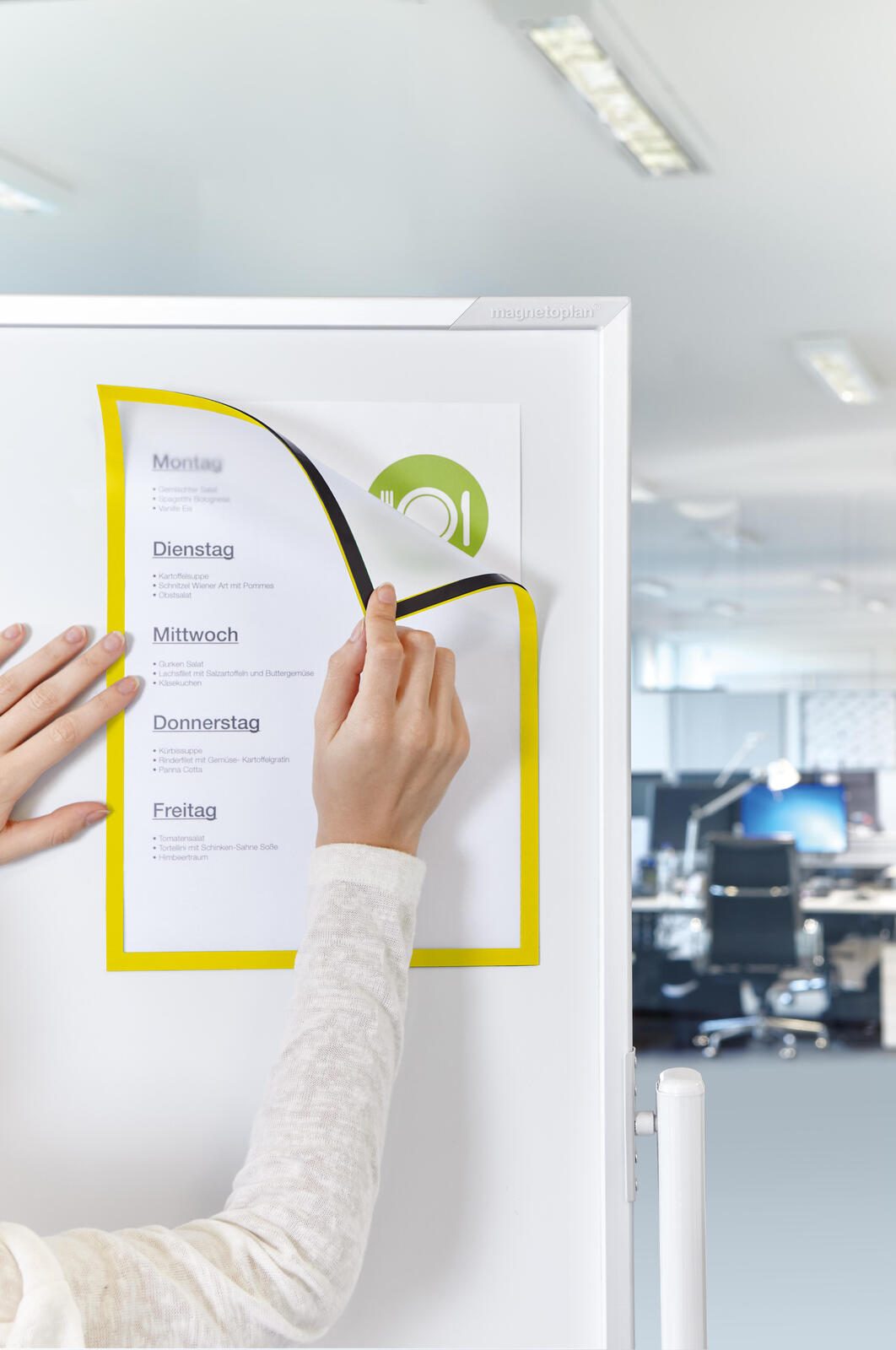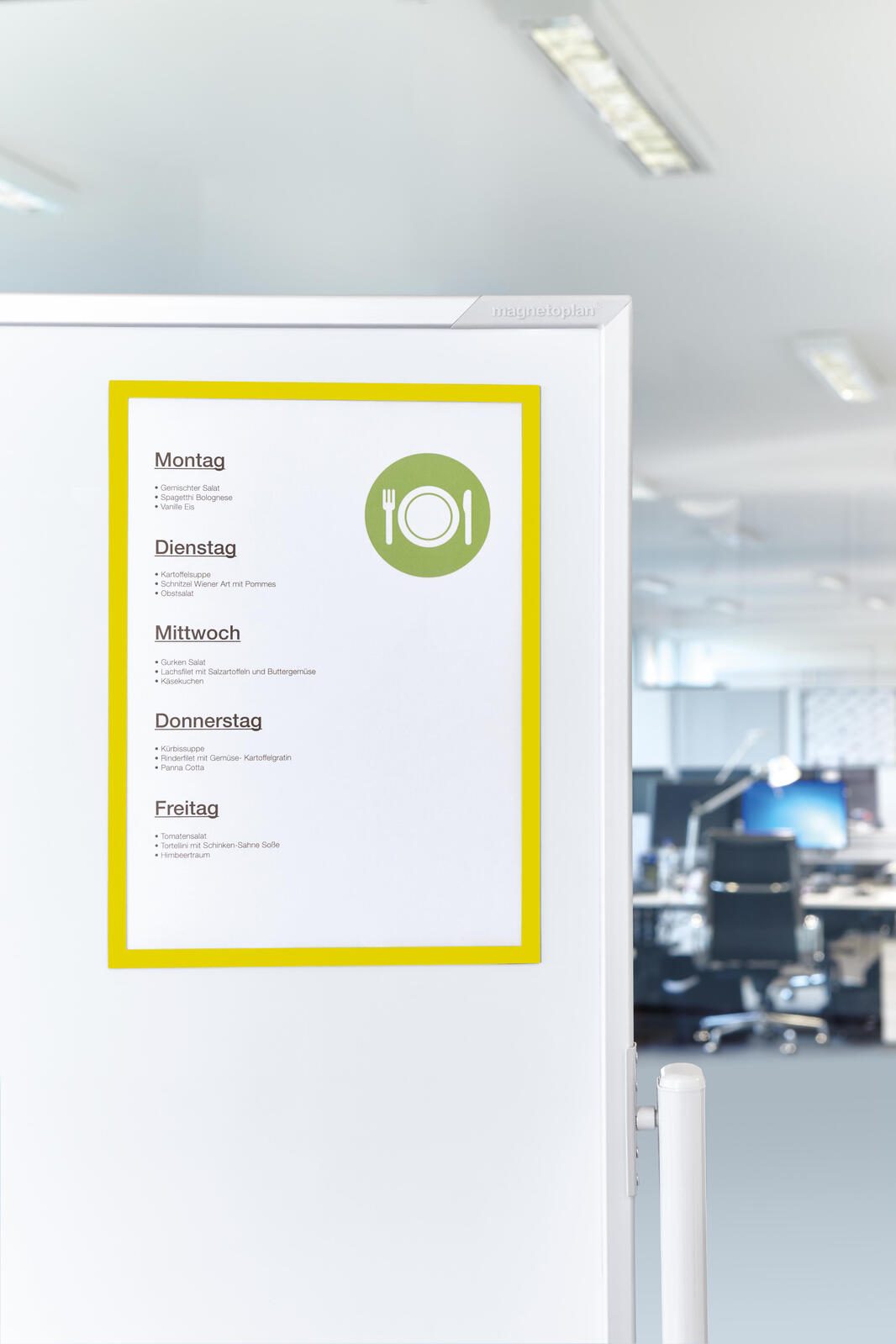 Der magnetoplan Magnetrahmen in der Farbe Gelb ist speziell für Dokumente, Bilder oder Fotos im Format A4 konzipiert. Er besteht aus robustem PVC-Material, das für eine langlebige Nutzung sorgt und gleichzeitig eine klare Sicht auf die eingefügten Inhalte ermöglicht. Die praktische Öffnung befindet sich sowohl oben als auch seitlich, was das Einlegen und Austauschen der Dokumente erleichtert.