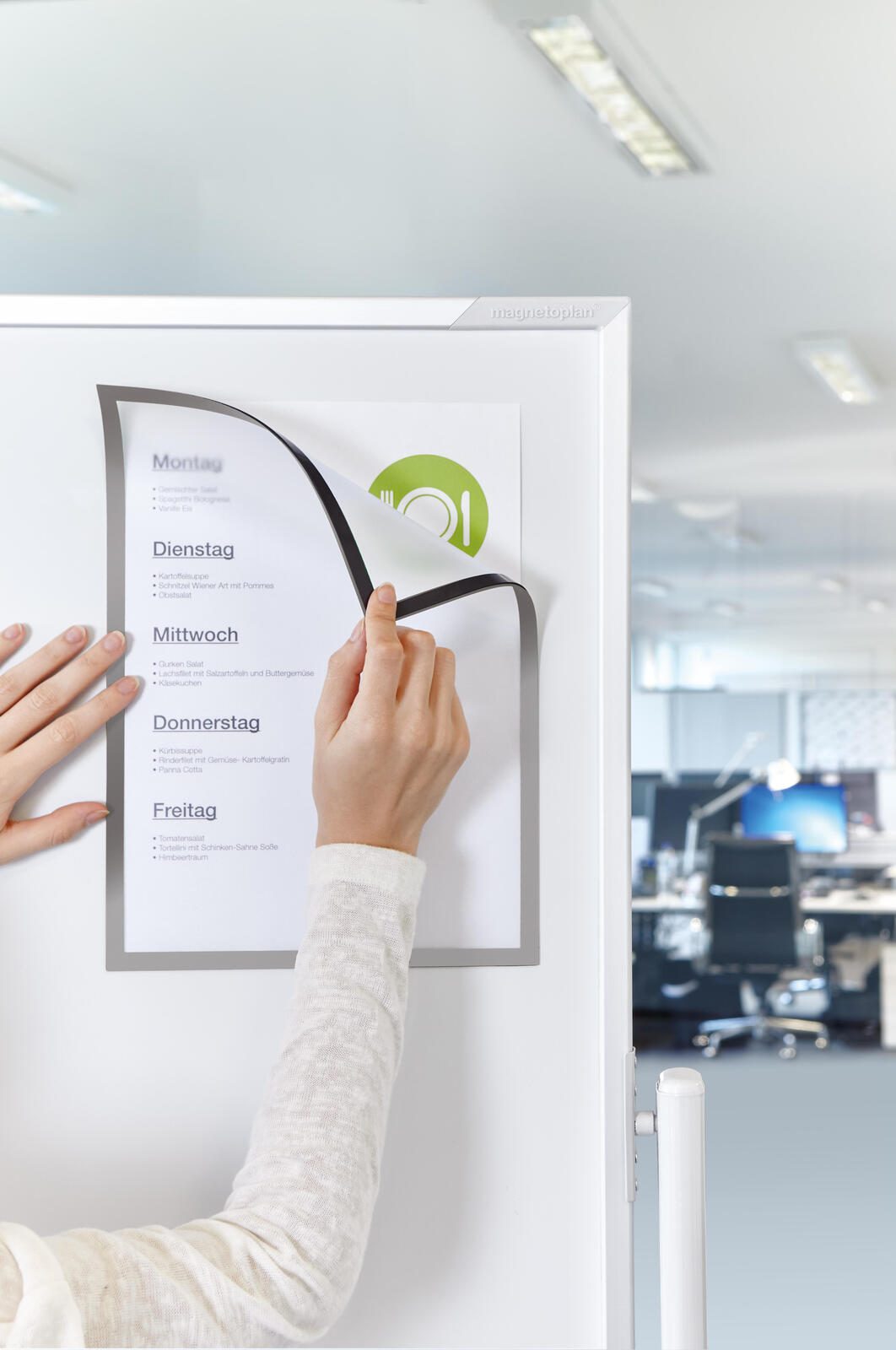Der magnetoplan Magnetrahmen in der Farbe Silber ist speziell für Dokumente, Bilder oder Fotos im Format A4 konzipiert. Er besteht aus robustem PVC-Material, das für eine lange Haltbarkeit sorgt. Die Rückseite des Rahmens ist magnetisch, sodass er sich einfach und sicher an allen eisenhaltigen Flächen befestigen lässt, wie beispielsweise Whiteboards oder Stahlschränken.