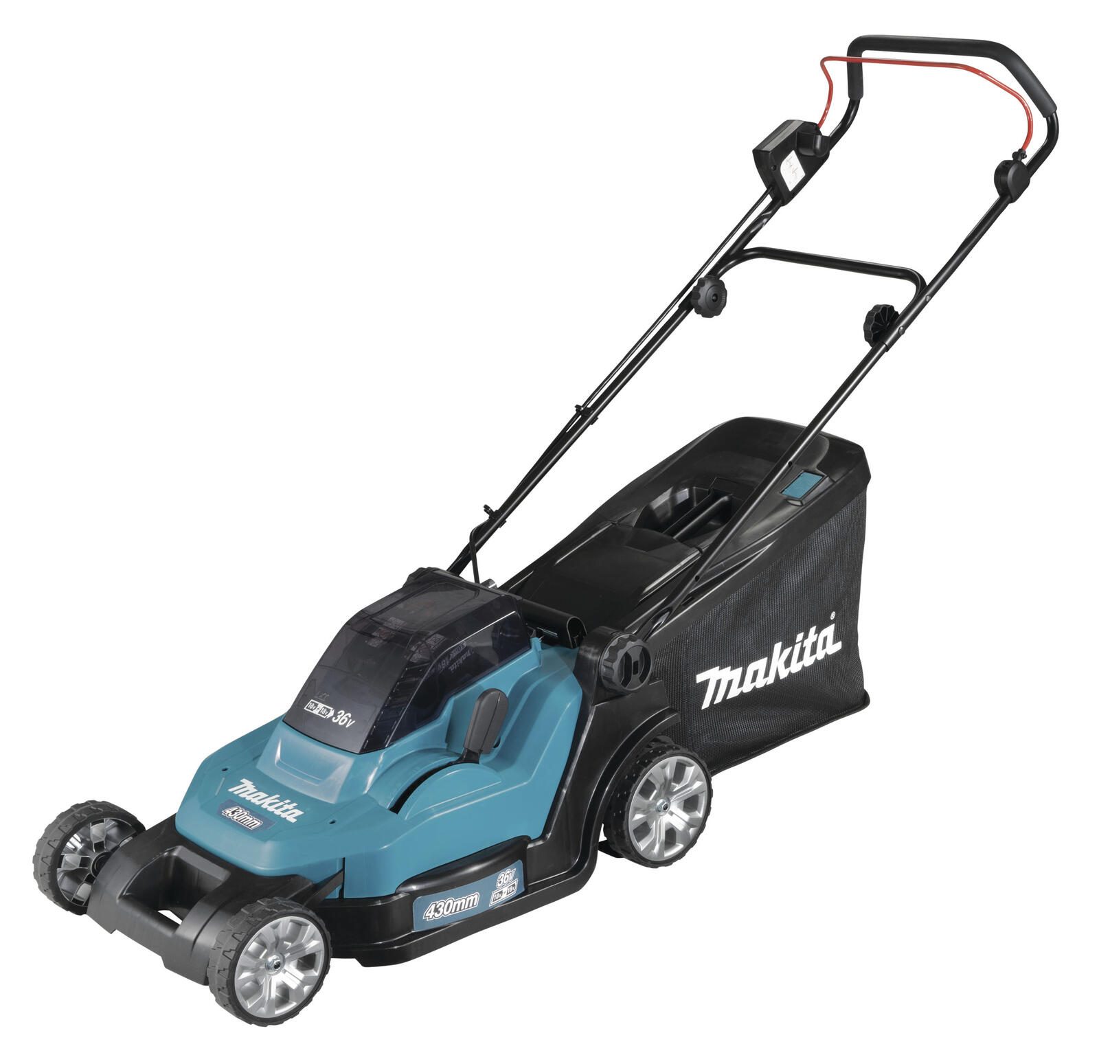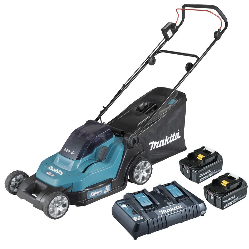 - Lieferung inkl.: 2x Akku BL1850B Li 18V 5,0 Ah, Doppel-Schnellladegerät DC18RD, Steckschlüssel SW17, Grasfangkorb , Sichelmesser