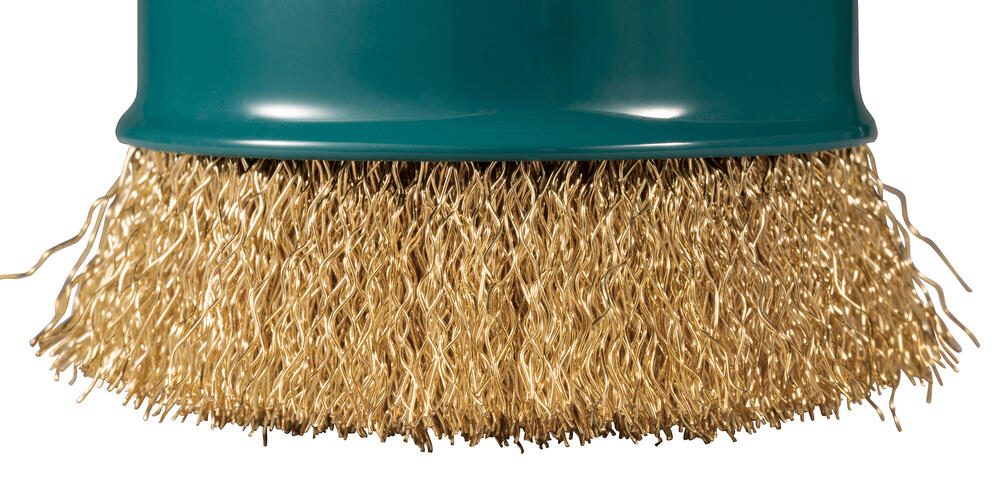 - Topfbürste mit gewellten 0,3 mm starken Drahtbürsten aus Messing. Geeignet für eine weichere Abtragsleistung und mittelstarken Bürstenwirkung auf flachen sowie unebenen Flächen.